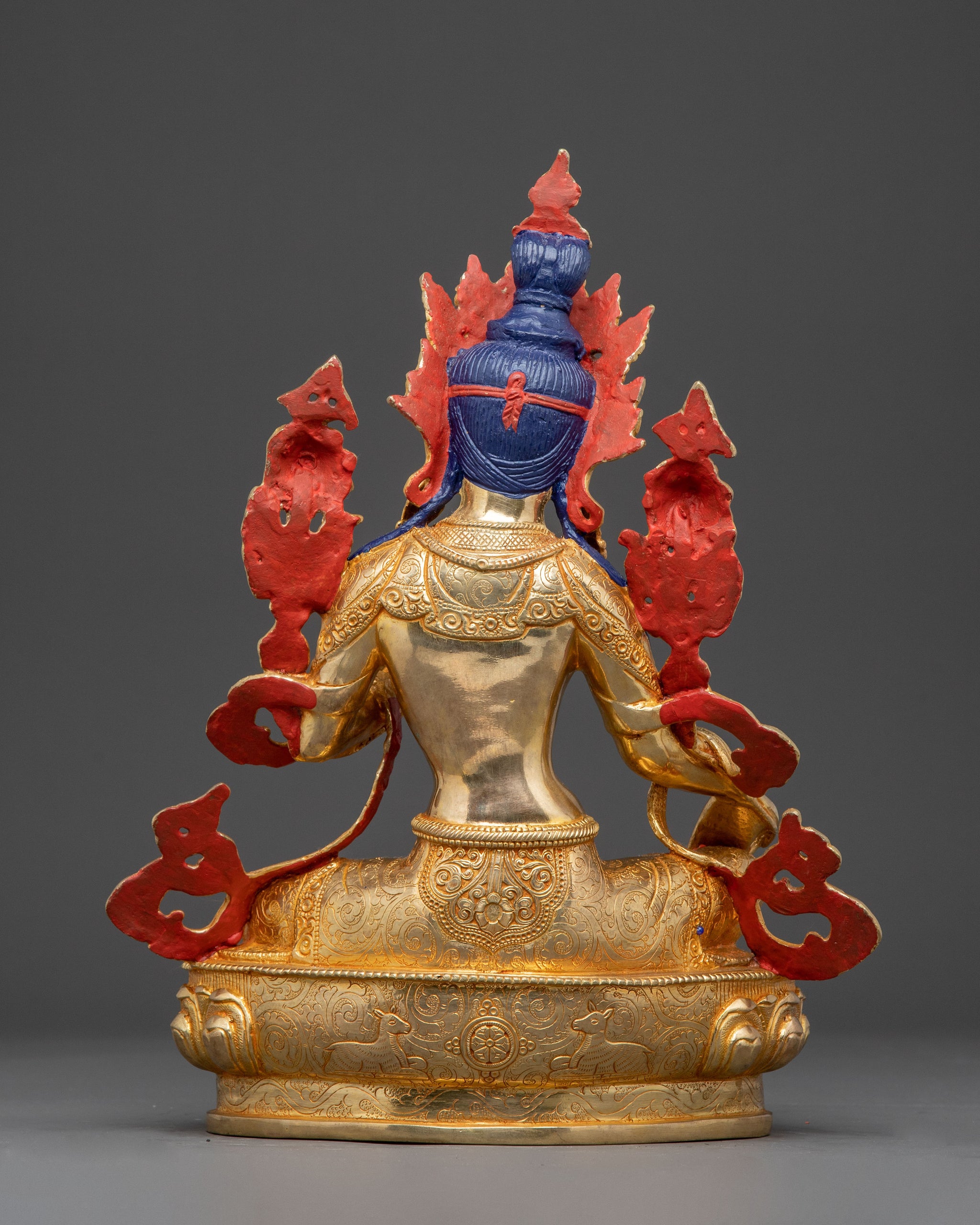 The handmade copper statue of Shyama Tara, also known as Green Tara, stands at 13.2”/33.5cm in height and 10.8”/27.5cm at the base, weighing 3.82 kg. Made from copper with 24K gold gilding, it features intricate gold and acrylic paintings. Expertly crafted by skilled artisans, this statue beautifully captures the compassionate essence of Green Tara, making it a meaningful addition to altars, meditation areas, or spiritual collections.