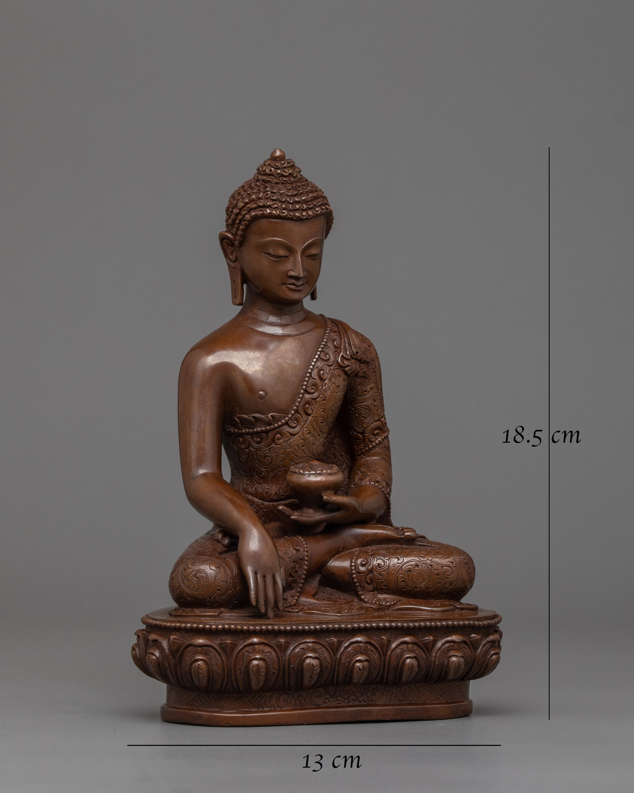 Shakyamuni Buddha is depicted sitting in the lotus pose (padmasana), indicating his steady concentration and mastery over the distractions of the material world. His right hand stretched toward the earth in bhumisparsha mudra, represents his moment of enlightenment, inviting the earth to witness his waking. The left hand, lying gently in his lap in dhyana mudra holding an alms bowl depicts the profound state of meditation and mindfulness that leads to insight and clarity.