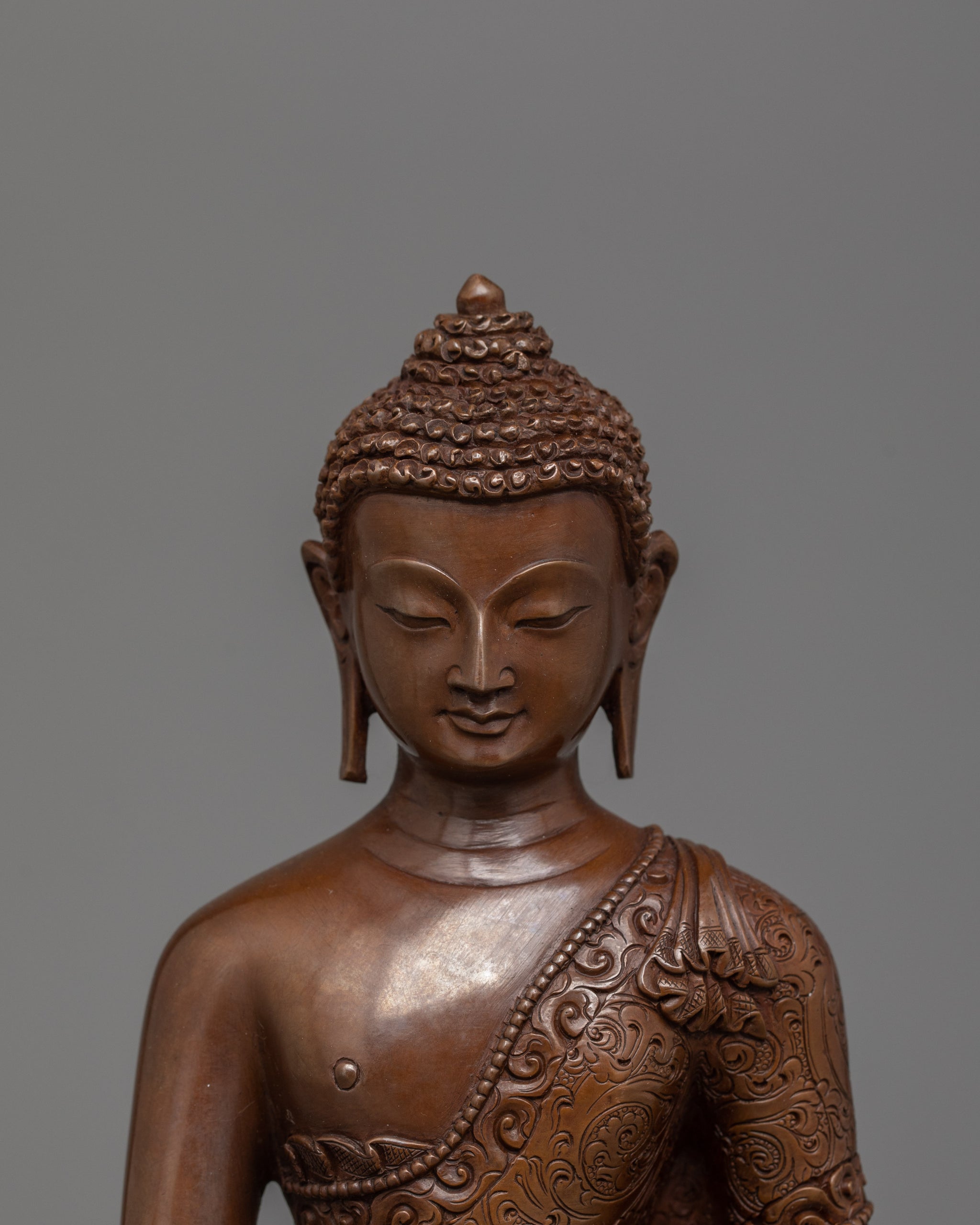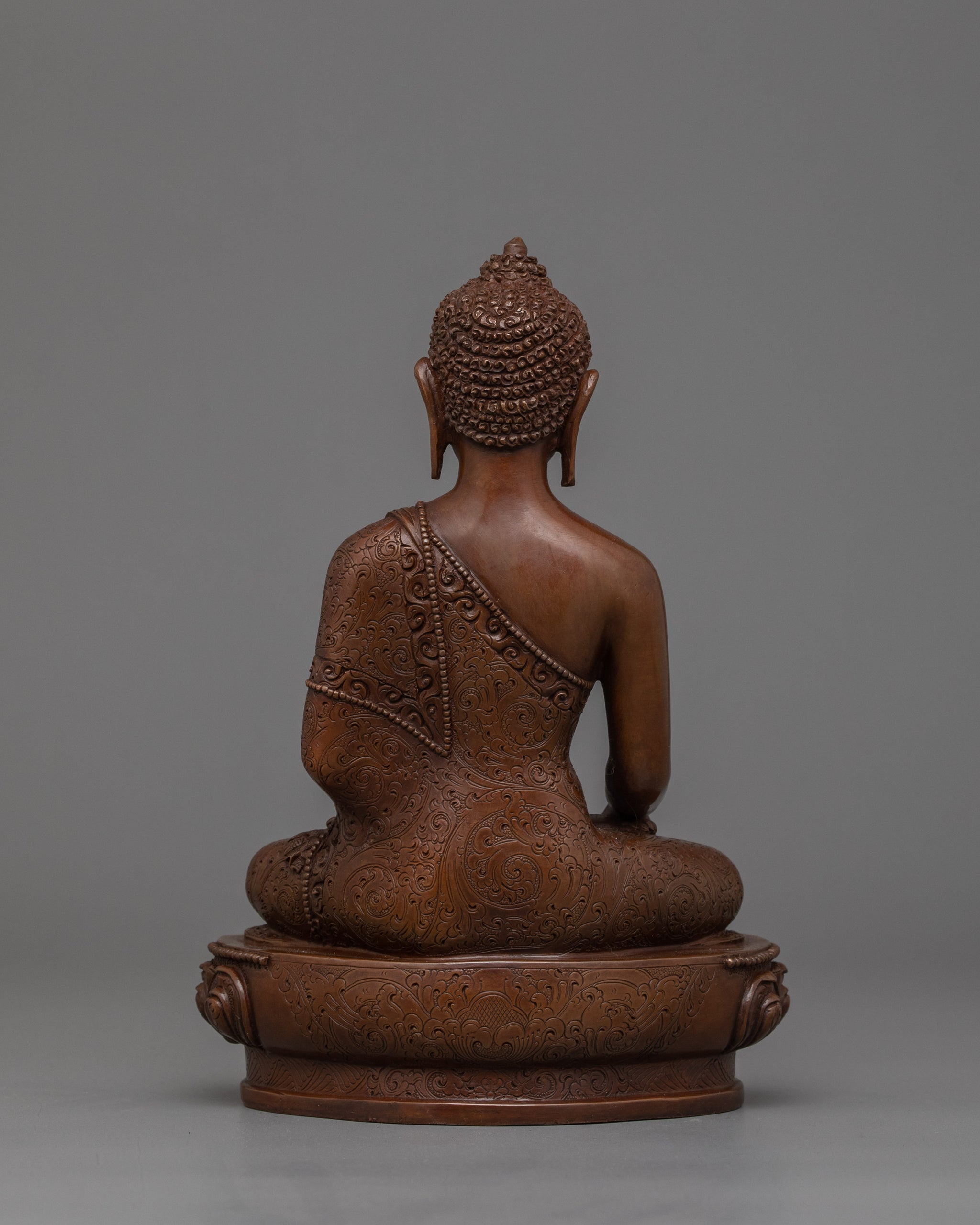 Handmade Dharma Teacher Shakyamuni Buddha symbolizes the Buddha's deep teachings and the path to spiritual awakening. This handcrafted statue is 7.3" (Height) x 5.1" (Base) and weighs 0.96 kg. It is made of oxidized copper. This sacred statue, created by expert Nepalese artisans, represents the craftsmanship of Himalayan Buddhism, making it an inspirational addition to altars, meditation places, or sacred collections.