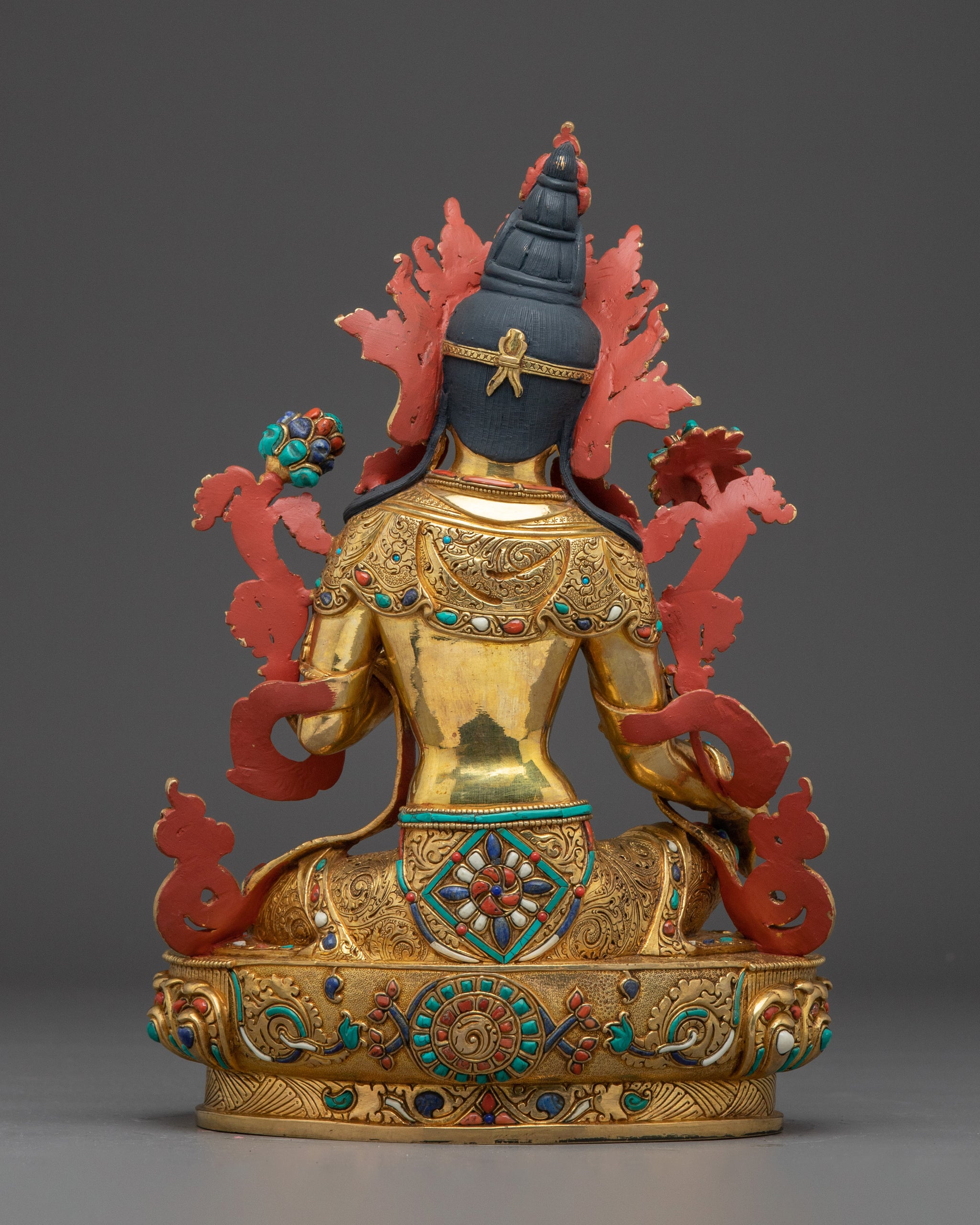 Vajrayogini is stunning. The details are amazing. It's easy to make out her facial expressions, skulls, feet, and the ring of fire around her. You can tell she's handmade. There is a consecration hole in her back.