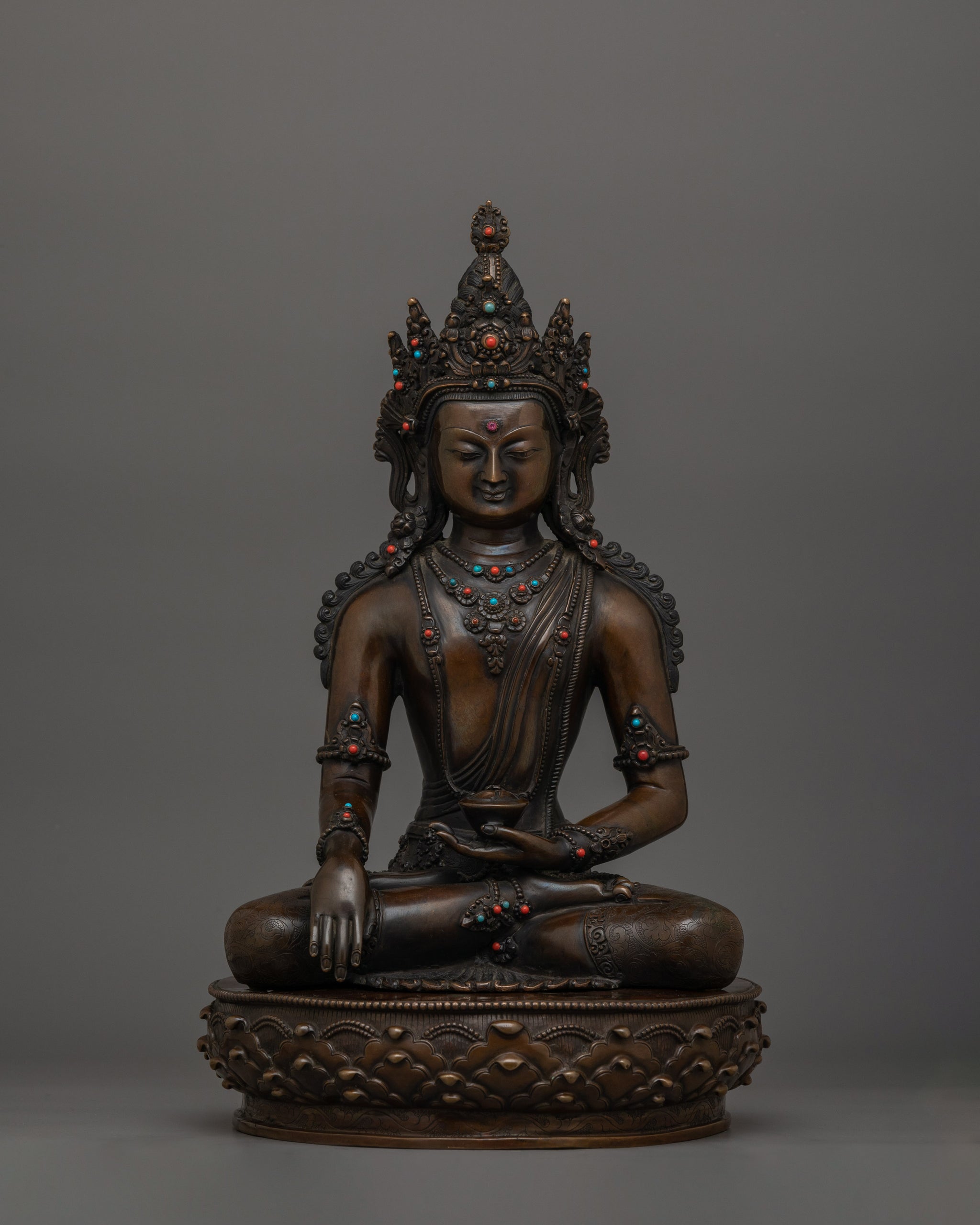 The Handmade Figurine of Buddha Shakyamuni with Crown stands at 14.2”/36 cm in height with an 8.7”/22 cm base and weighs 5.05 kg. This statue represents Buddha Shakyamuni, the historical Buddha, depicted wearing a crown symbolizing his spiritual royalty and supreme enlightenment. Made from oxidized copper, gemstones. Designed by talented Nepalese artisans, this detailed sculpture is ideal for altars, meditation areas, or as a meaningful decor item for individuals seeking awareness in their daily life.