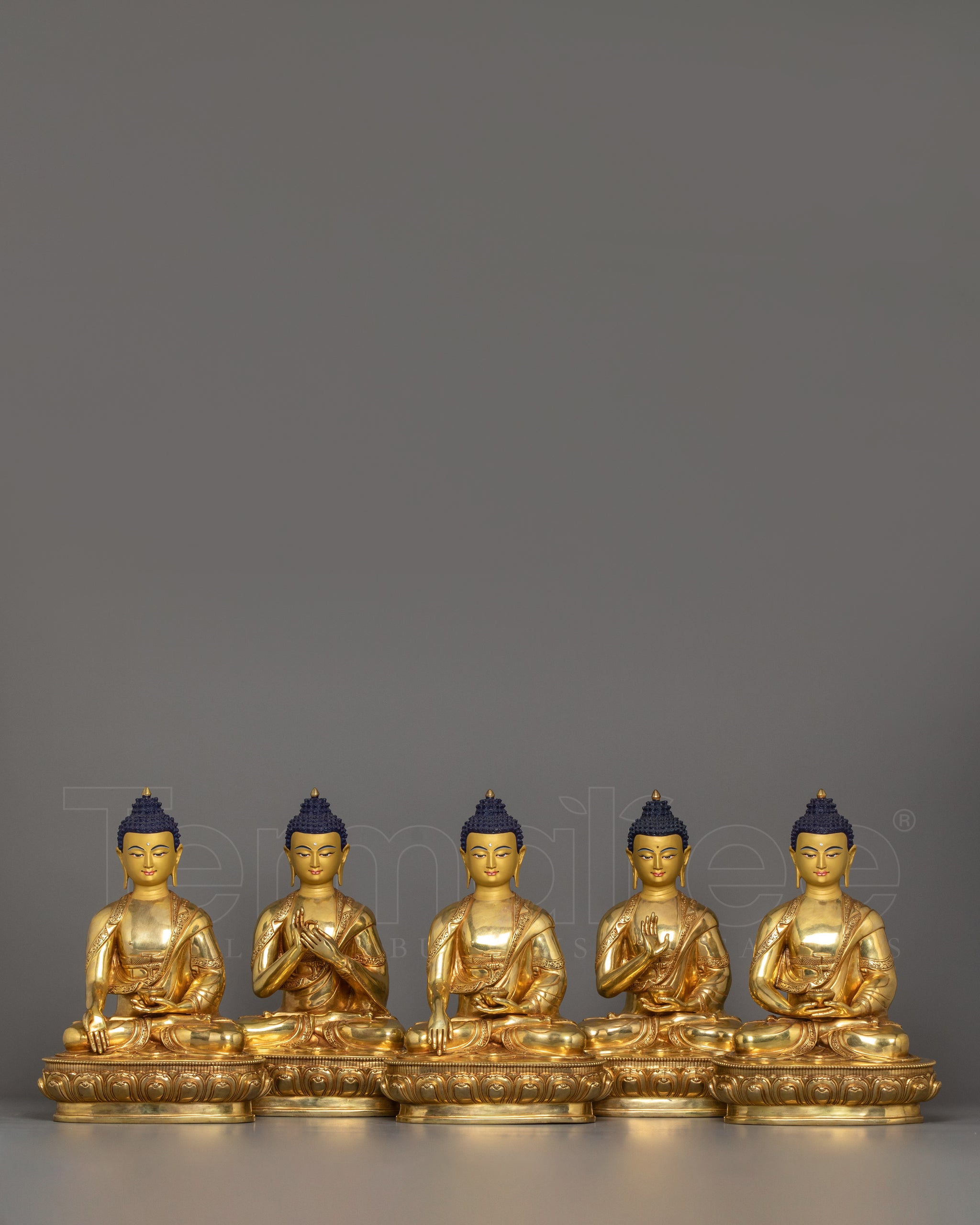 Handmade Five Buddha Set Sculpture, standing 13.4" (34cm) tall five dhyani buddha, with a base width of 9.4" (24cm) and a weight of 20.97 kg, this statue depicts the five Buddhas in tranquil and meditative poses. Each Buddha represents one of the five wisdoms in Tibetan Buddhism, making this statue a potent symbol of spiritual oneness and enlightenment. It is made of copper covered with triple layer 24K gold gilding and carved with deeply engraved carvings that produce a magnificent 3D-like effect. This sculptures, adorned with hand-carved gemstones, represents the spiritual creativity of Himalayan Buddhism, making it a powerful addition to altars, meditation places, or sacred collections.