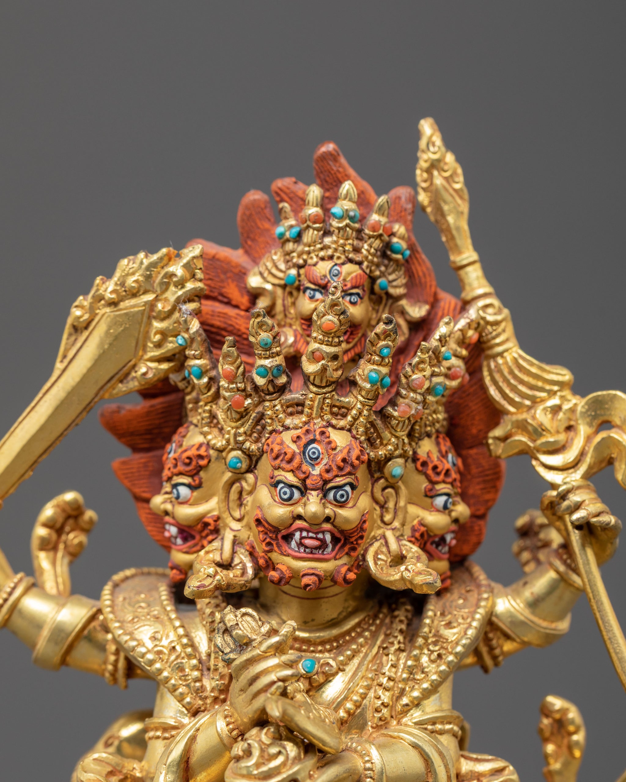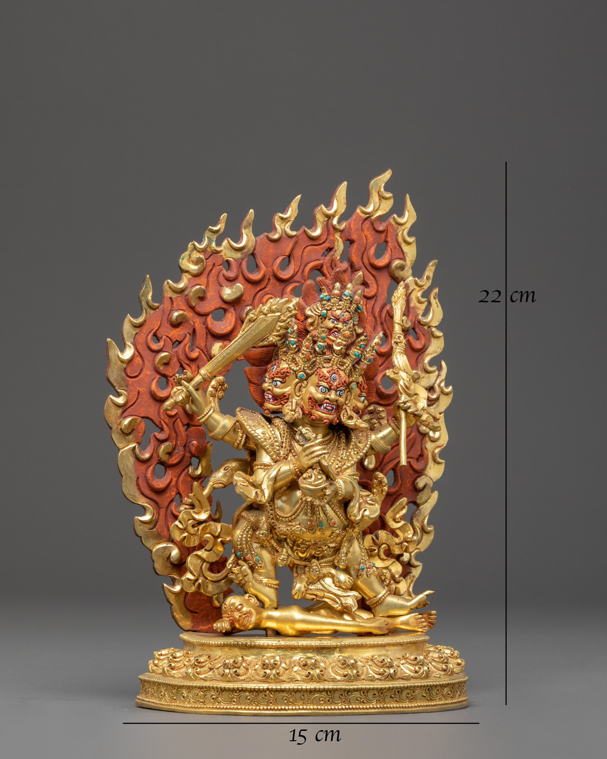 Handmade Four-Armed Mahakal Statue of Protection measures 8.7”/22cm in height and 5.9”/15cm at the base, weighing 1.68 kg. Expertly handcrafted from a copper body, it is adorned with 24K gold gilding, gemstones, and acrylic paintings that bring out its dynamic presence. Representing protection and spiritual strength, this statue is ideal for meditation spaces, personal altars, or as a powerful centerpiece in any sacred setting.