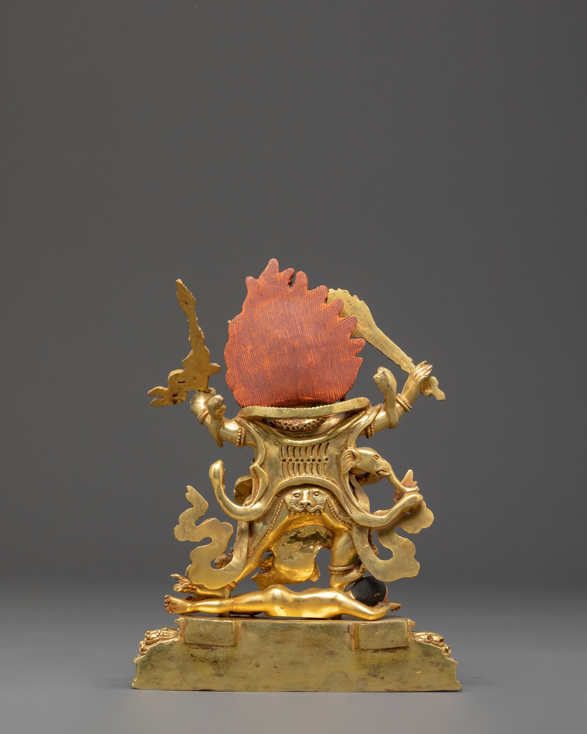 Mahakala, the Four-Armed Mahakala statue, embodies ferocious compassion and unwavering protection. His wrathful expression reflects his dedication to eliminating obstacles and guiding practitioners toward spiritual liberation. Seated in dynamic alidhasana, he symbolizes his readiness to act against negativity. In his right hands, he holds a sword, a staff, and a vajra, while his left hands carry a skull cup and a trident, all representing various tools to overcome ignorance and delusion. His crown features five skulls, signifying the transformation of the five poisons into wisdom. Encircled by a blazing halo, this statue conveys the purifying power of his fierce compassion as a powerful guardian in Vajrayana Buddhism.