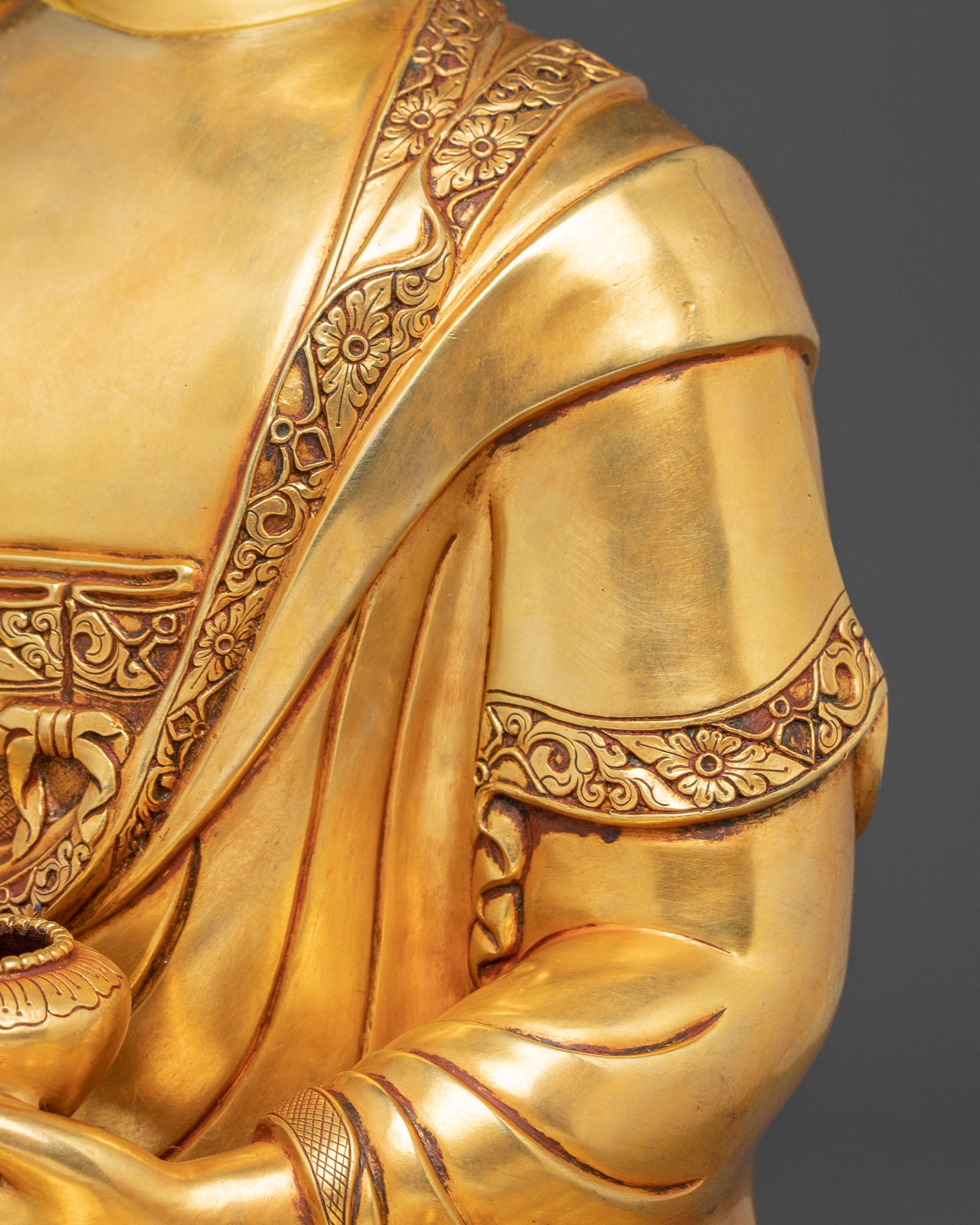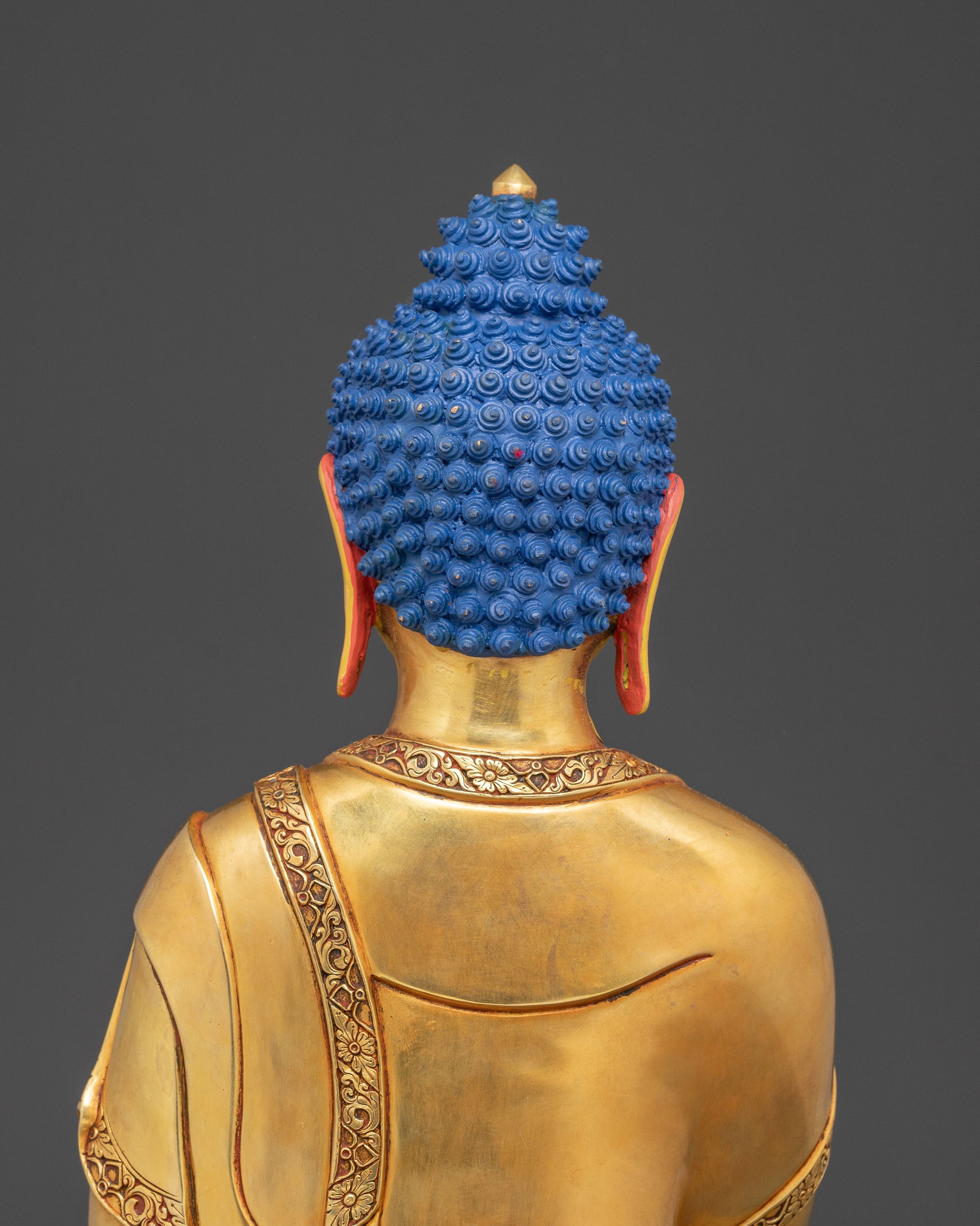 Shakyamuni Buddha is depicted sitting in the lotus pose (padmasana), indicating his steady concentration and mastery over the di and handcrafted by expert Nepalese artisans, elegantly symbolizes the sacred traditions of Himalayan Buddhism, making it an appropriate addition to altars, meditation spaces, holding an alms bowl,stractions of the material world. His right hand stretched toward the earth in bhumisparsha mudra, representing his moment of enlightenment, inviting the earth to witness his waking. The left hand, lying gently in his lap in dhyana mudra holding an alms bowl depicts the profound state of meditation and mindfulness that leads to insight and clarity.