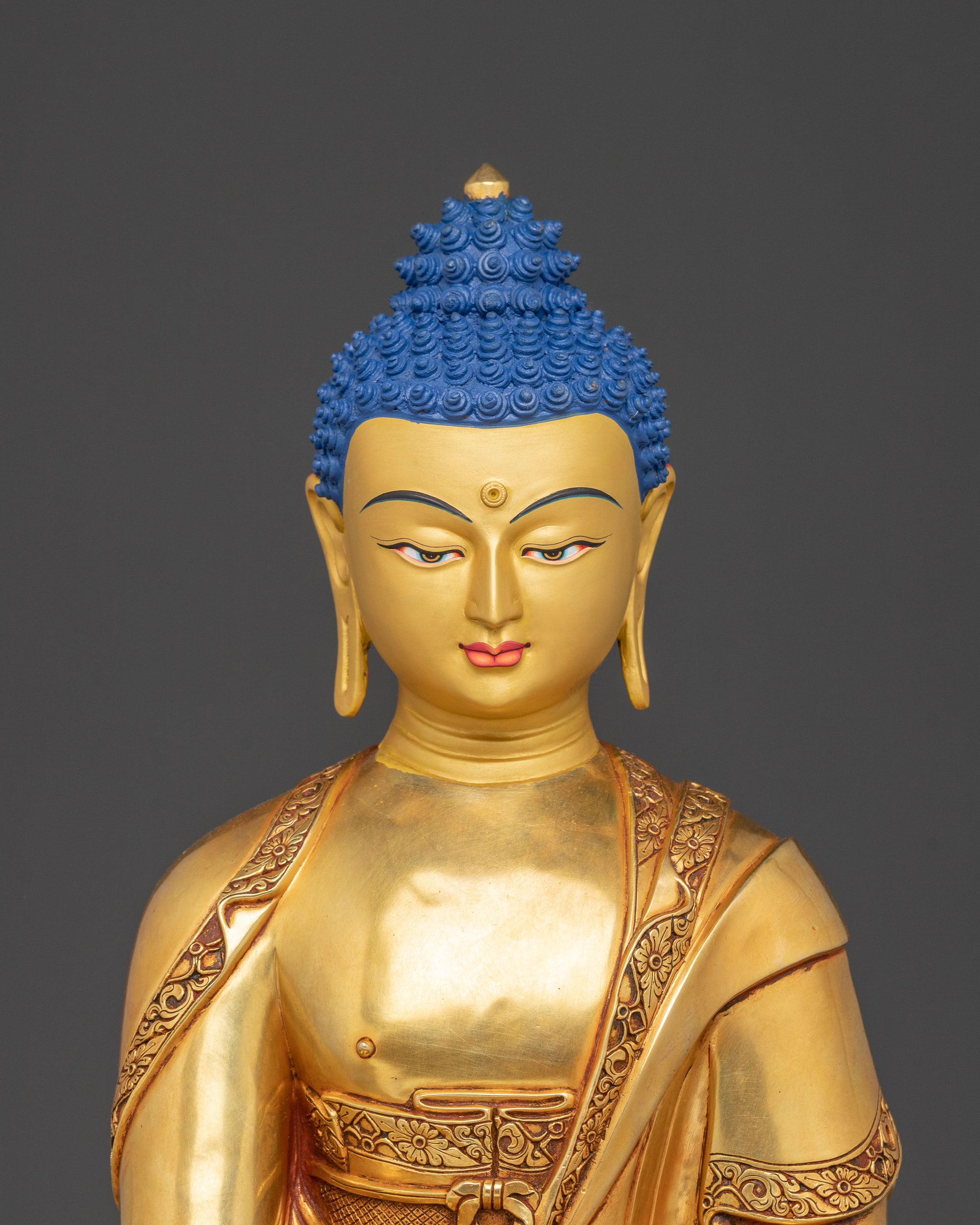 This Handmade Golden Shakyamuni Buddha Statue, also known as Gautama Buddha, measures 18.1”/46cm in height and 11.8”/30cm at the base, weighing 8.95 kg. Made from copper, covered with a triple layer of 24K gold gilding. This sculpture, adorned with gemstones, handcrafted by expert Nepalese artisans, elegantly symbolizes Himalayan Buddhism's sacred traditions, making it an appropriate addition to altars, meditation places, or sacred collections.