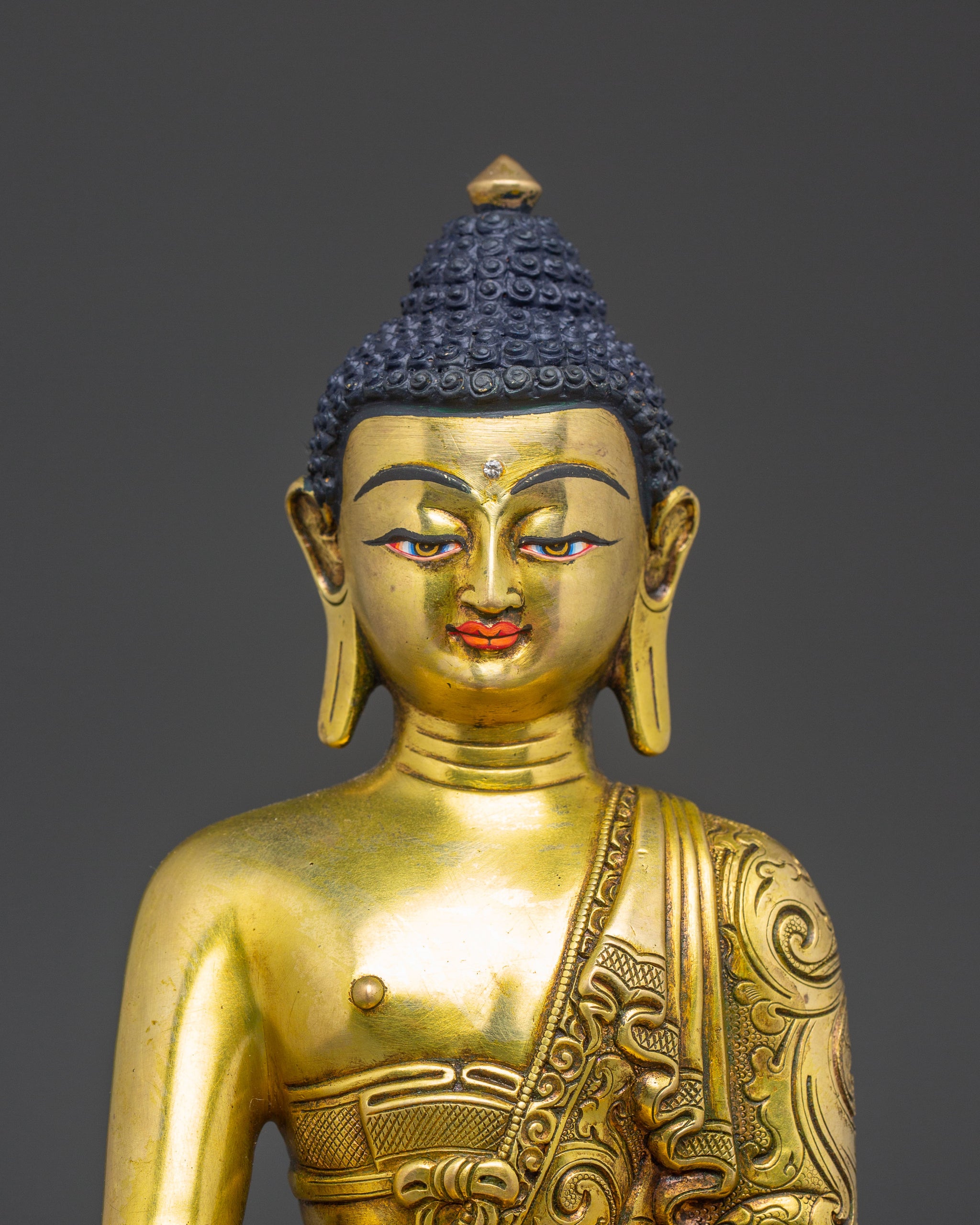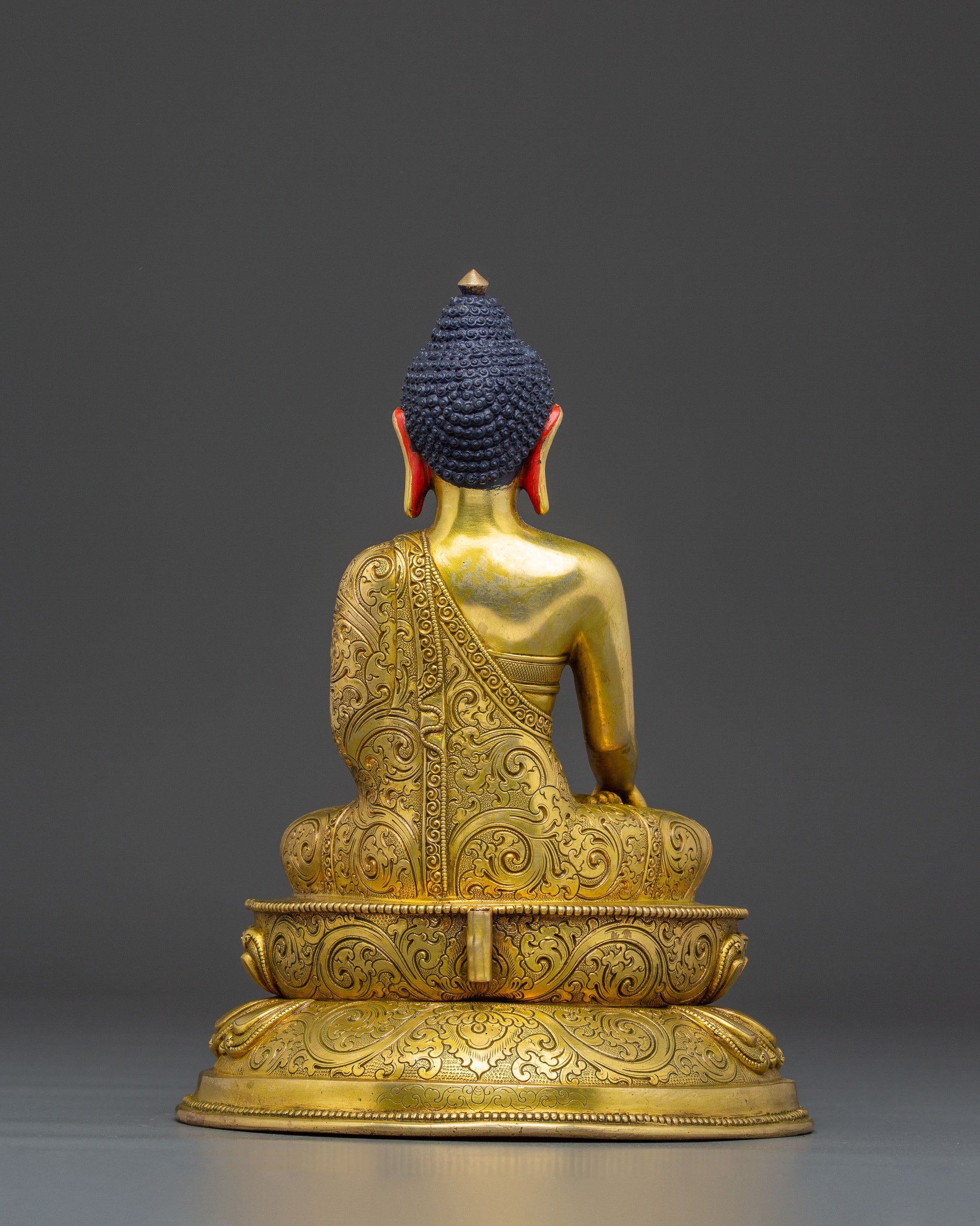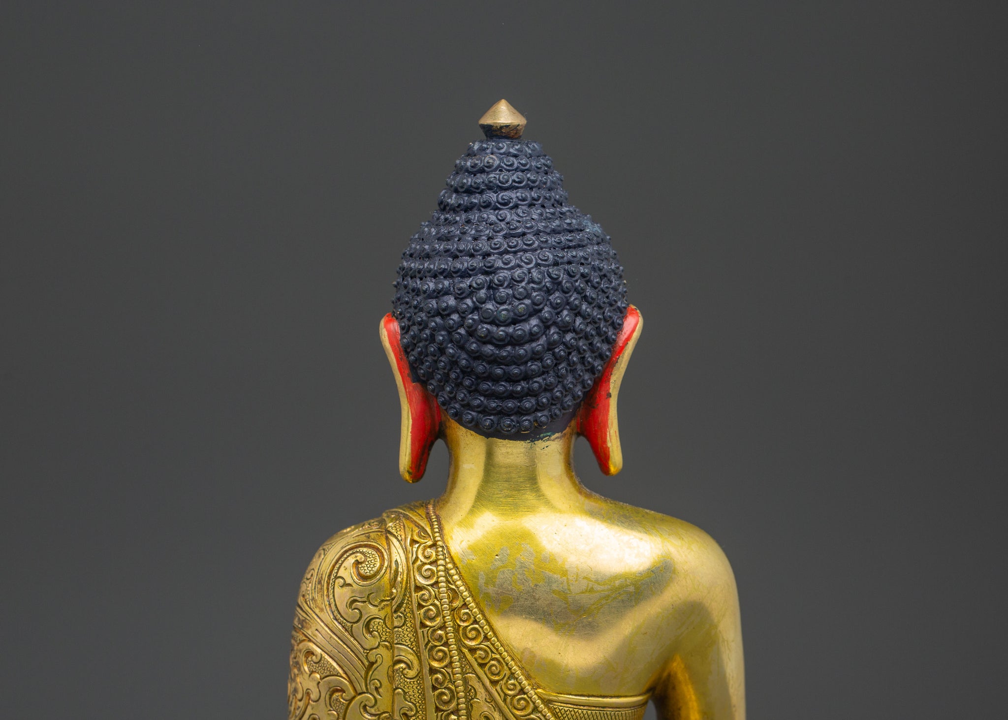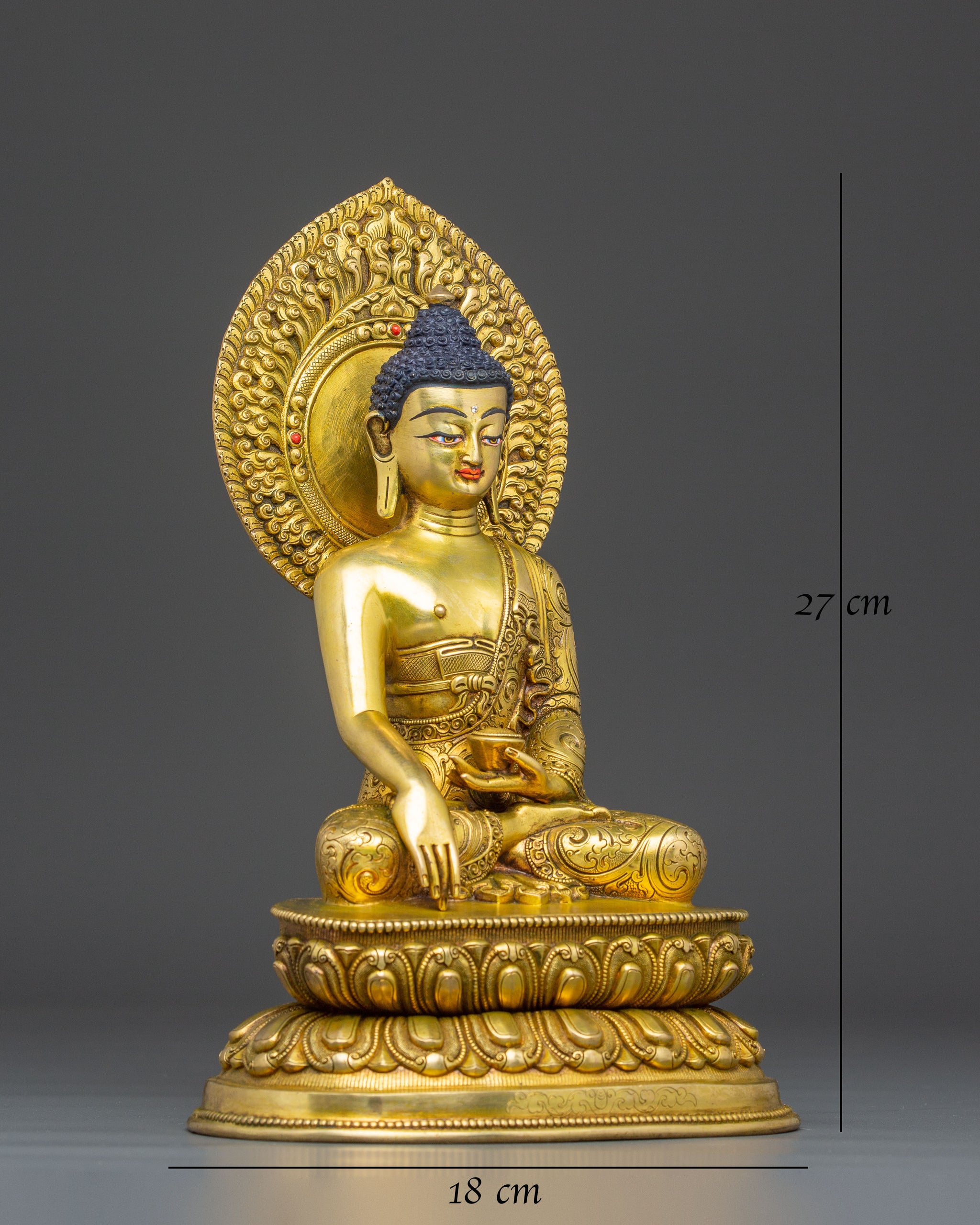 This handmade golden statue of Buddha Shakyamuni, also known as Gautama Buddha, measures 10.6”/27cm in height and 7.1”/18cm at the base, weighing 2.17 kg. Made from copper with 24K gold gilding and acrylic paintings, it reflects traditional craftsmanship. Expertly handcrafted by skilled Nepali artisans, it makes a refined addition to altars, meditation areas, or spiritual collections.