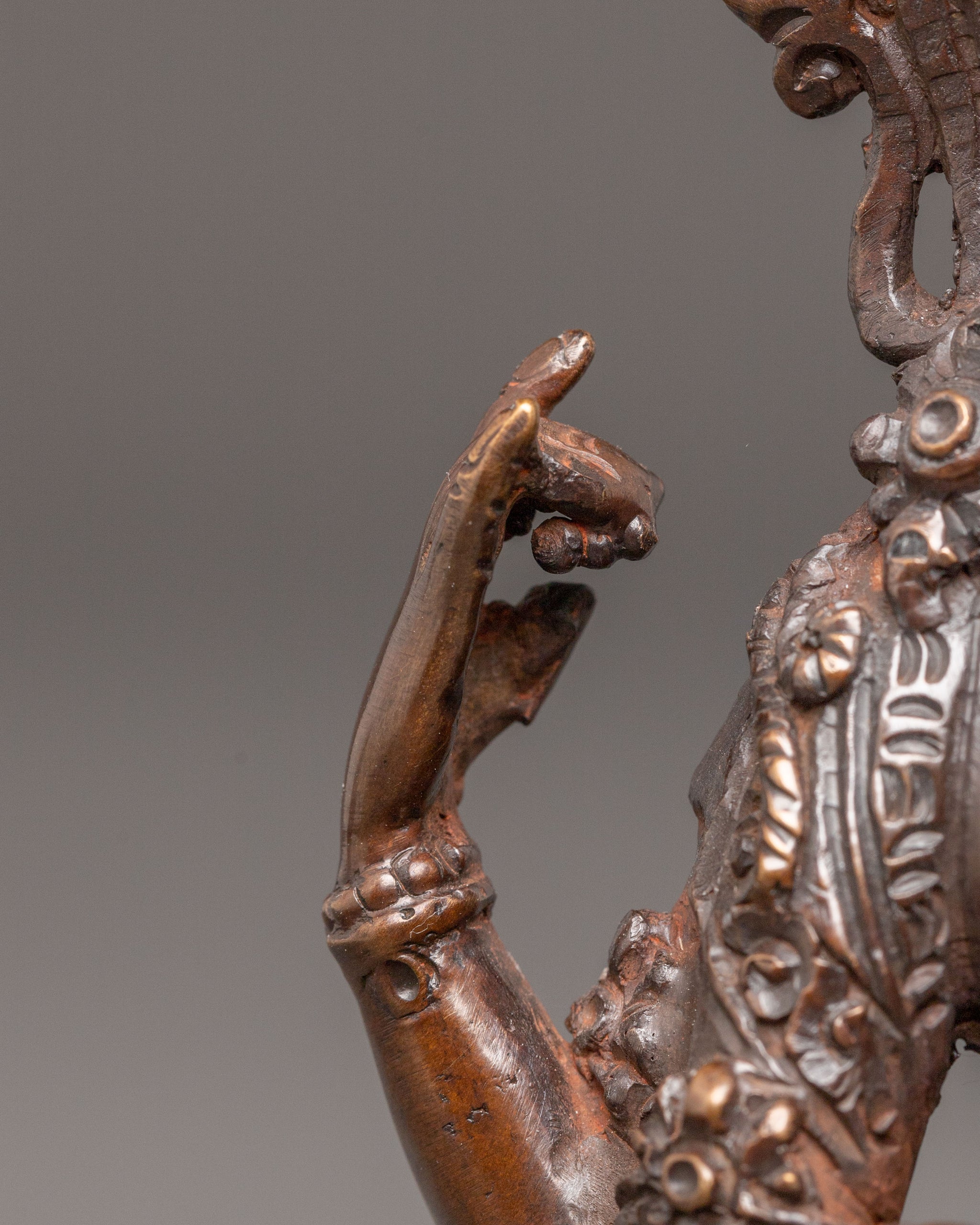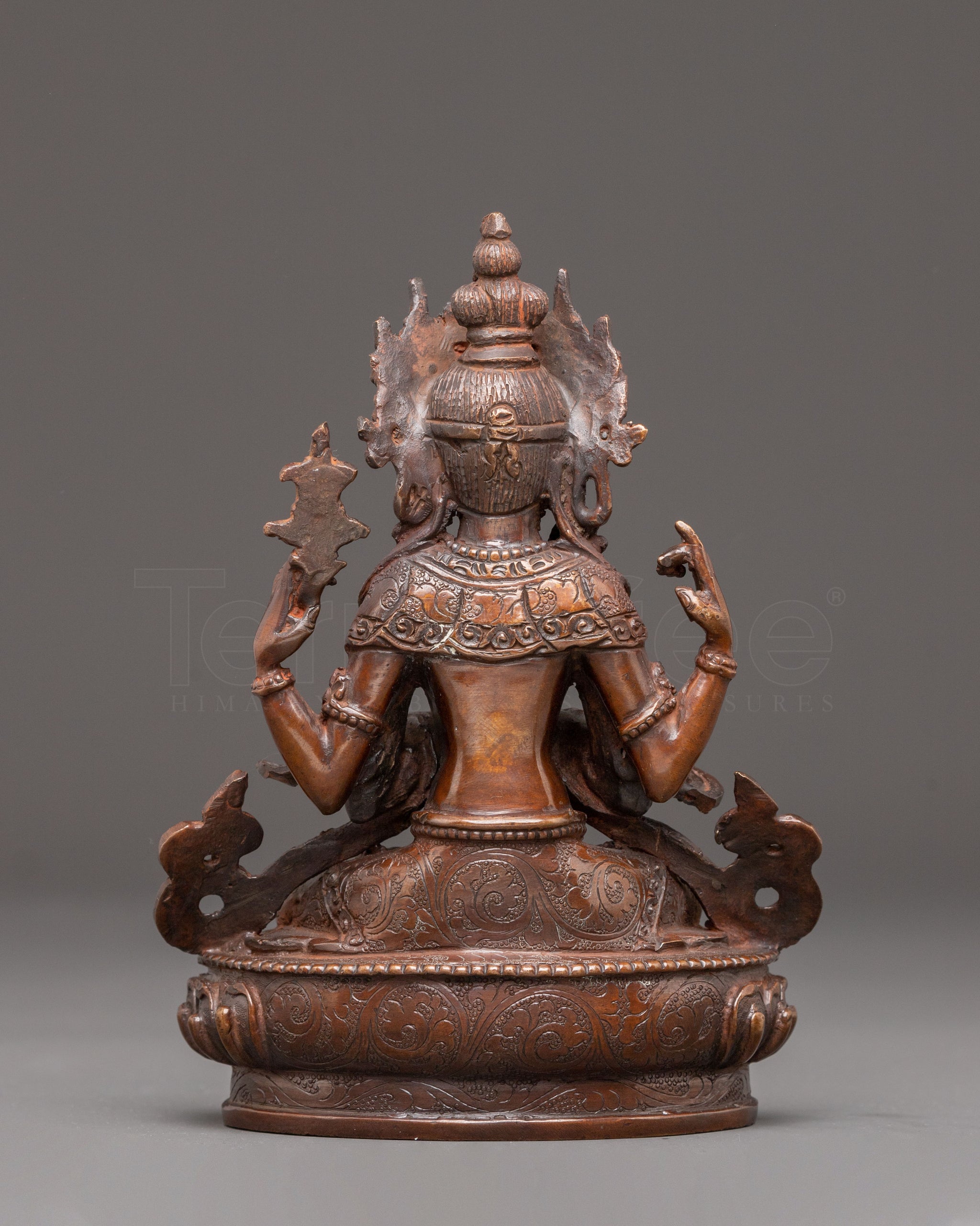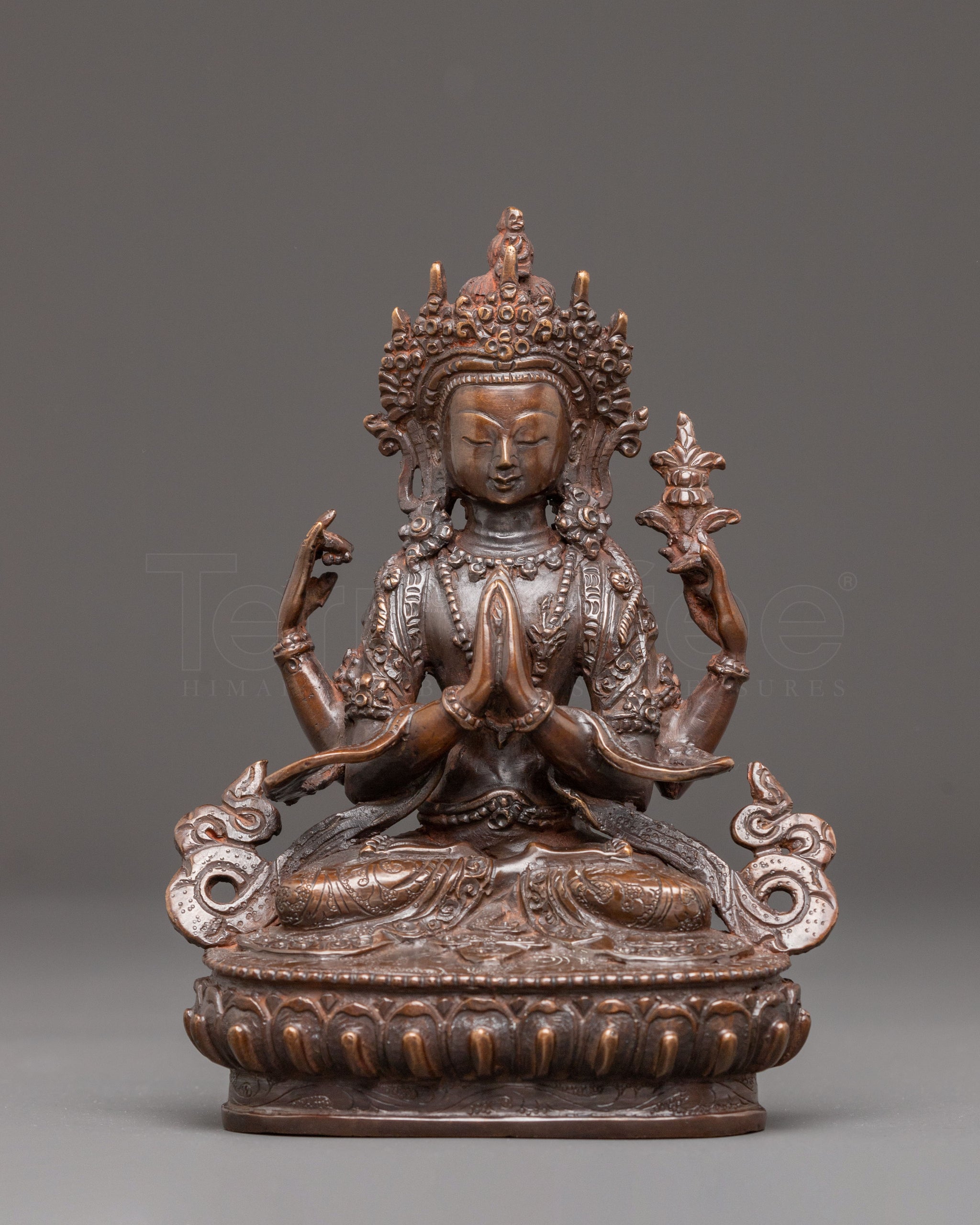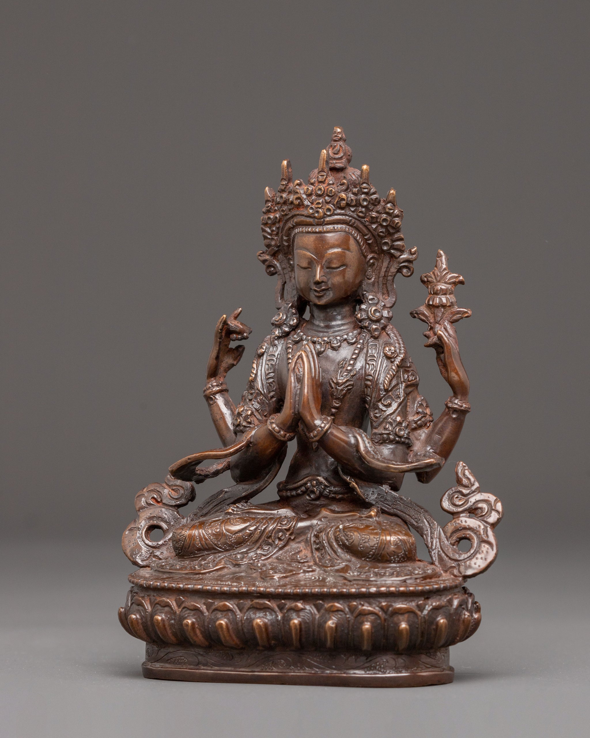 The Handmade Golden Statue of Compassion Chenrezig stands at 6.5 inches (16.5 cm) in height with a base width of 5.1 inches (13 cm). Weighing 0.89 kilograms, it is crafted from a copper body and adorned with 24K gold gilding, along with oxidized copper accents that enhance its traditional aesthetic. This piece reflects timeless spiritual artistry and makes a meaningful addition to altars, meditation spaces, or sacred collections.