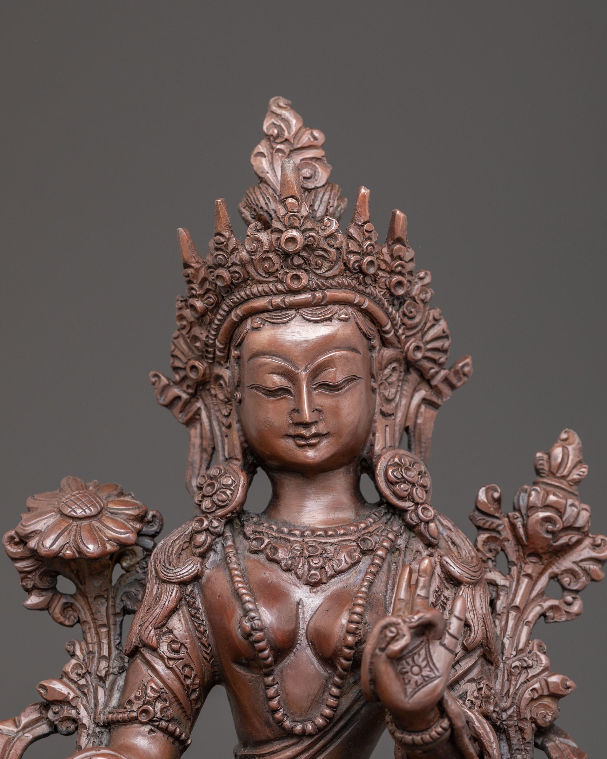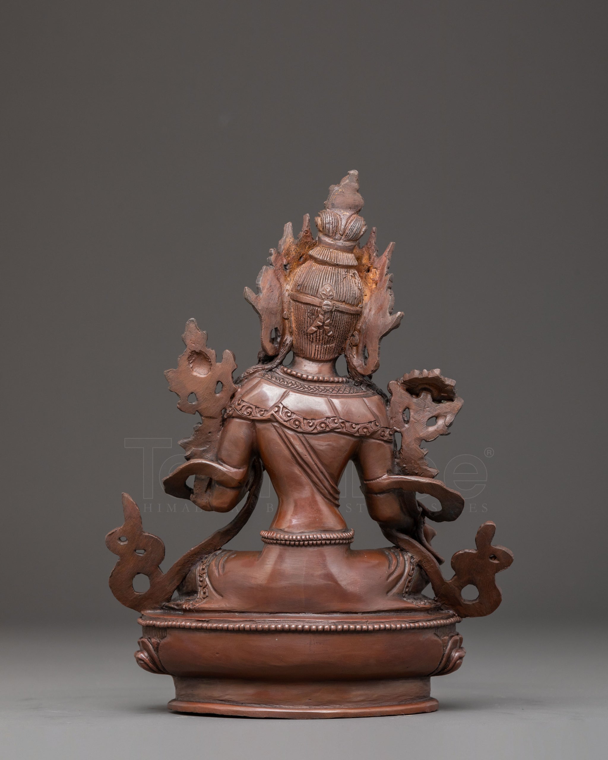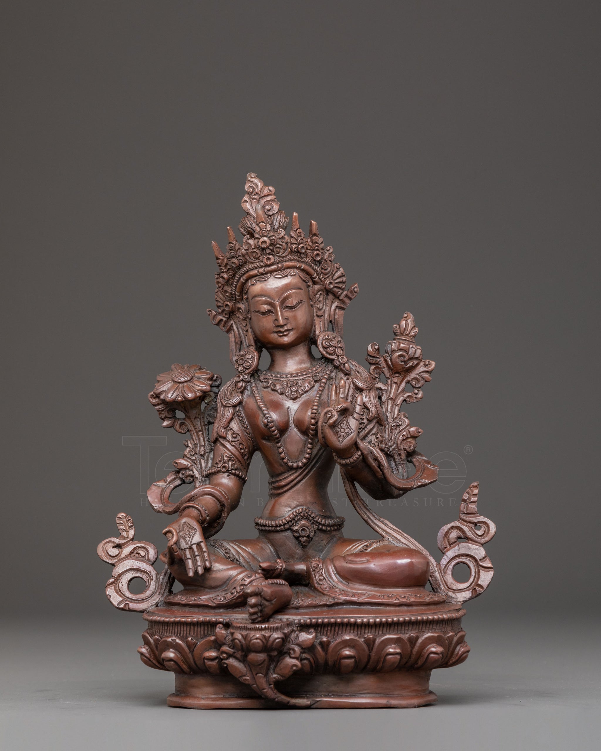 Green Tara is gracefully seated on a lotus throne, her right leg extended forward, embodying her lively compassion and readiness to assist. Her right hand performs the "gesture of giving" (Varada Mudra), reflecting her endless generosity and eagerness to bestow blessings. In her left hand, she gently holds a blue lotus (Utpala), a symbol of purity and spiritual awakening, offering comfort and protection to all who turn to her for guidance. This statue captures the serene and active spirit of the Divine Goddess in a timeless pose.