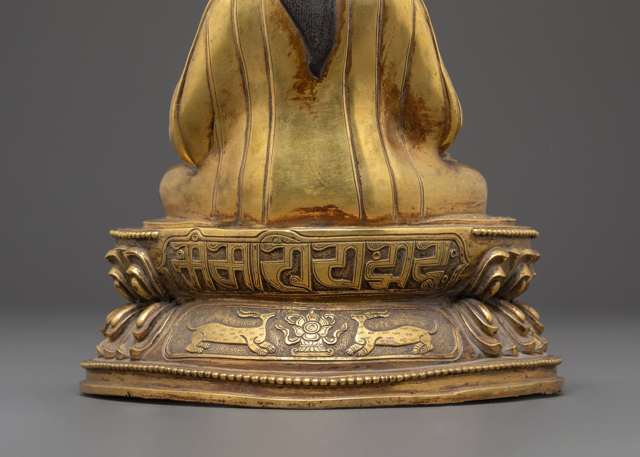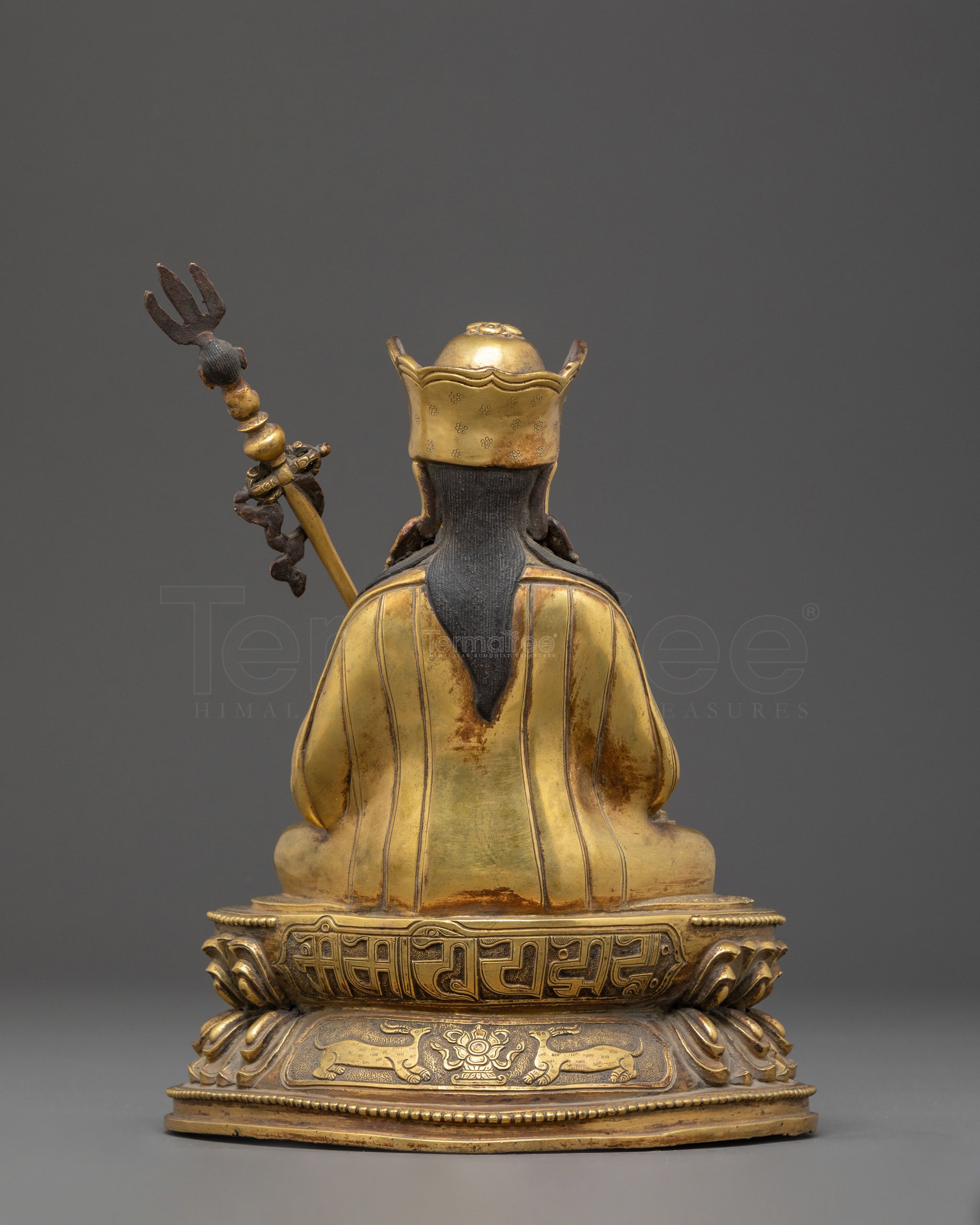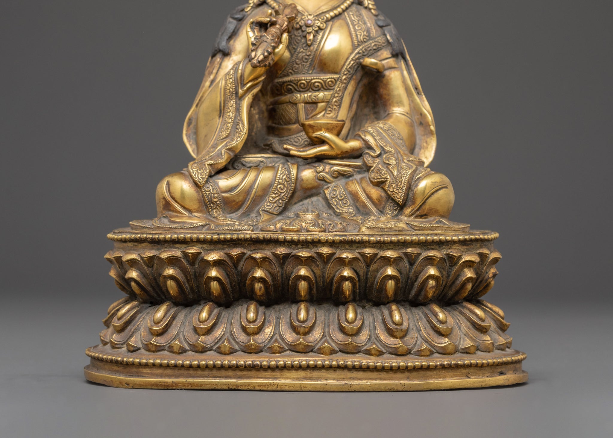 This handmade Himalayan Guru Tsokye Dorje golden statue stands at 9.1”/23cm in height and 7.1”/18cm at the base, weighing 2.5 kg. Made from copper, covered with a triple layer of 24K gold gilding, and carved with deeply engraved carvings that produce a magnificent 3D-like effect. This sculpture, adorned with hand-carved gemstones, and handcrafted by expert Nepalese artisans, elegantly symbolizes Himalayan Buddhism's sacred traditions, making it an appropriate addition to altars, meditation places, or sacred collections.