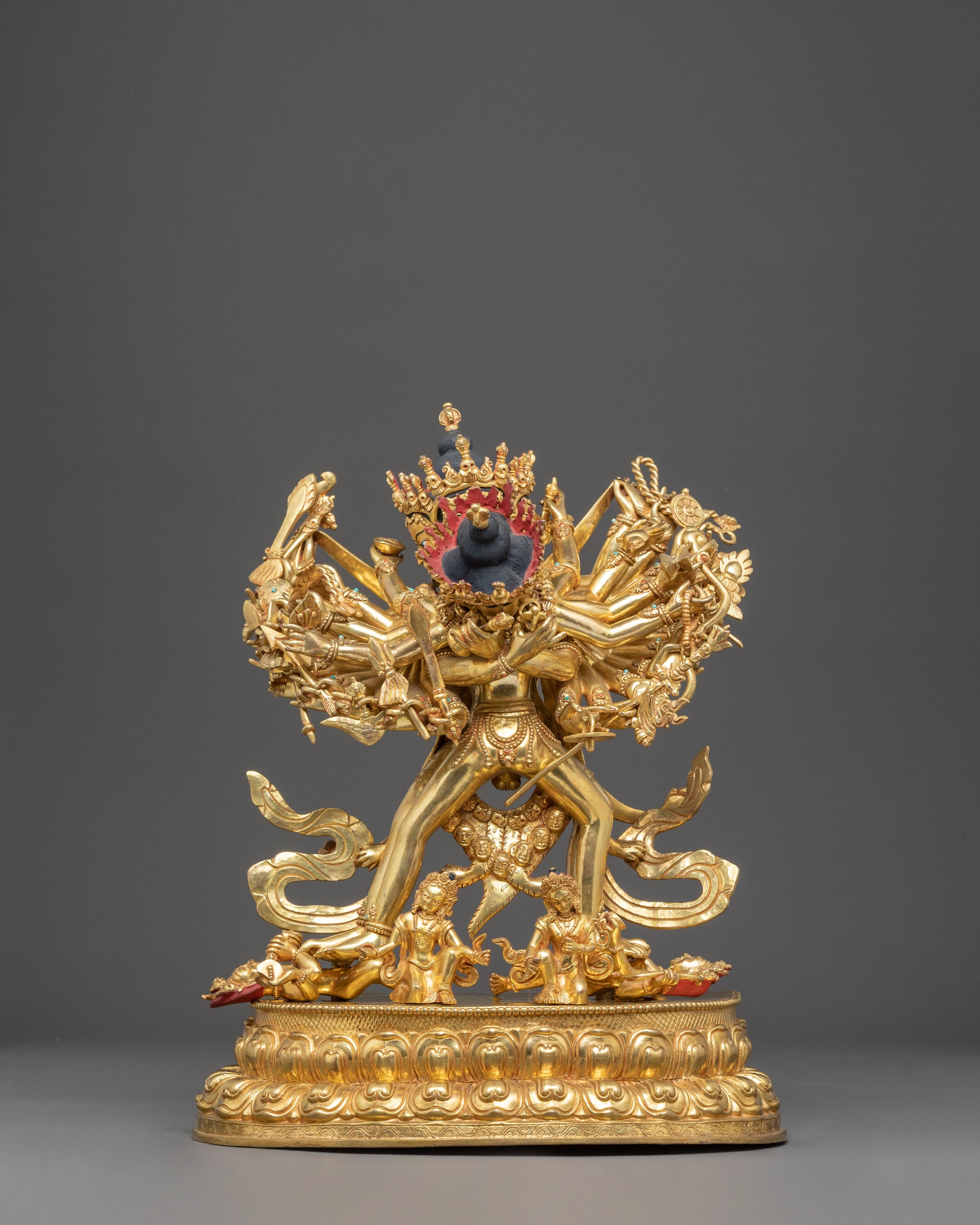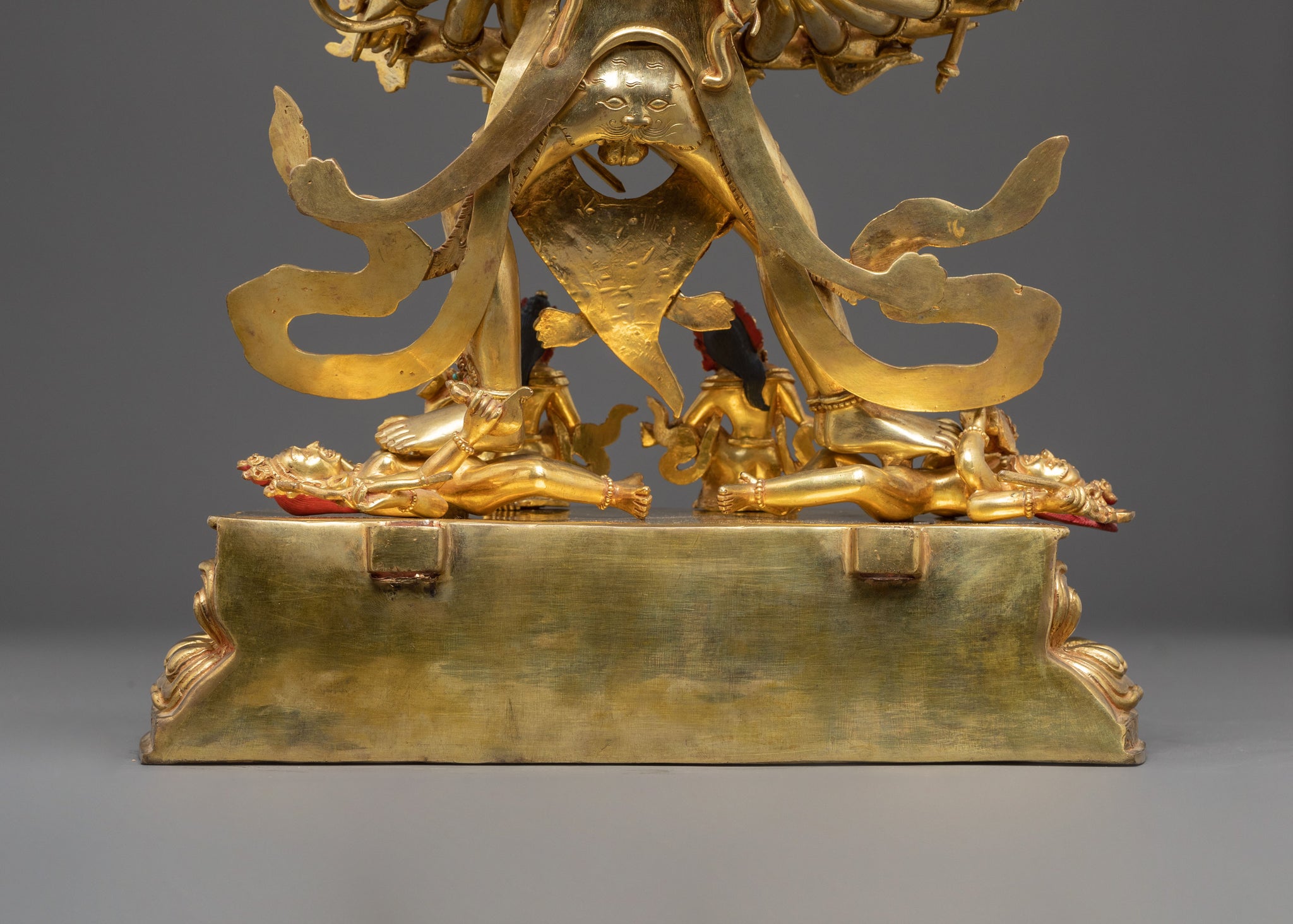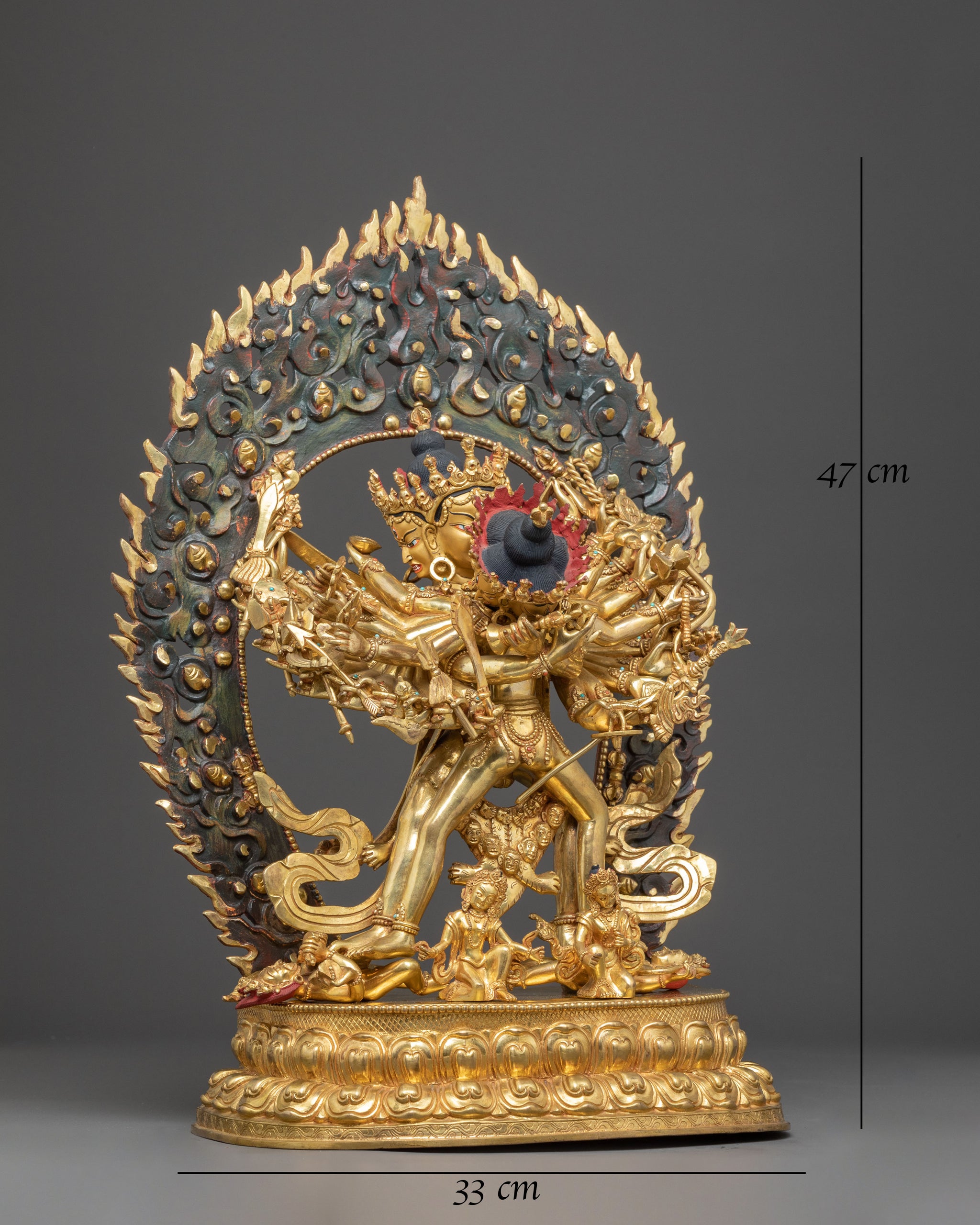 This handmade statue of Kalachakra, the Wheel of Time, stands at 18.5 inches in height and 13.0 inches in width, weighing 11.08 kg. It is made of copper, covered with a triple layer of 24K gold gilding, and carved with deeply engraved carvings that produce a magnificent 3D-like effect. This sculpture is handcrafted by expert Nepalese artisans, elegantly symbolizing Himalayan Buddhism's sacred traditions, making it an appropriate addition to altars, meditation places, or sacred collections.