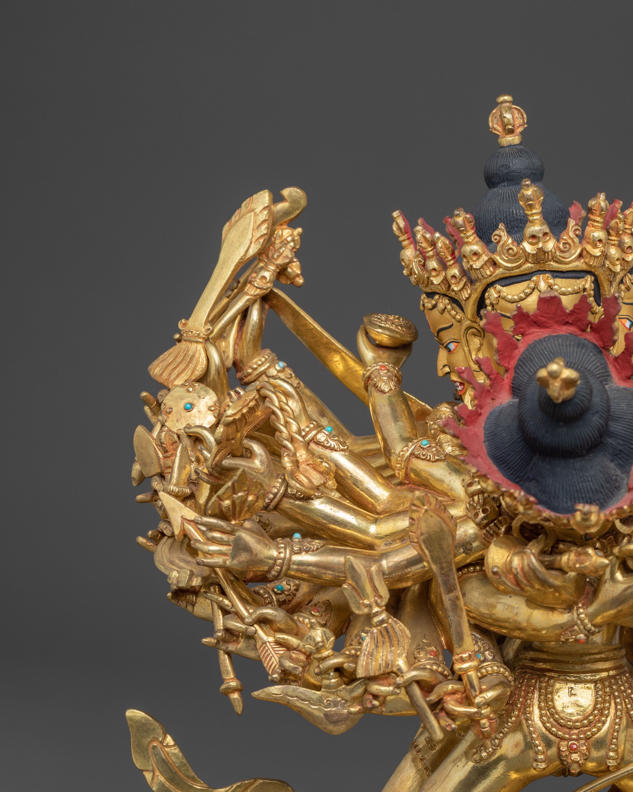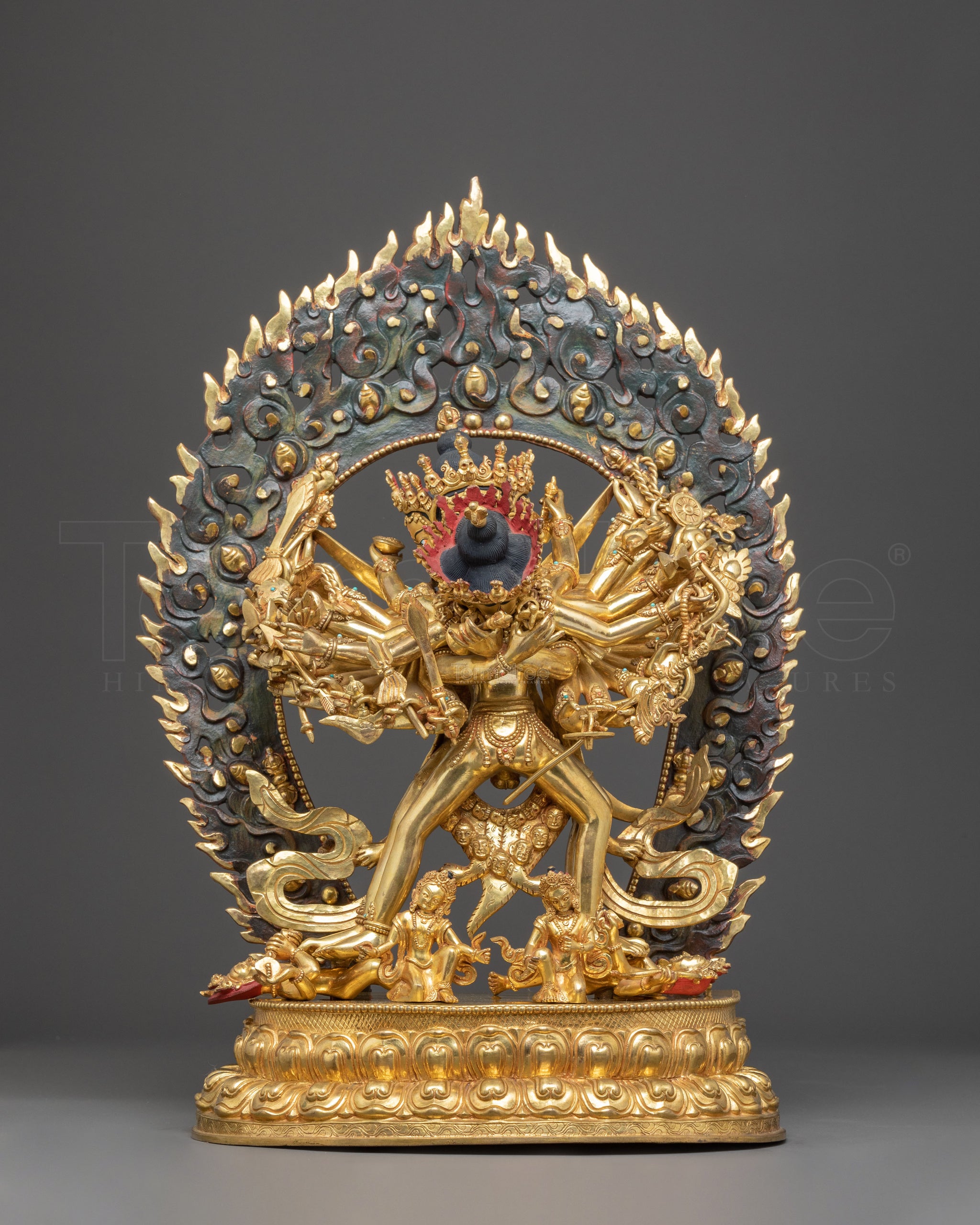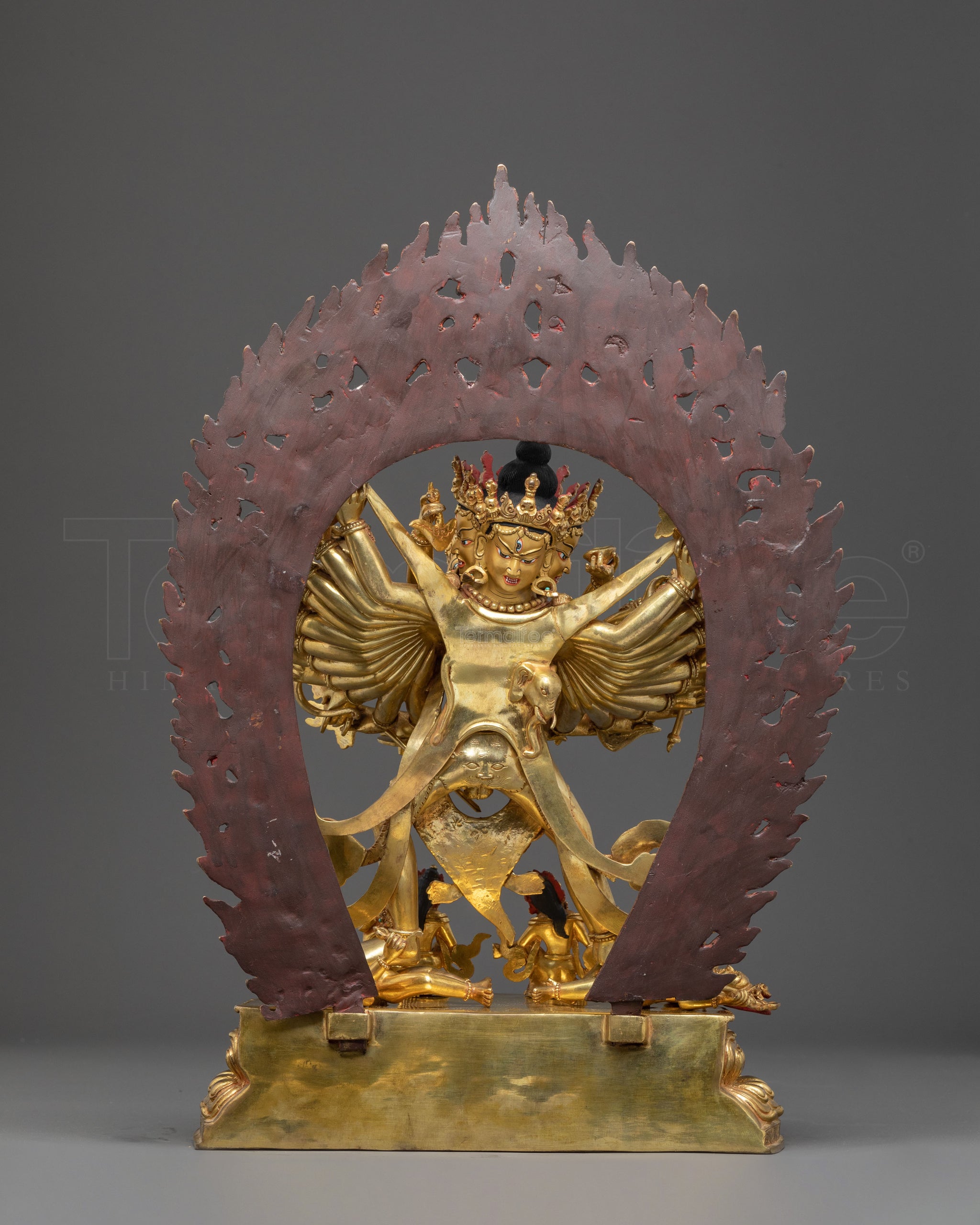 This handmade statue of Kalachakra, the Wheel of Time, stands at 18.5 inches in height and 13.0 inches in width, weighing 11.08 kg. It is made of copper, covered with a triple layer of 24K gold gilding, and carved with deeply engraved carvings that produce a magnificent 3D-like effect. This sculpture is handcrafted by expert Nepalese artisans, elegantly symbolizing Himalayan Buddhism's sacred traditions, making it an appropriate addition to altars, meditation places, or sacred collections.