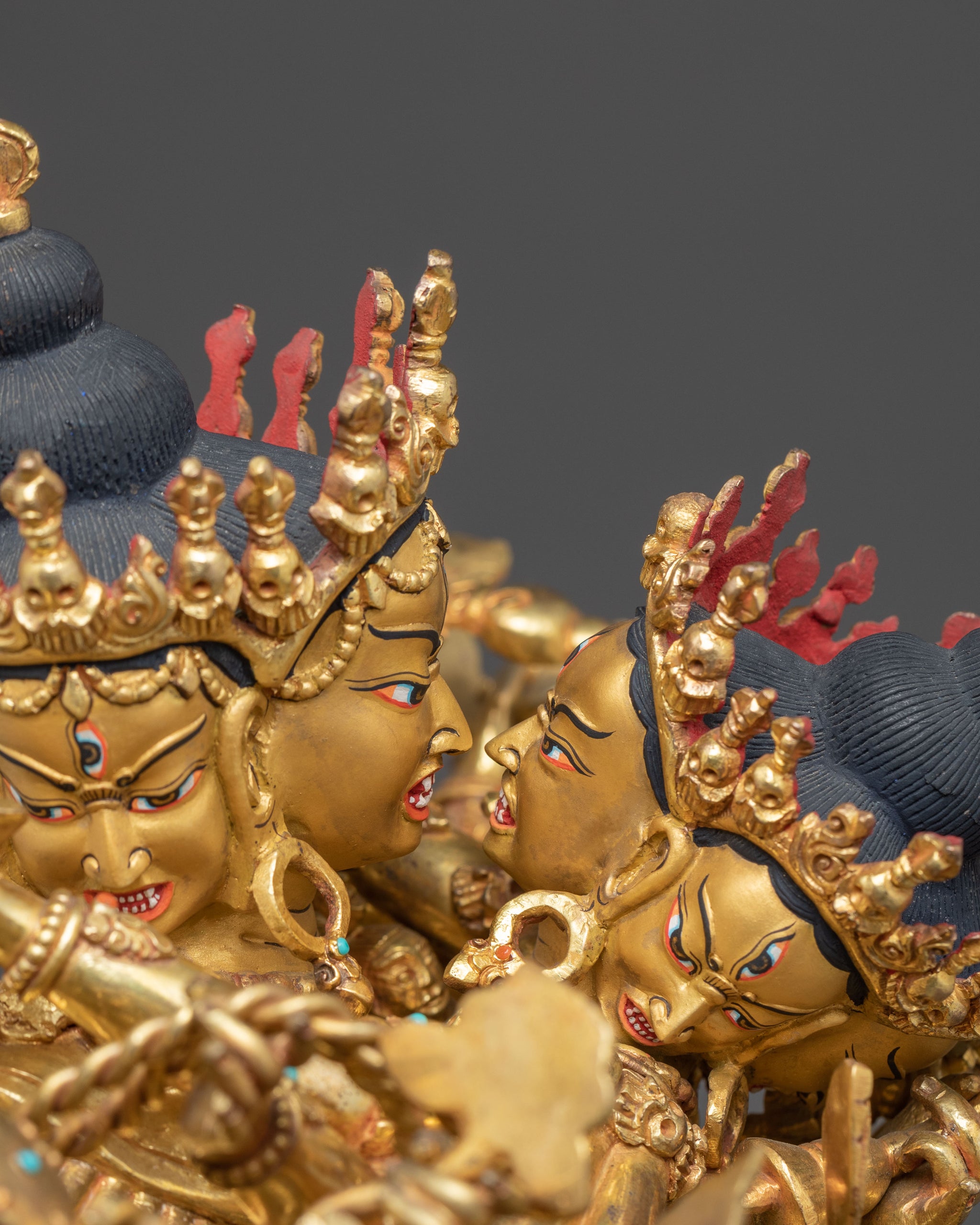 In Tibetan Buddhism, the Kalachakra, which translates to "Wheel of Time," is a god connected to time, karma, and the cyclic nature of existence. He represents the orderly flow of time and events and the interconnectedness of all things. The Kalachakra deity and his consort are central to practices aimed at attaining enlightenment, disease prevention, and longevity. These statues serve as powerful reminders of the ever-turning wheel of life and the importance of living mindfully and compassionately.