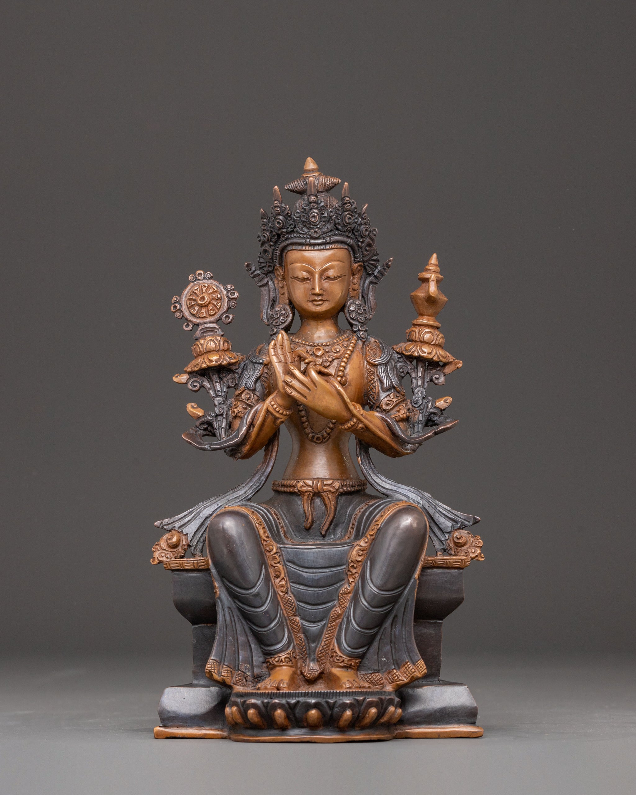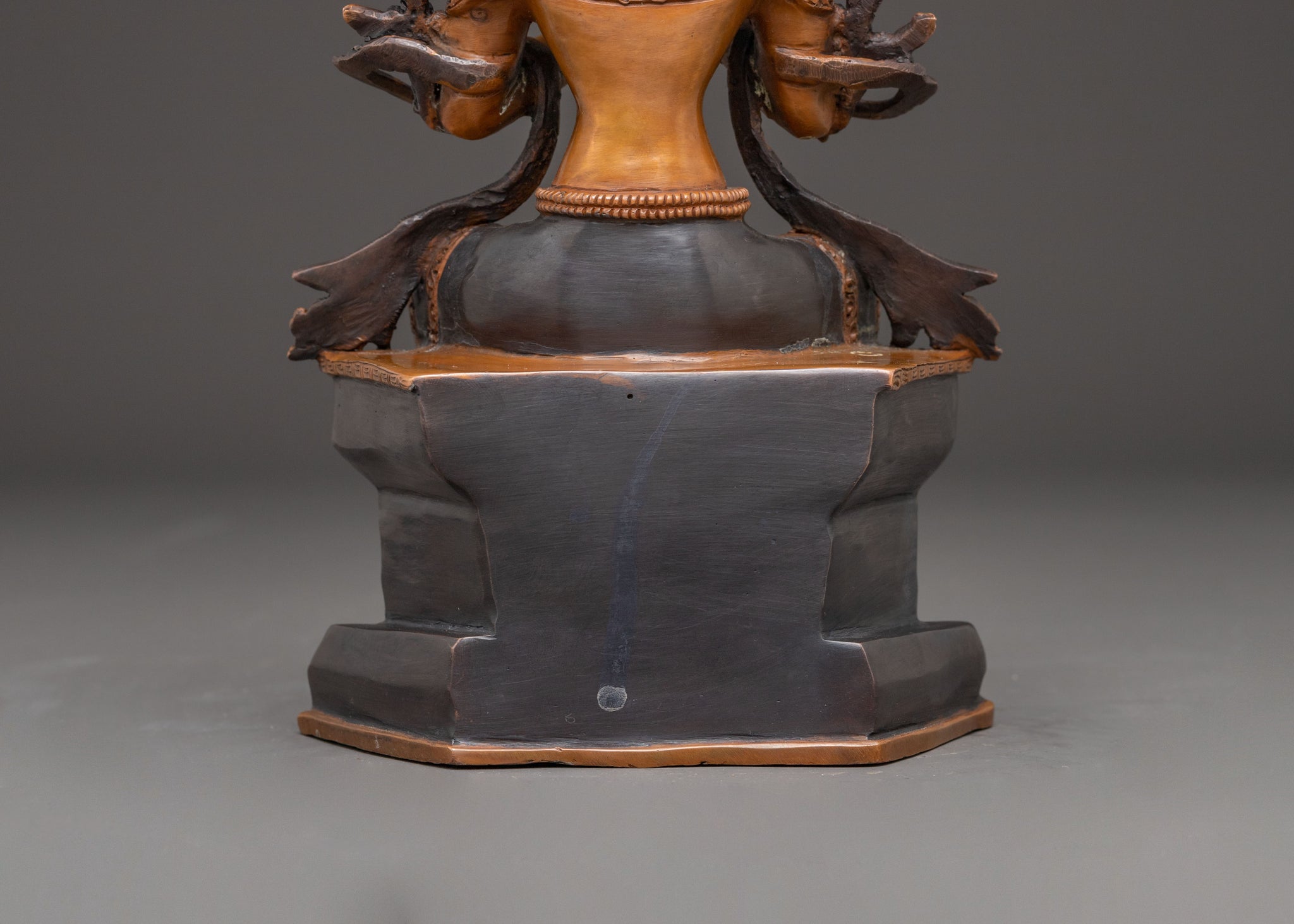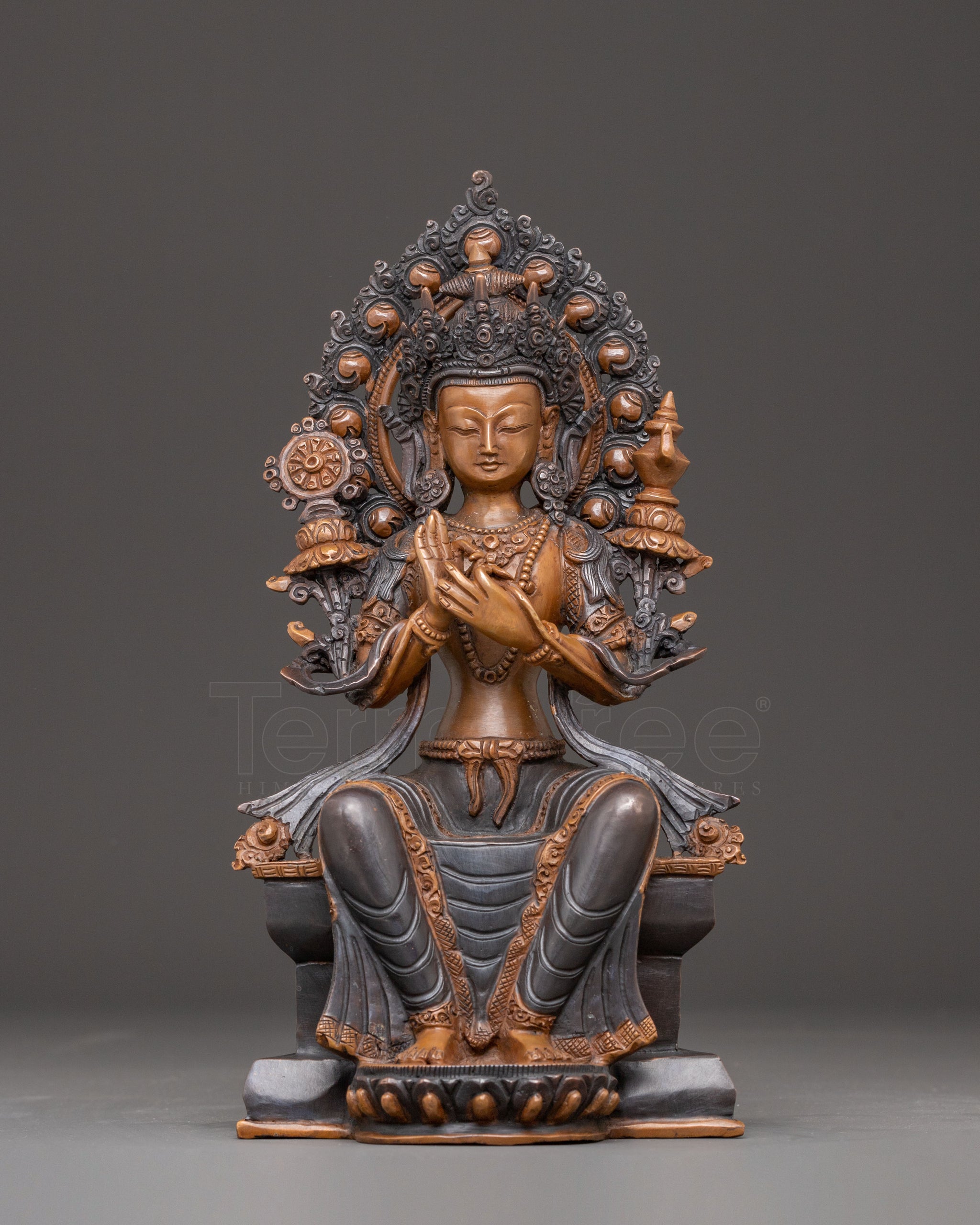 Introducing the Maitreya Buddha Statue, a stunning representation of the Buddha of the Future, who is highly regarded in Mahayana Buddhism for his pledge to return to Earth and establish a period of global peace and enlightenment. This statue, which stands at a respectable height of 11.4 inches on a base of 5.9 inches and weighs 2.236 kg, represents Maitreya's promise of compassion and the dawning of a new age of spiritual awakening. This sculpture, made of an oxidized copper body, perfectly embodies Maitreya's hopeful and loving spirit.