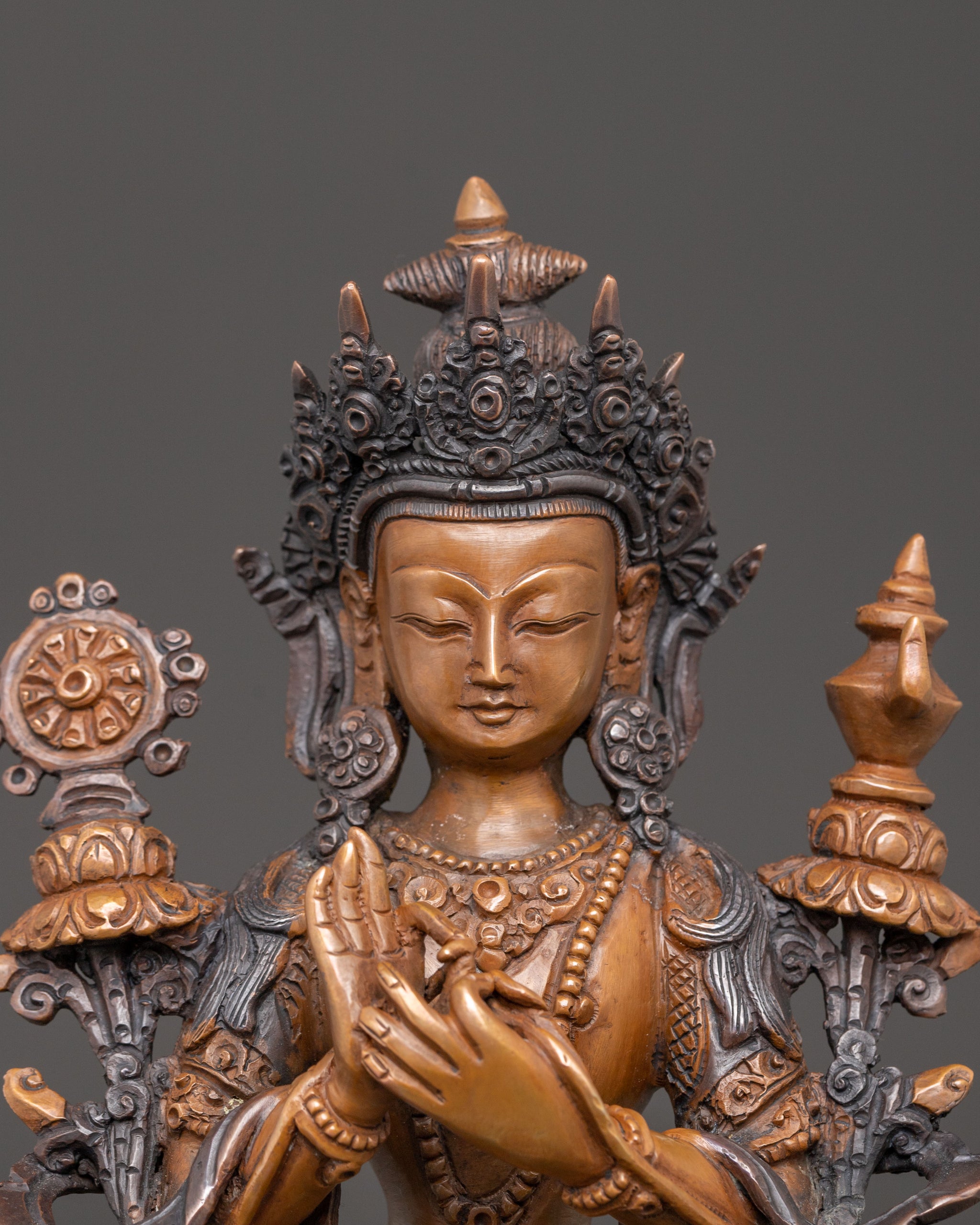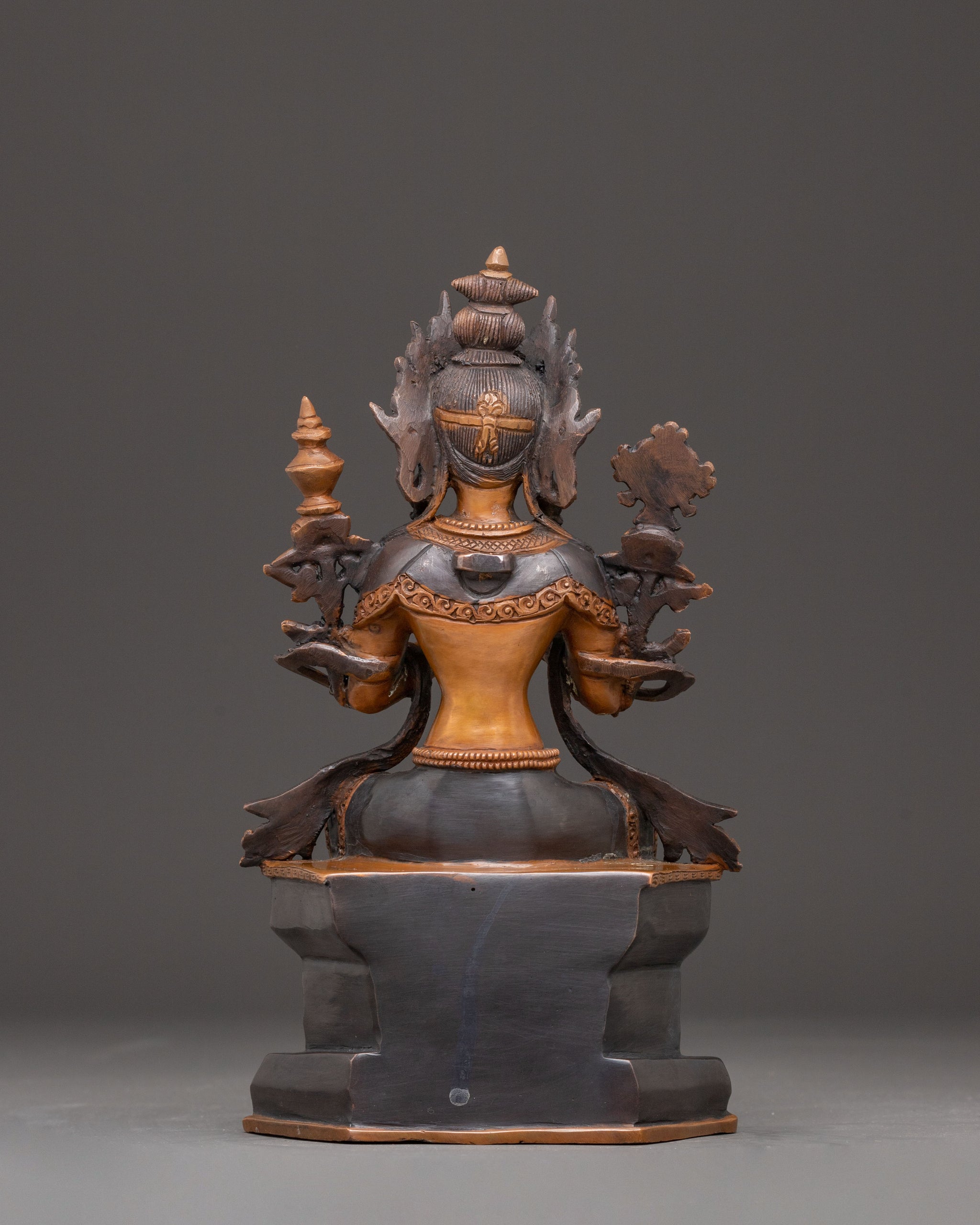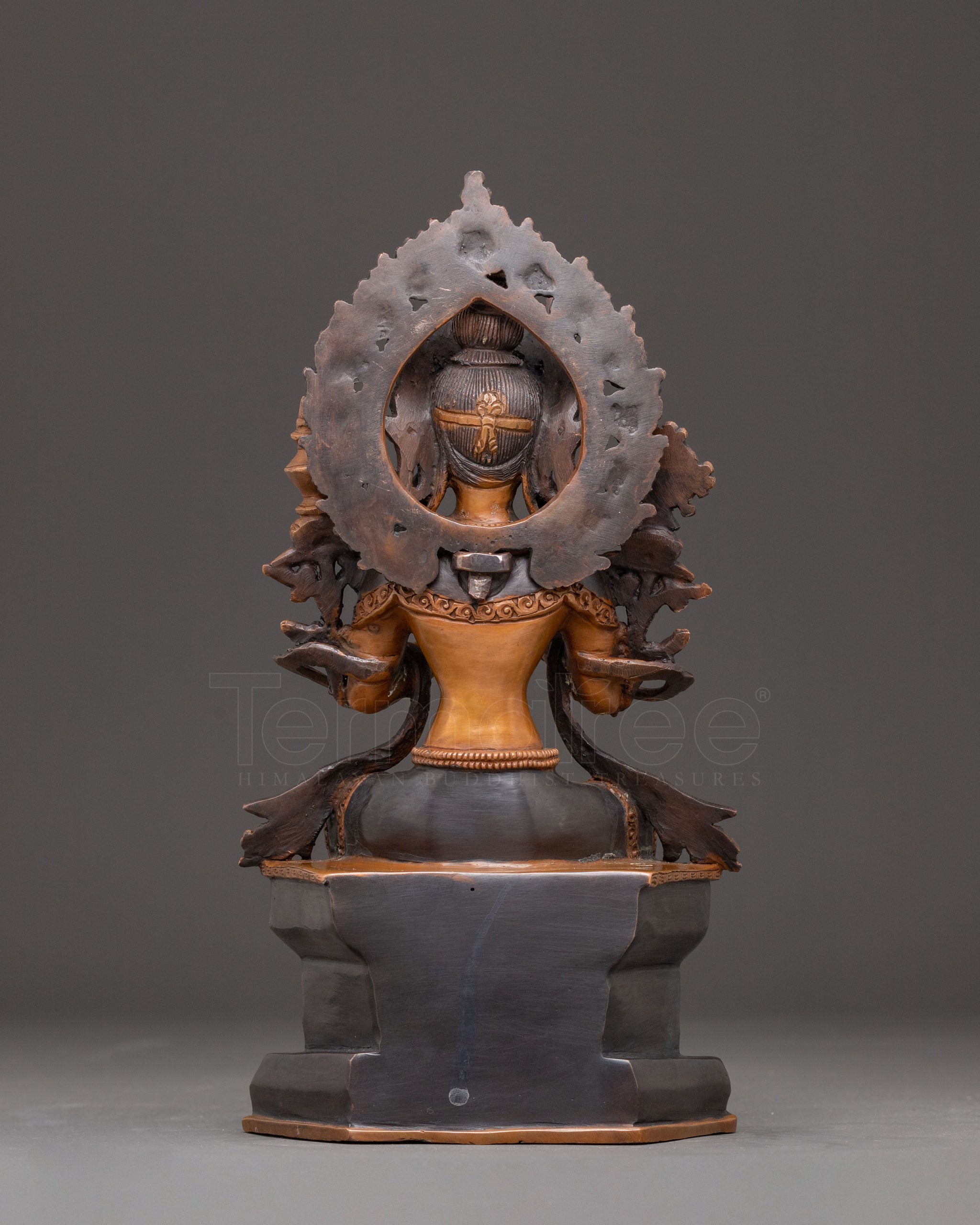 Introducing the Maitreya Buddha Statue, a stunning representation of the Buddha of the Future, who is highly regarded in Mahayana Buddhism for his pledge to return to Earth and establish a period of global peace and enlightenment. This statue, which stands at a respectable height of 11.4 inches on a base of 5.9 inches and weighs 2.236 kg, represents Maitreya's promise of compassion and the dawning of a new age of spiritual awakening. This sculpture, made of an oxidized copper body, perfectly embodies Maitreya's hopeful and loving spirit.