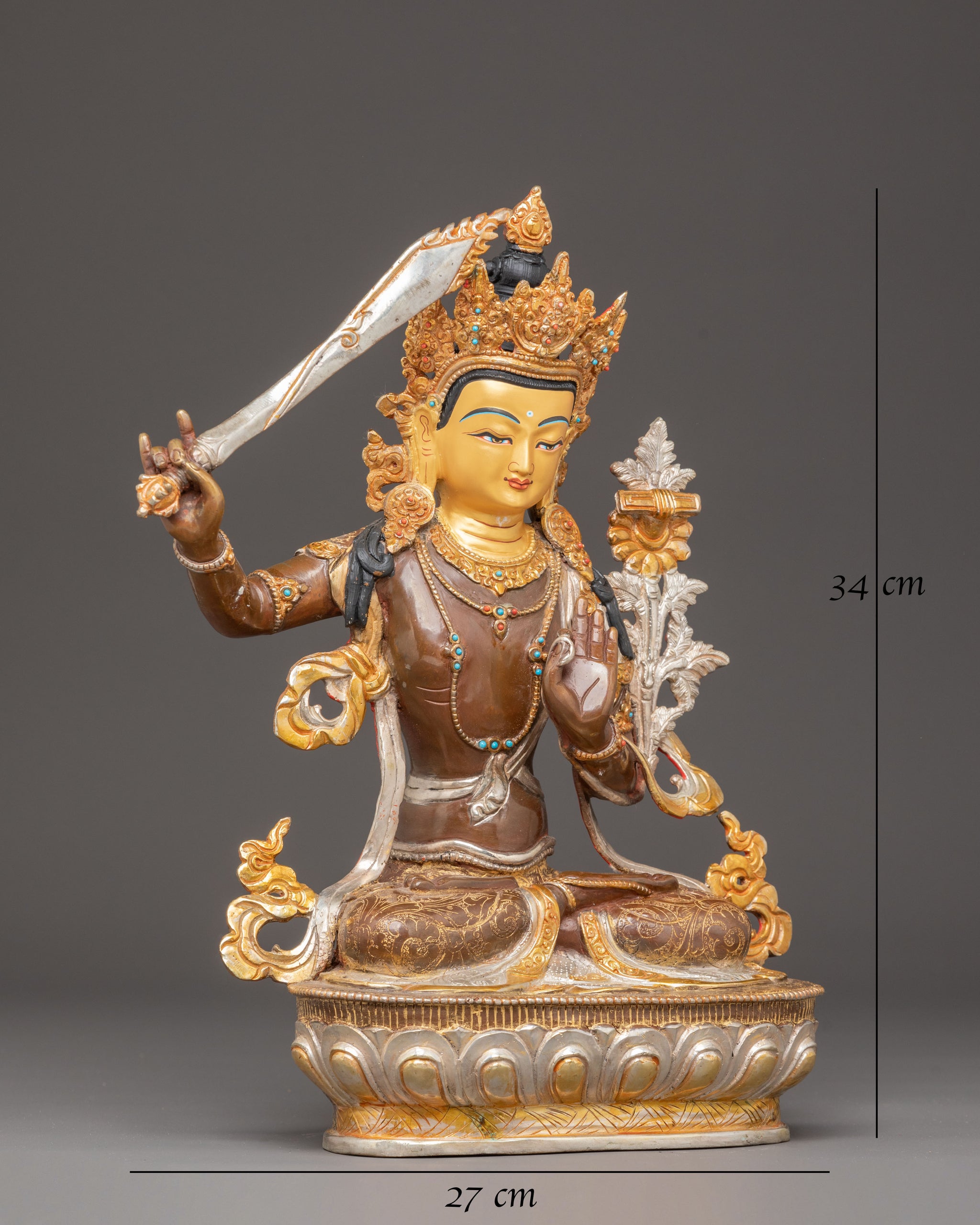 The Handmade Manjushri Golden Statue stands at 13.4 inches (34 cm) in height, with a base width of 10.6 inches (27 cm), making it a substantial and elegant piece for any sacred space or collection. Crafted from oxidized copper, the statue is adorned with a triple layer of 24K gold gilding and intricate silver plating, which accentuates its spiritual significance and artistic craftsmanship. The combination of these materials creates a radiant, sacred presence, highlighting the skill and dedication of Nepali artisans.