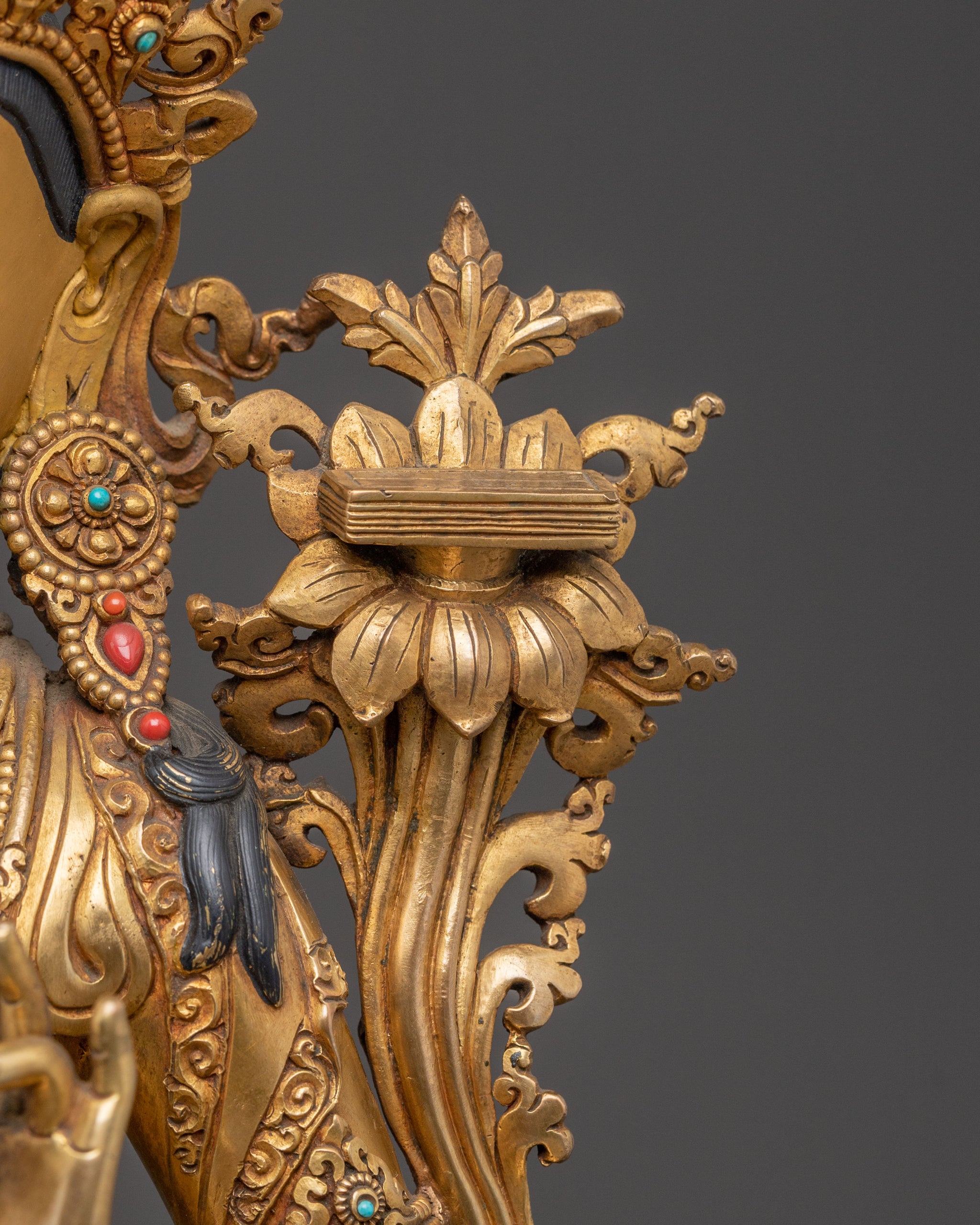 This handmade statue of Manjushri is standing at 15.9”/40.5cm (Height) and 11.6”/29.5cm (Base). This statue is made up of a copper body with 24k gold gilding and acrylic paintings. Designed by talented Nepalese artisans, this detailed sculpture is ideal for altars, meditation areas, or as a meaningful decor item for individuals seeking awareness in their daily lives.