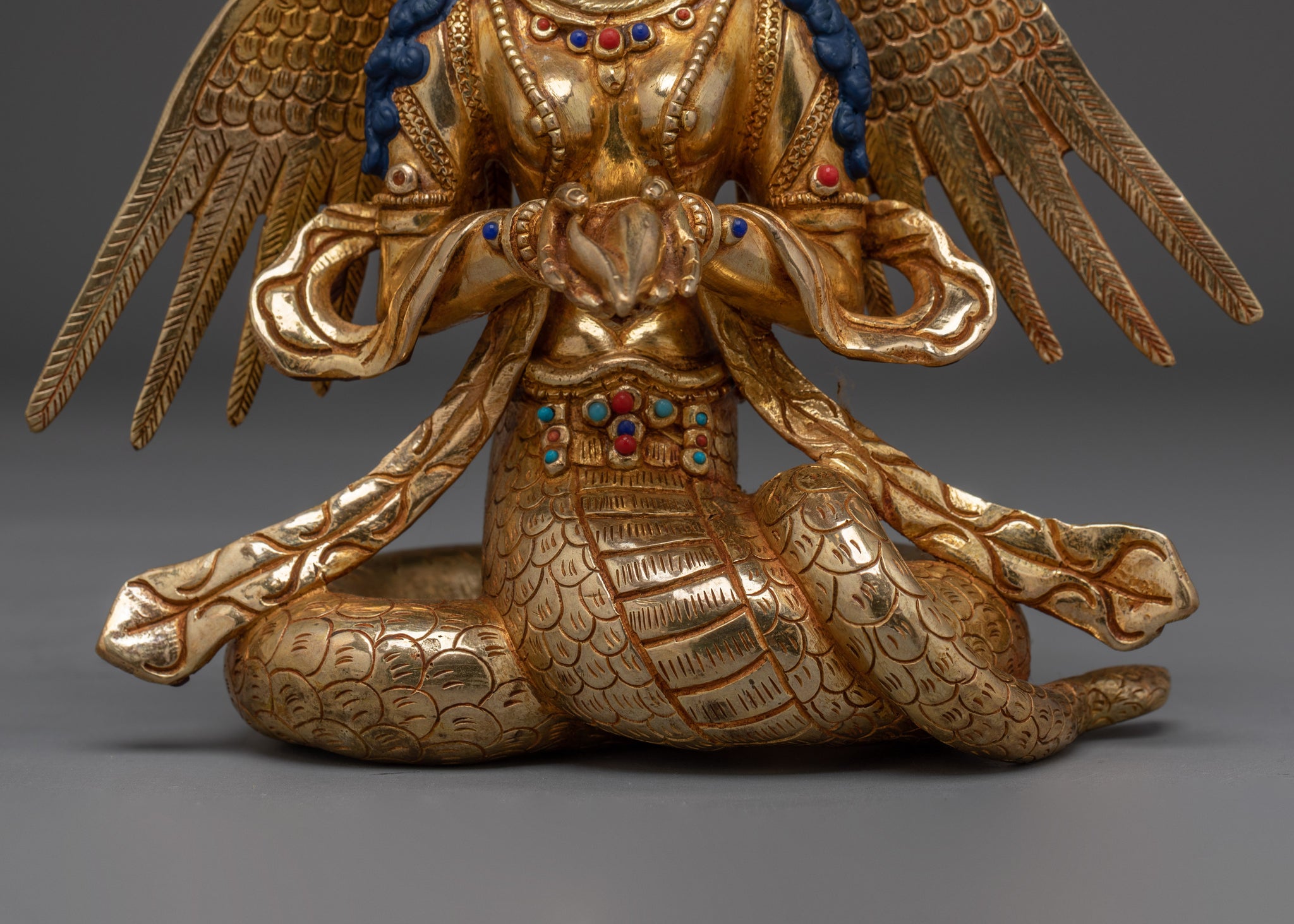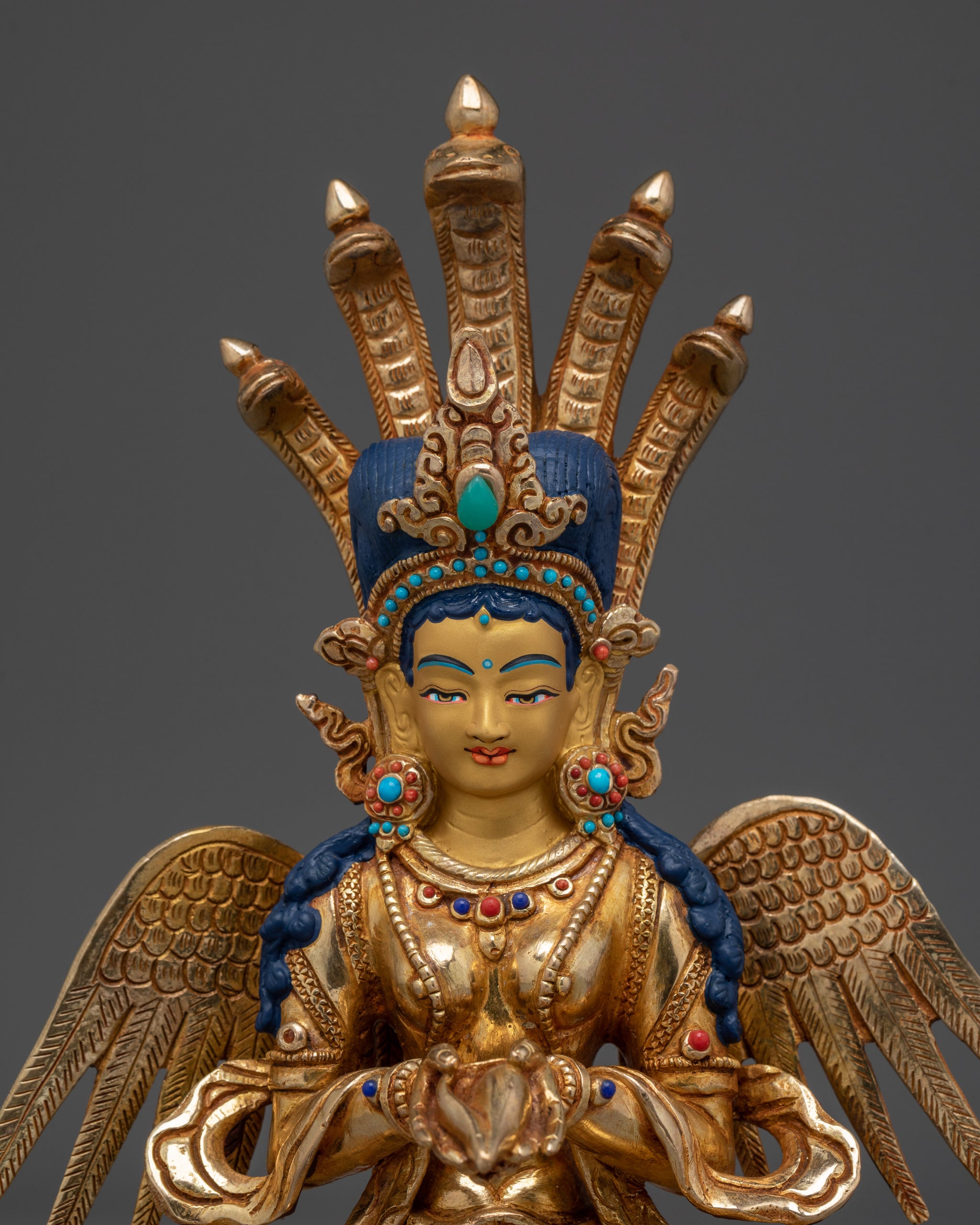 Iconographically, the statue depicts Naagkanya as a half-human, half-serpent goddess holding jewels with both hands, symbolizing abundance and spiritual wealth. Five serpents form a protective hood behind her head, and graceful wings extend from her back, emphasizing her divine and powerful nature.