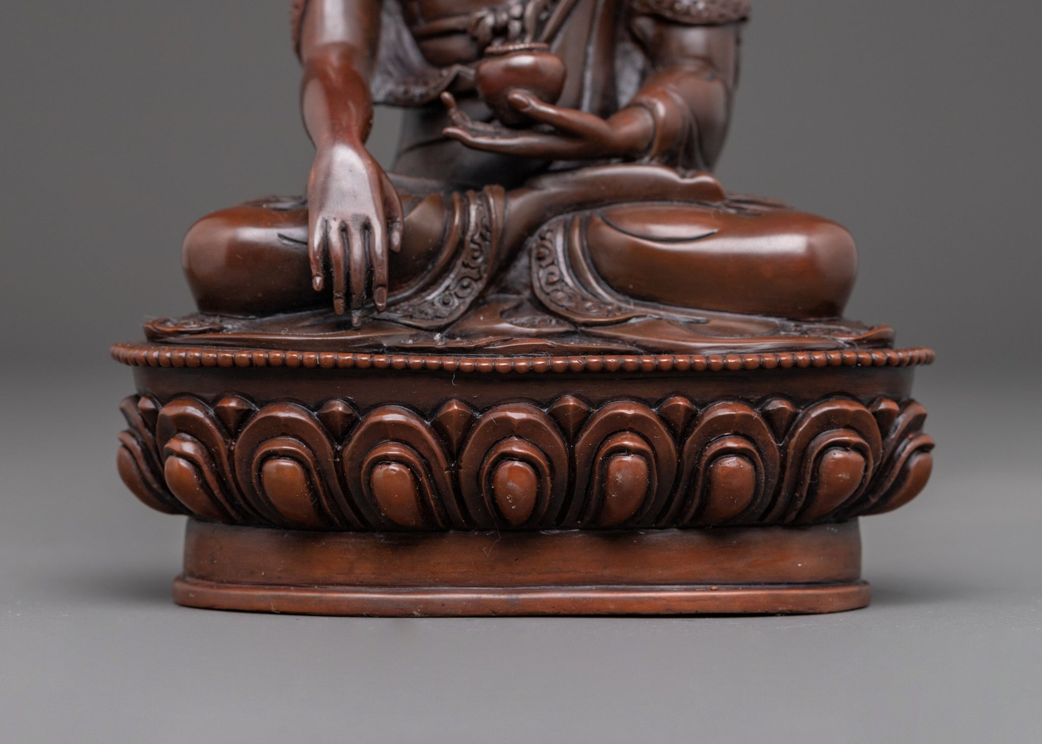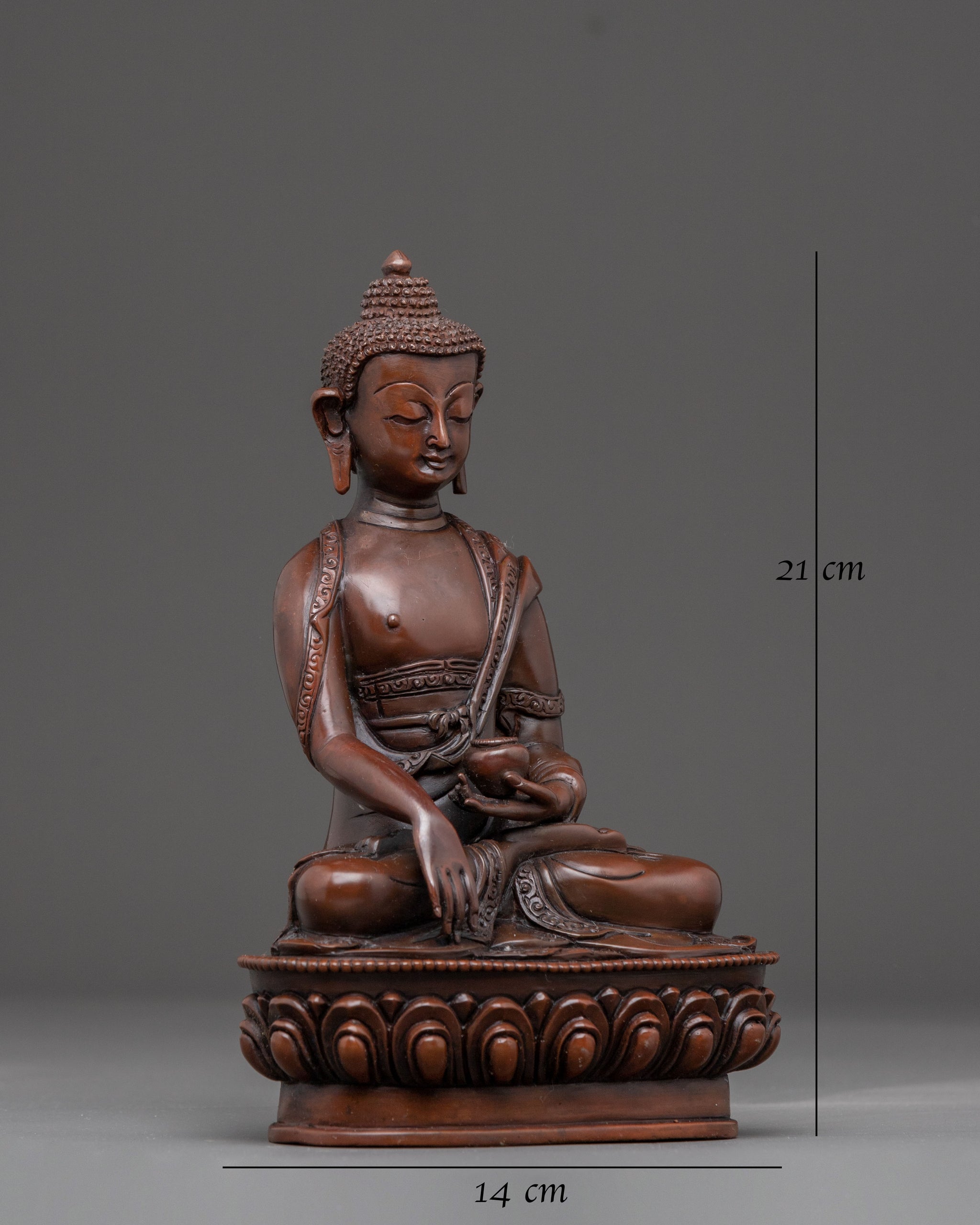 This Handmade Nepalese Shakyamuni Buddha Statue stands 8.3 inches tall, with a base width of 5.5 inches, and weighs 1.31 kg. Expertly handcrafted from oxidized copper, it features a rich, antique finish that enhances its serene presence. Representing the historical Buddha and the embodiment of enlightenment, this statue radiates peaceful wisdom and spiritual awakening. Ideal for altars, meditation areas, or as a meaningful decorative piece, it serves as a reminder of compassion, mindfulness, and the path to inner peace.