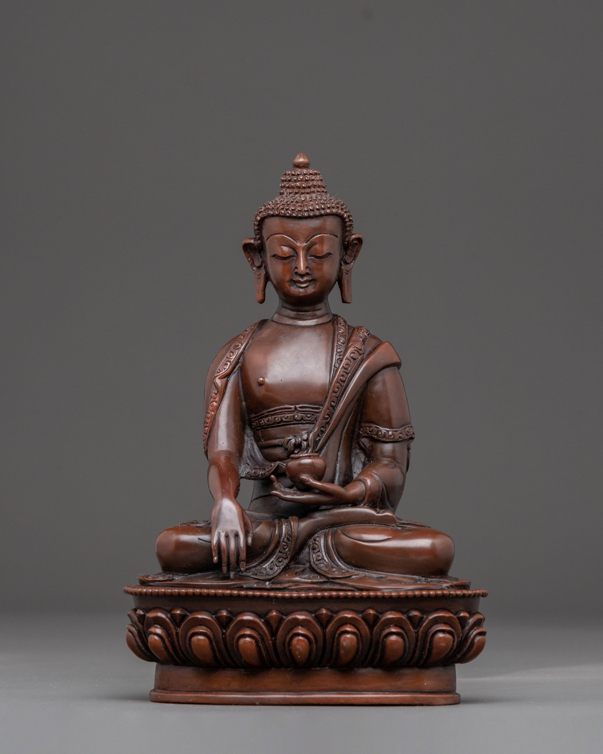 The Shakyamuni Buddha is depicted in a calm, meditative state with half-closed eyes, embodying profound inner peace and an awakened presence. His right hand is in the bhūmisparśa mudrā (earth-touching gesture), signifying the moment he called the Earth to witness his enlightenment. His left hand holds an alms bowl, symbolizing renunciation and the simplicity of the monastic path. Atop his head rests the uṣṇīṣa, representing supreme wisdom, while his hair is styled in snail-like coils, referencing the well-known story of snails protecting him from the sun during prolonged meditation. He sits gracefully in the vajra posture on a moon disc lotus base, conveying stability, spiritual purity, and unwavering focus. This refined iconography honors the profound presence of the historical Buddha—serene, dignified, and deeply symbolic.