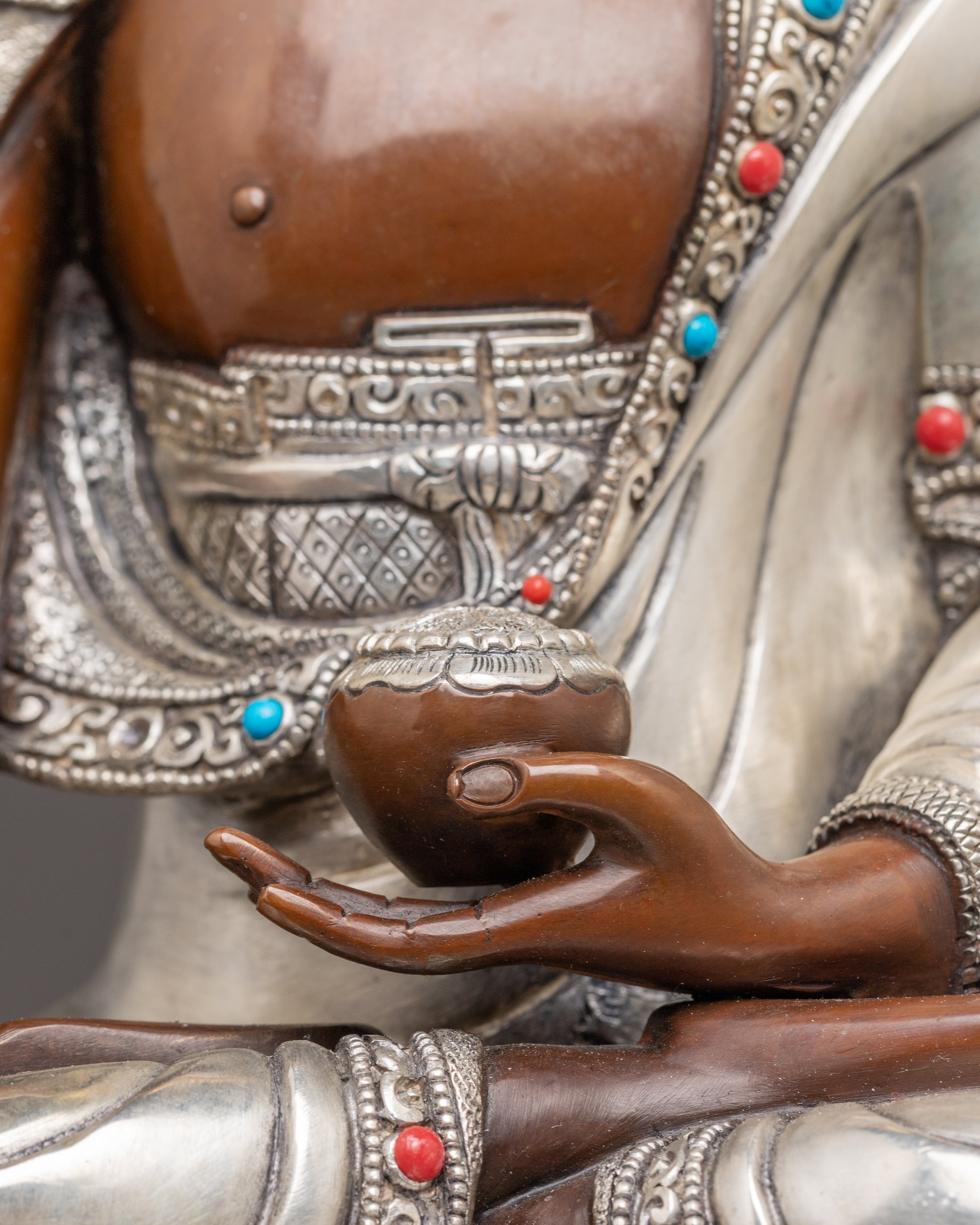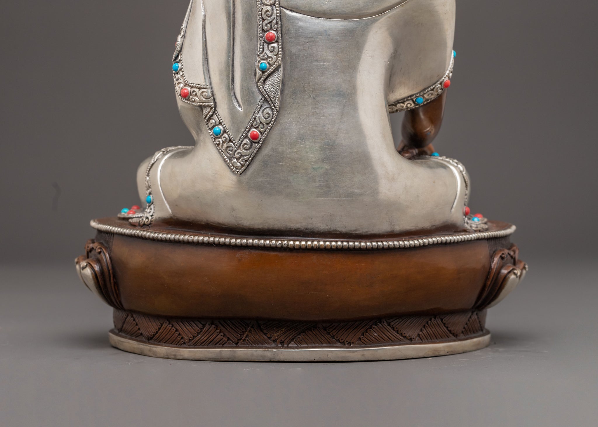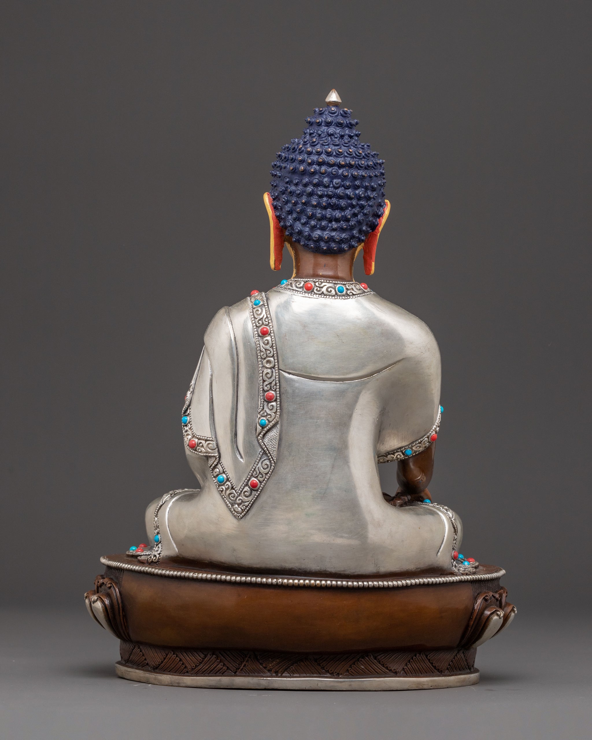 The Handmade Radiant Artwork of Buddha Shakyamuni, also known as Gautama Buddha, measures 13.0”/33cm in height and 9.3”/23.5cm at the base and weighs 4.16 kg. Crafted from oxidized copper with silver plating and detailed with gold and acrylic paintings, it showcases a radiant blend of traditional materials and fine detailing. Expertly made by skilled Nepali artisans, this statue embodies the serene presence of the historical Buddha, making it a meaningful addition to altars, meditation spaces, or spiritual collections.