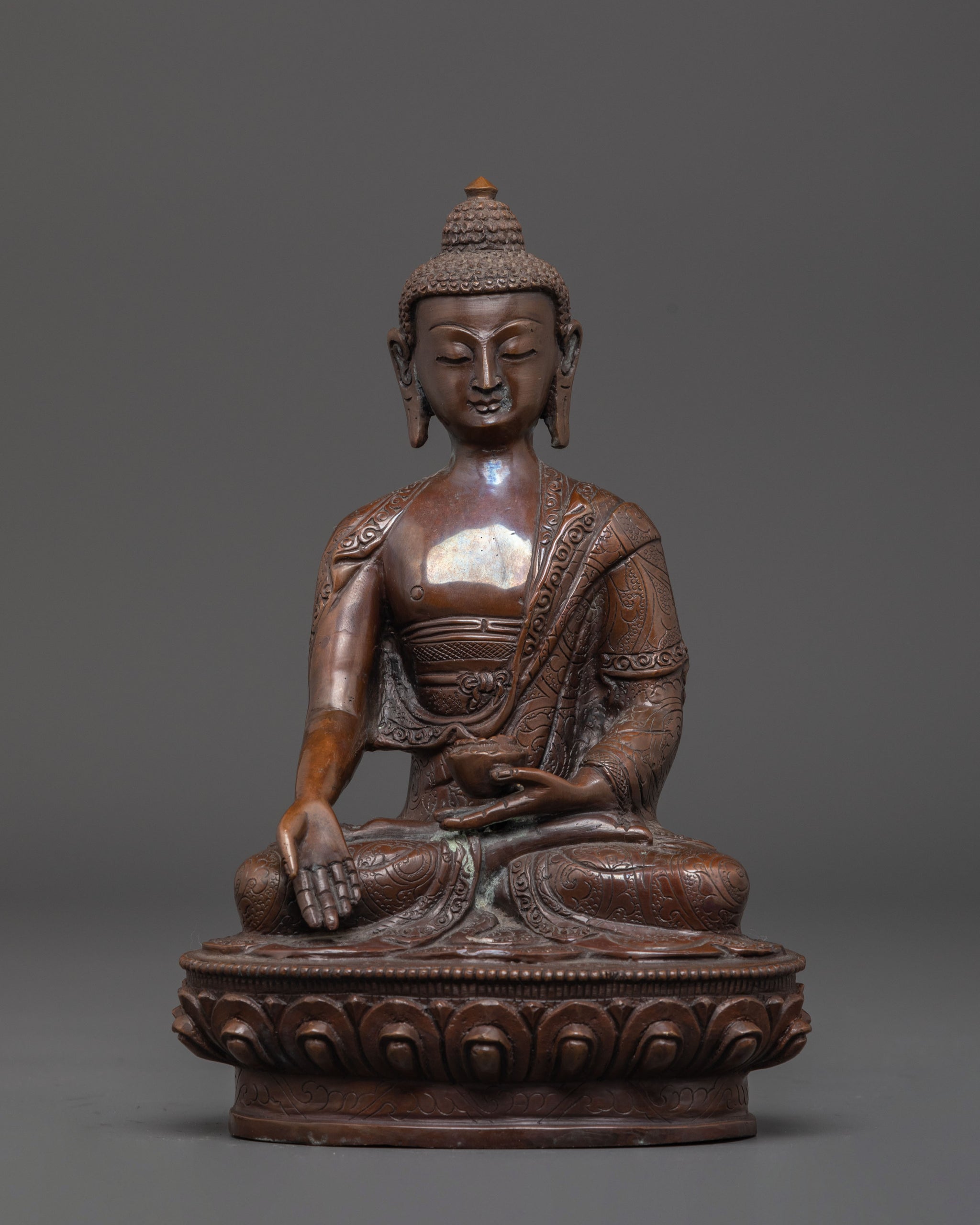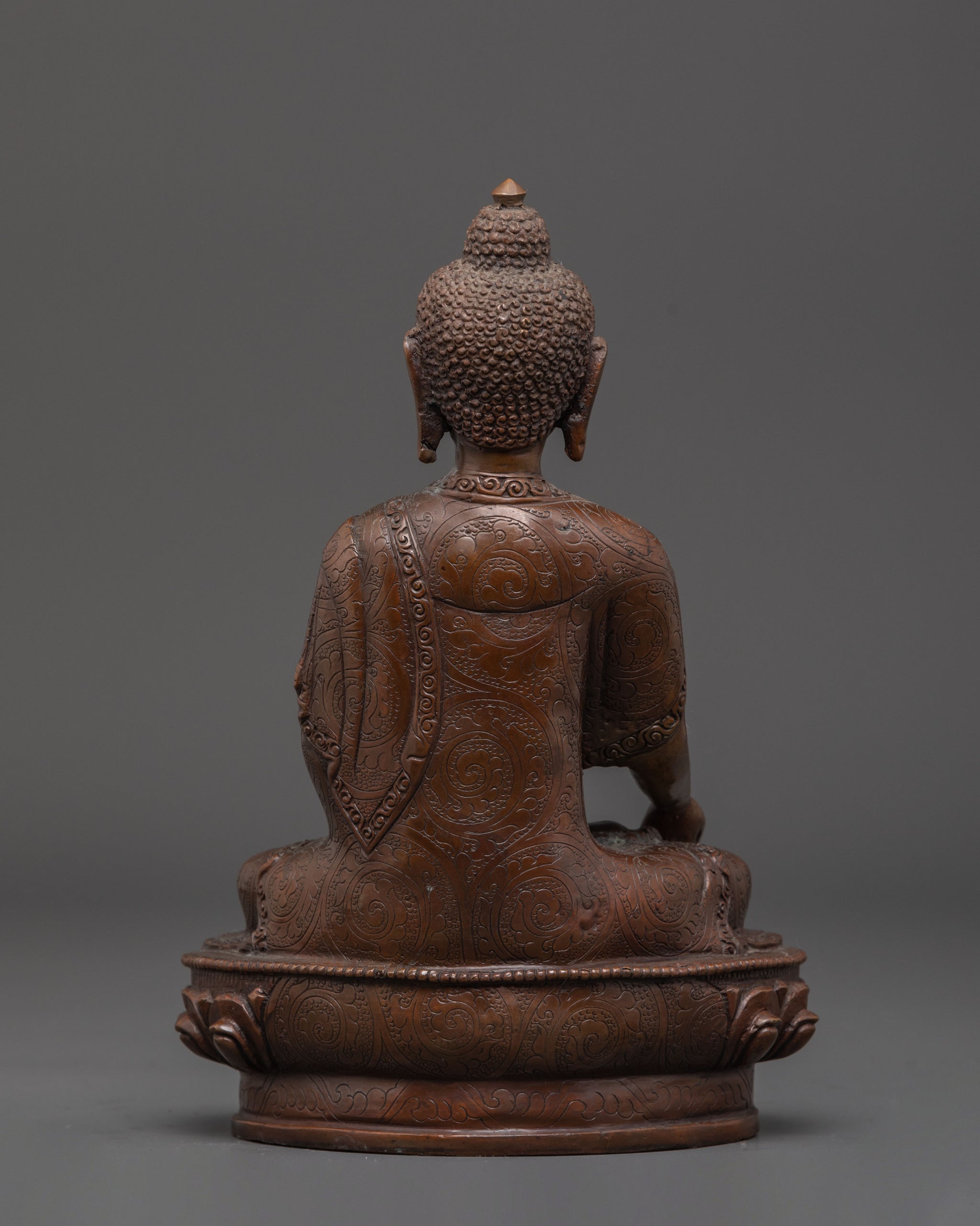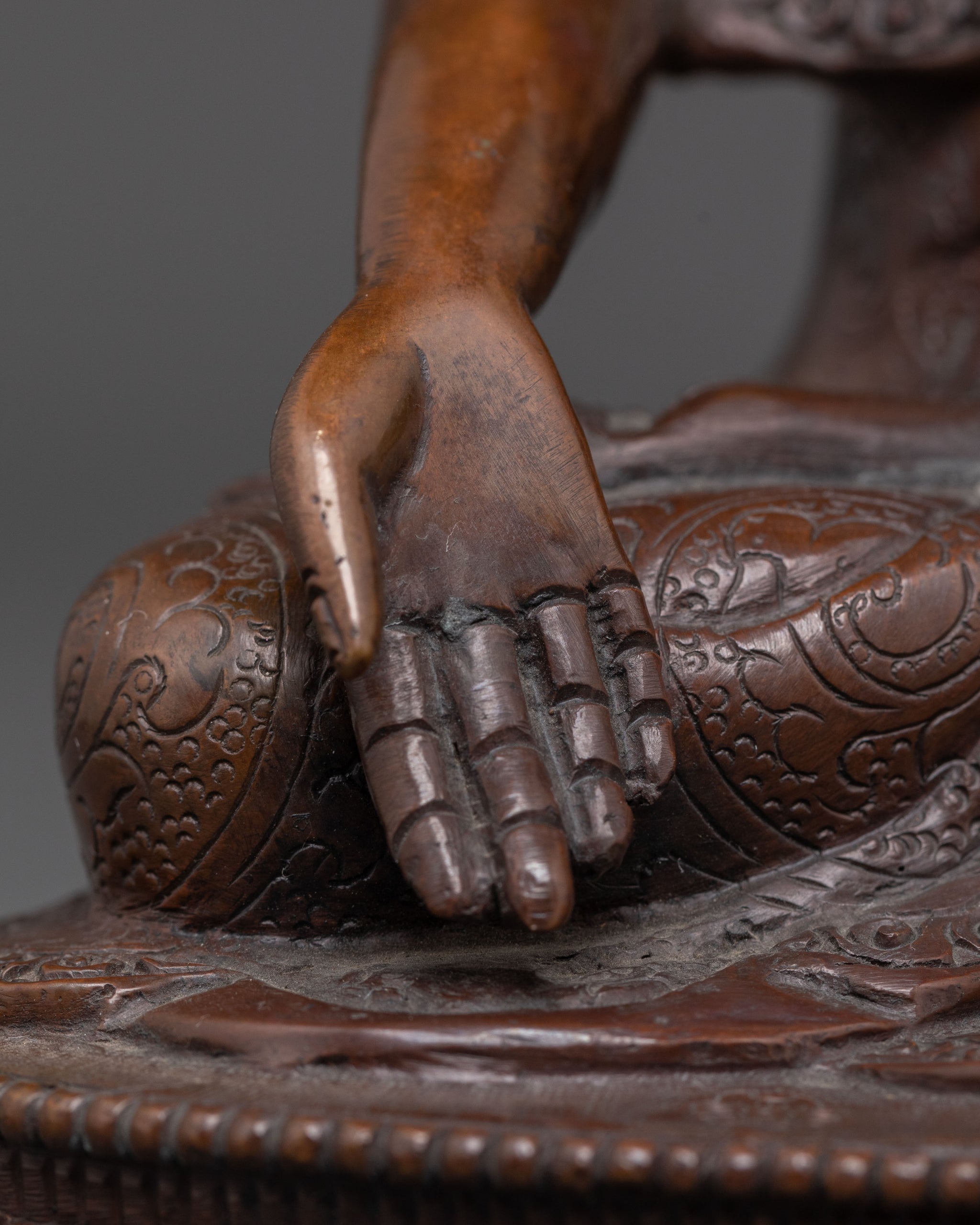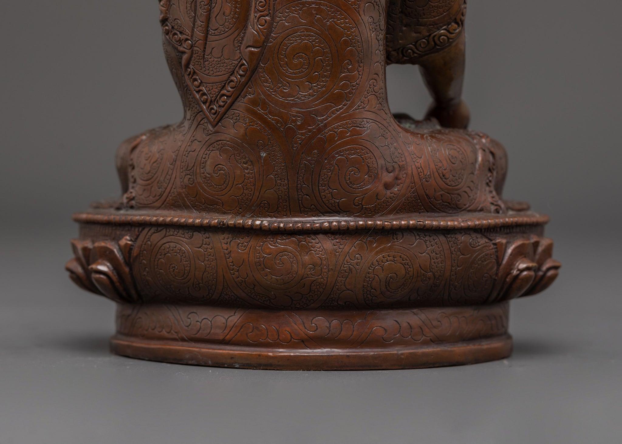 The handmade Ratnasambhava Copper Statue stands 8.3” (21 cm) tall with a 5.5” (14 cm) base and weighs 1.13 kg. Expertly handcrafted from oxidized copper, it highlights the serene presence of Ratnasambhava, the Buddha of Wealth and Abundance. This statue is ideal for those seeking blessings of prosperity, generosity, and inner balance in their spiritual practice or home décor.
