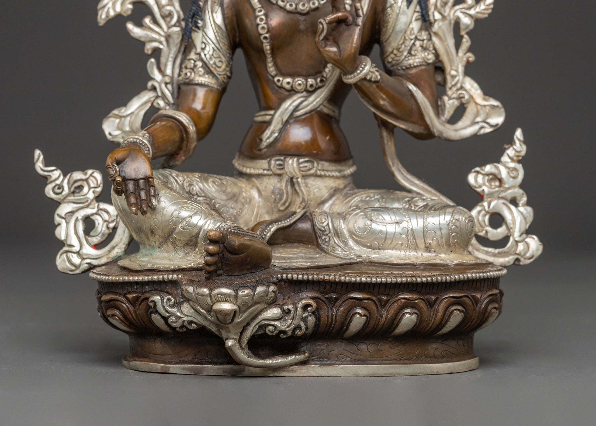 This Handmade Shyama Tara Oxidized Statue, known as the "Mother of All Buddhas," stands at 12.8 inches (32.5 cm) in height and 9.4 inches (24 cm) at the base, weighing 3.30 kg. Made from an oxidized copper body with silver-plated details, this statue radiates a serene and powerful presence. Designed by talented Nepalese artisans, this detailed sculpture is ideal for altars, meditation areas, or as a meaningful decor item for individuals seeking awareness in their daily life.