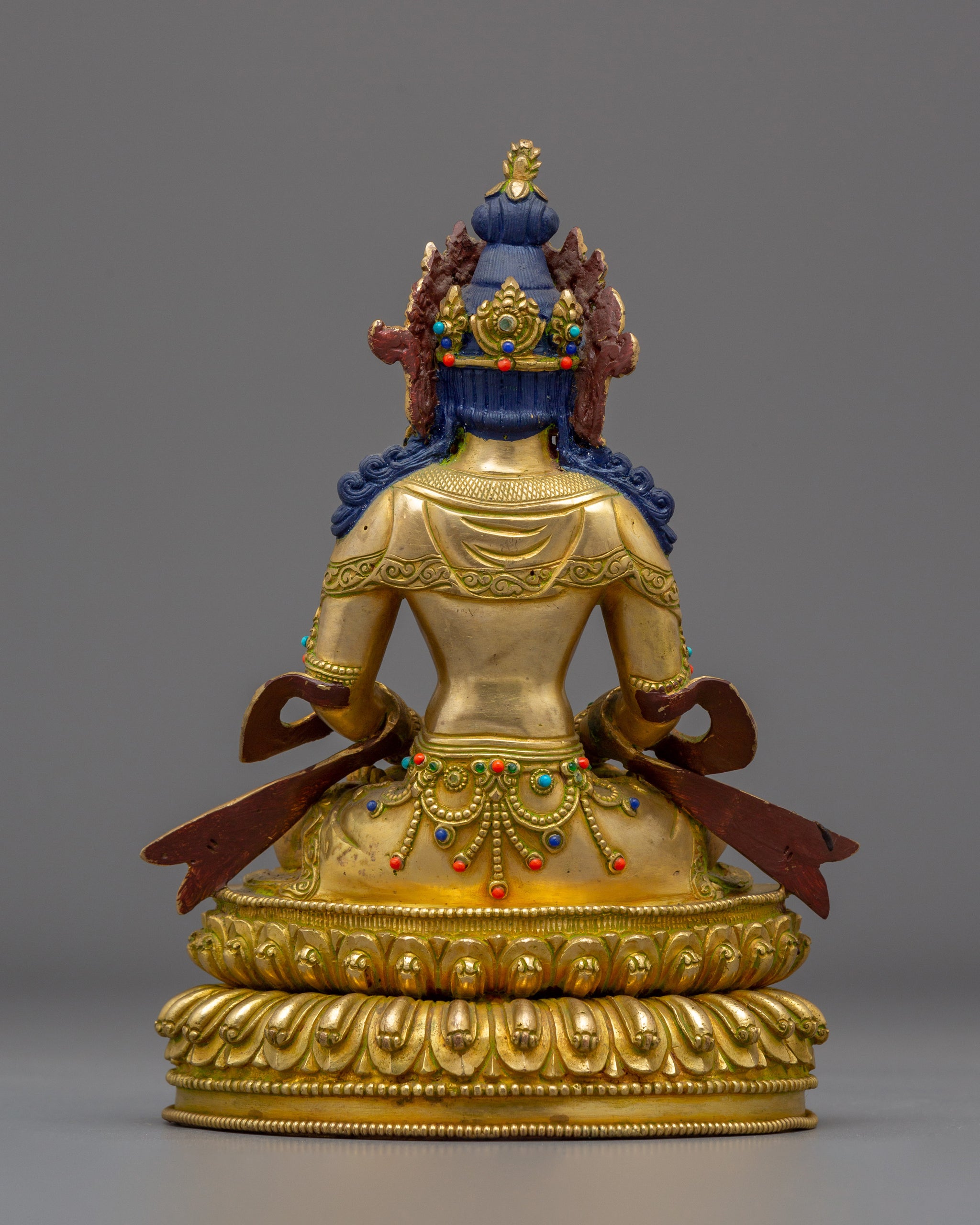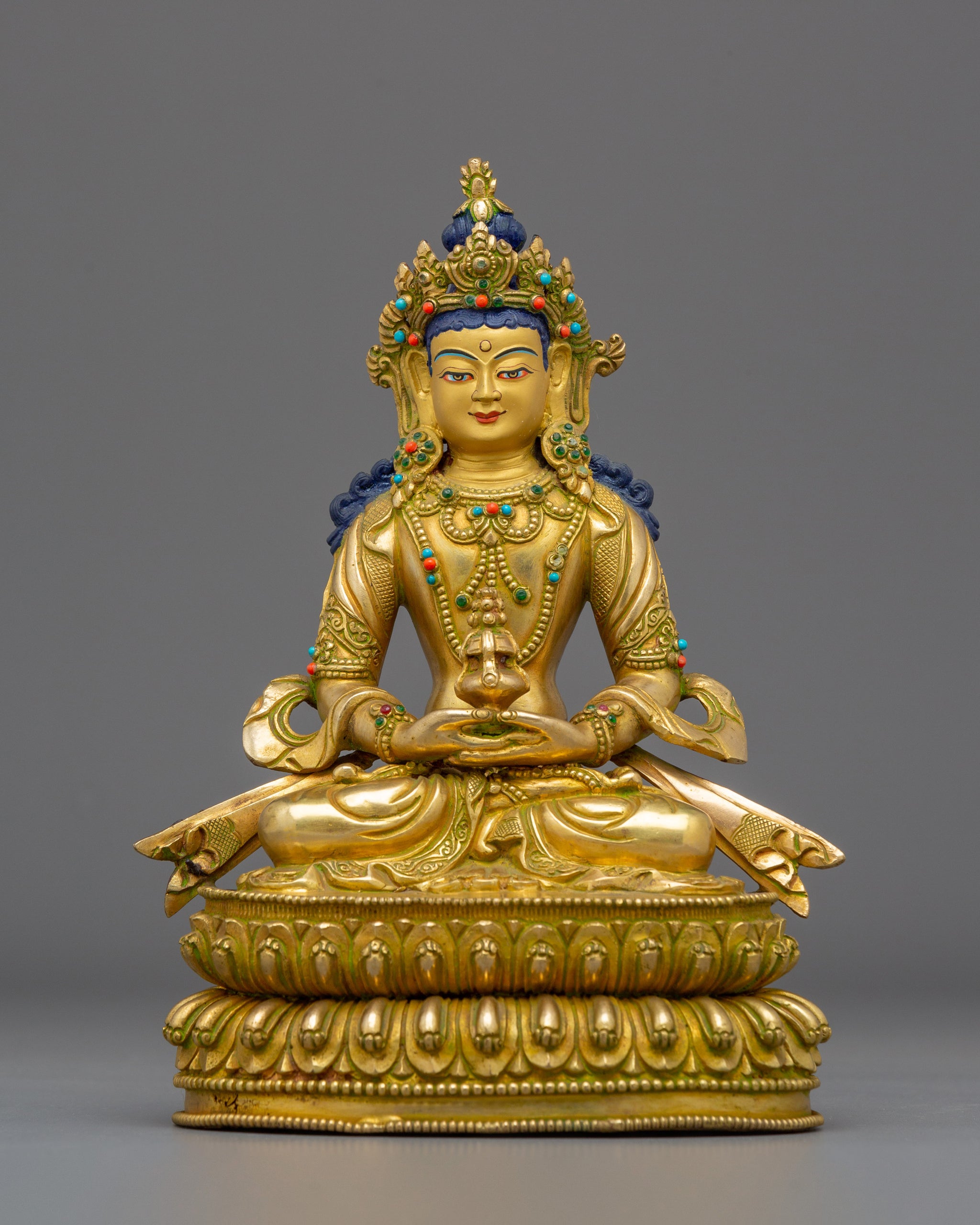 This handmade statue of Amitayus, the Buddha of Longevity, measures 8.7 inches (22 cm) in height and 6.3 inches (16 cm) in width, with a weight of 1.76 kilograms. Skillfully crafted from a copper body and adorned with 24K gold gilding, gold and acrylic paintings, and gemstones, the statue reflects the refined artistry of traditional Himalayan craftsmanship. Created by a skilled Nepali artisan, it serves as a meaningful representation of long life and spiritual well-being, ideal for altars, meditation spaces, or sacred collections.