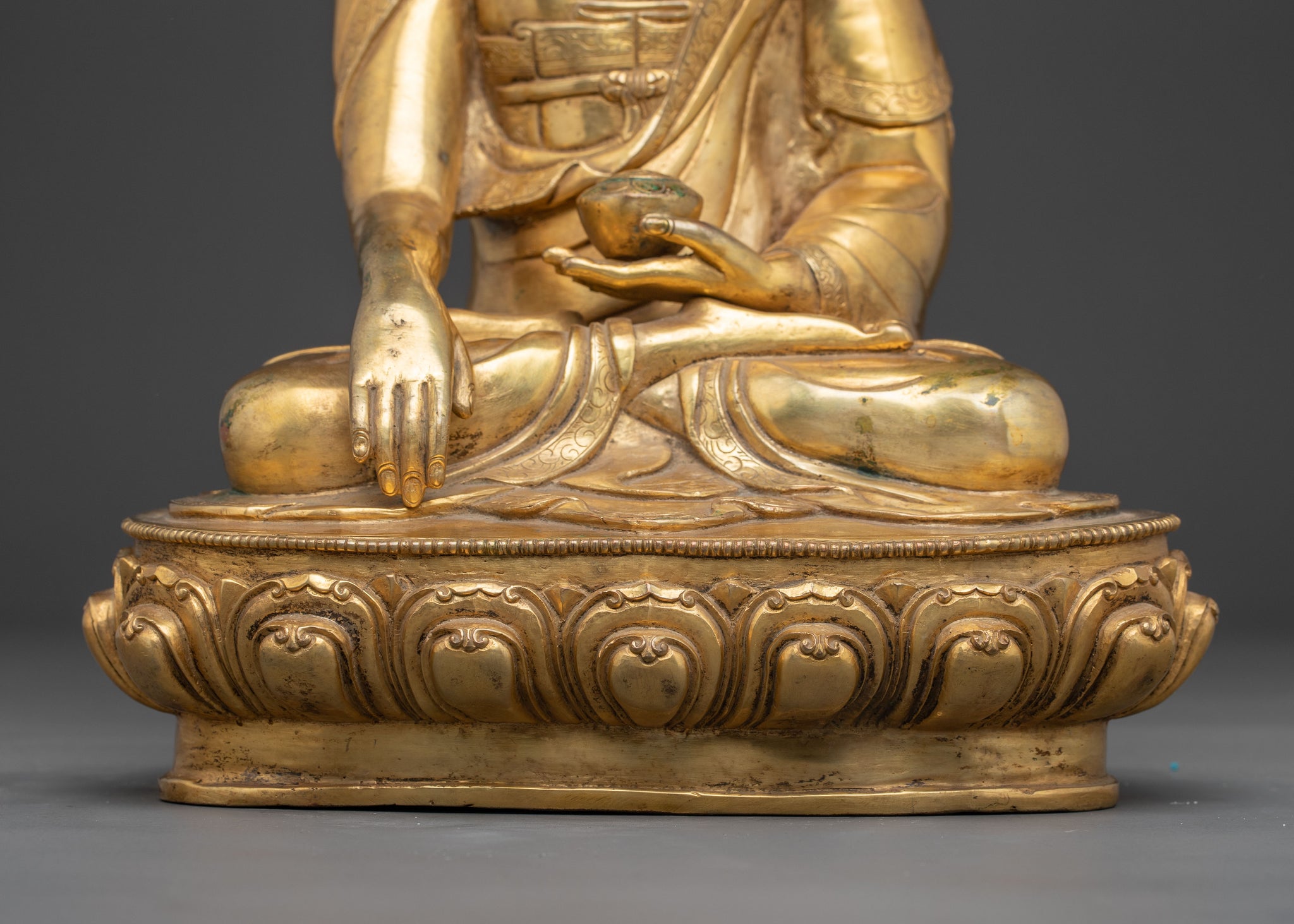 Shakyamuni Buddha sits in peaceful meditation, his right hand touching the earth in the bhumisparsha mudra, marking the moment he attained enlightenment. In his left hand rests a delicate alms bowl, symbolizing simplicity and renunciation. Crowning his head is the uṣṇīṣa, a sign of profound wisdom, while his half-closed eyes invite you to share in his serene awareness. Draped in a plain monastic robe, he embodies the humble path of liberation. Seated in the vajra posture on a lotus pedestal, he reflects stability, purity, and spiritual growth. This finely crafted statue captures the timeless grace and inner strength of the awakened one.