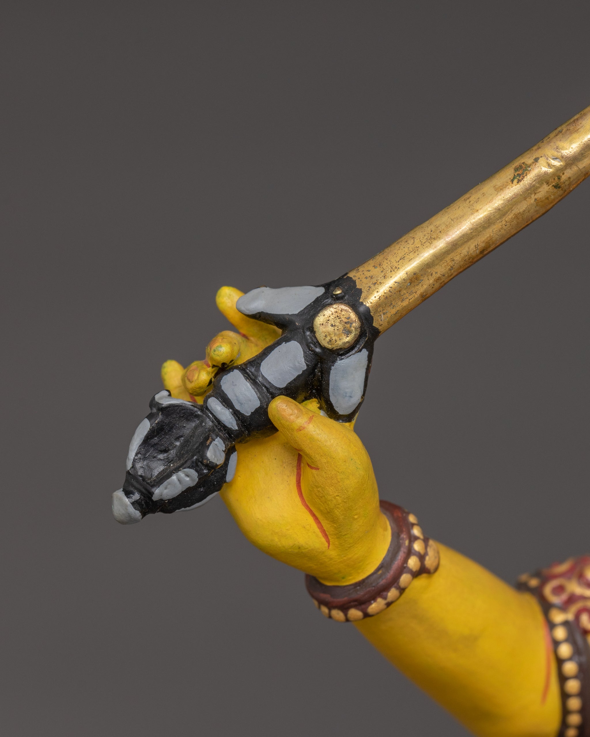 The handmade statue of Manjushri, the Wisdom Bodhisattva, stands at 8.7” (22 cm) in height with a base width of 5.9” (15 cm). Weighing 1.43 kg, it is crafted from a copper body, adorned with 24K gold gilding and detailed gold and acrylic paintings. This exquisite piece reflects traditional Himalayan craftsmanship, making it a meaningful addition to any spiritual altar, meditation space, or collection of sacred Buddhist art.