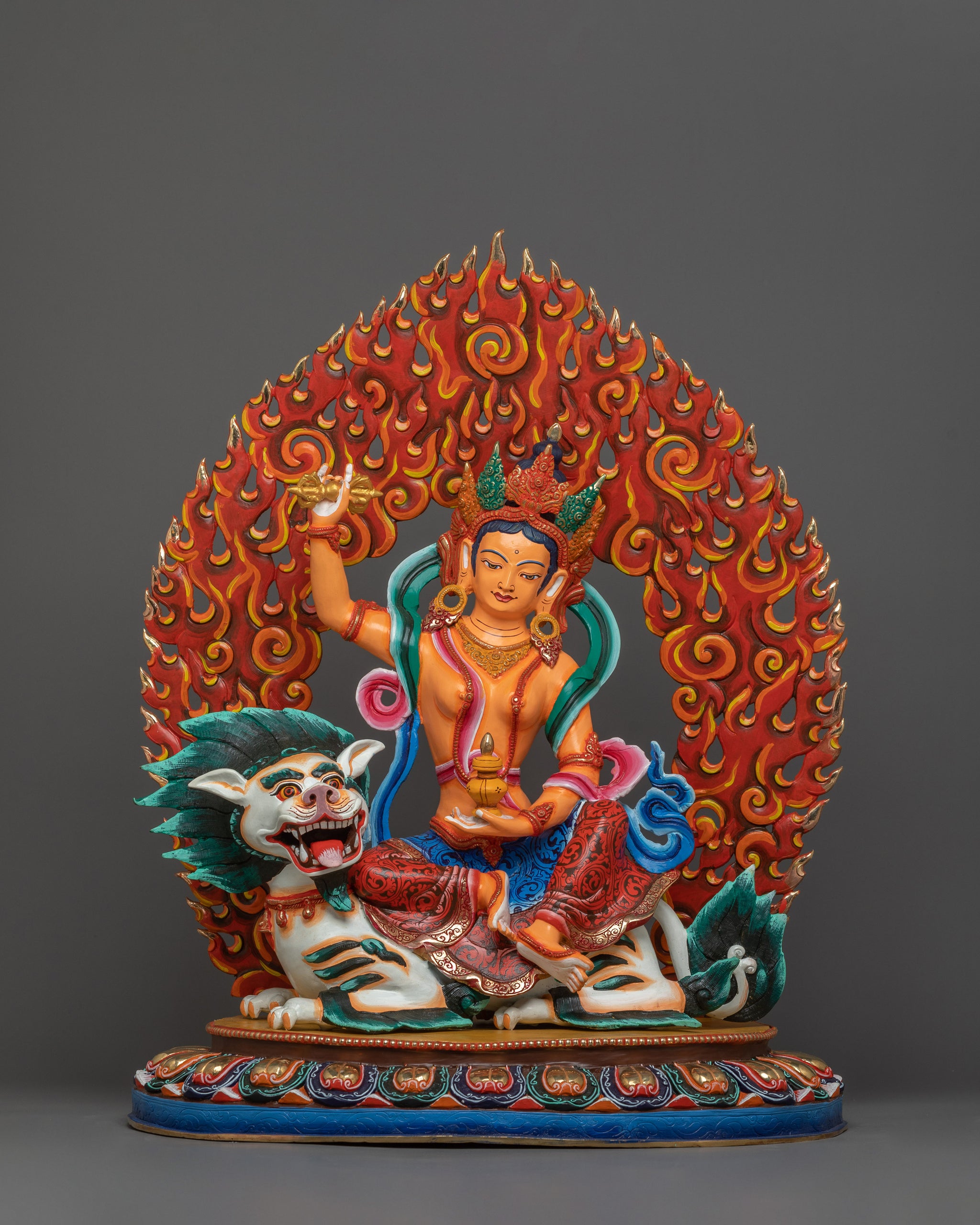Vajrayogini is stunning. The details are amazing. It's easy to make out her facial expressions, skulls, feet, and the ring of fire around her. You can tell she's handmade. There is a consecration hole in her back.