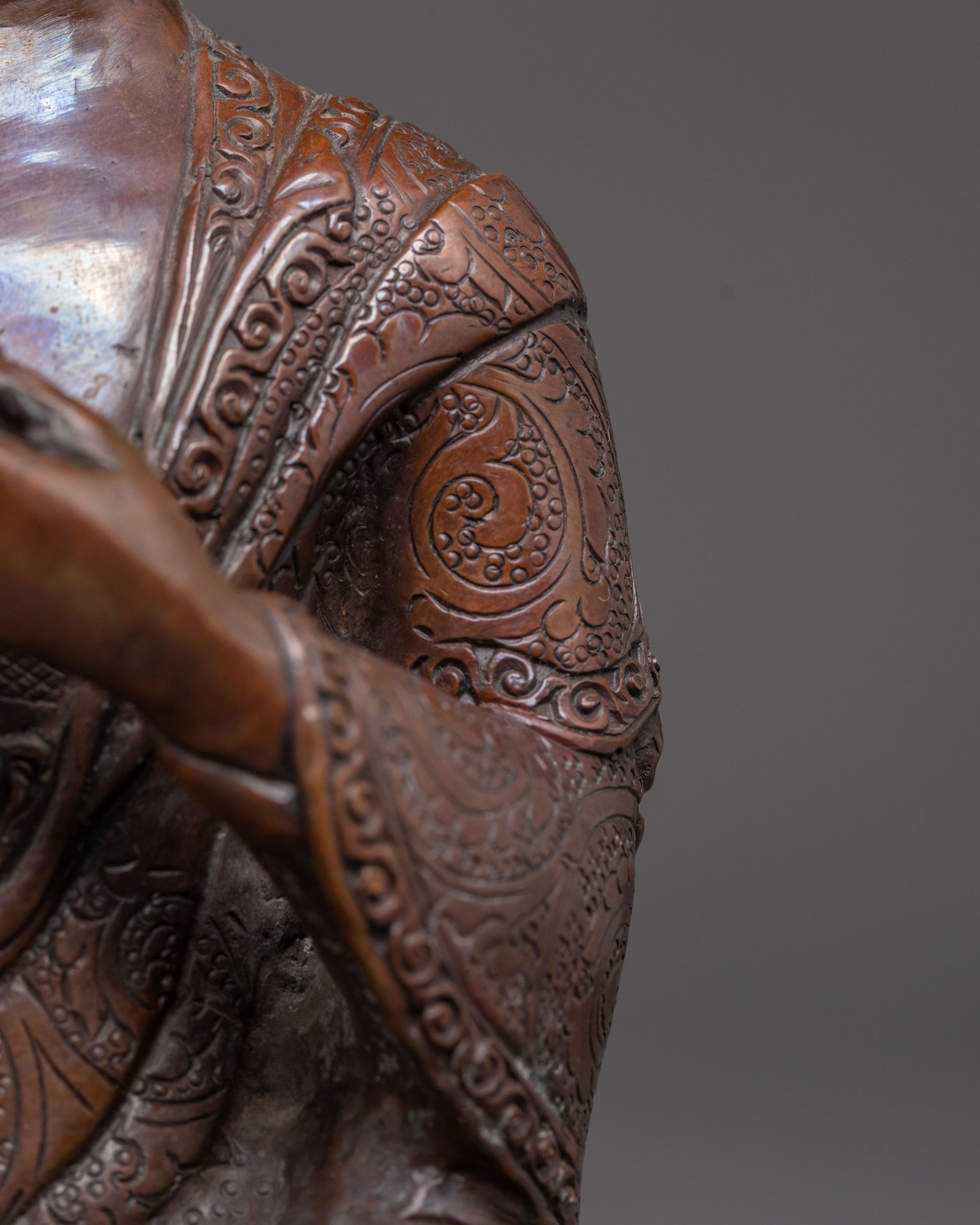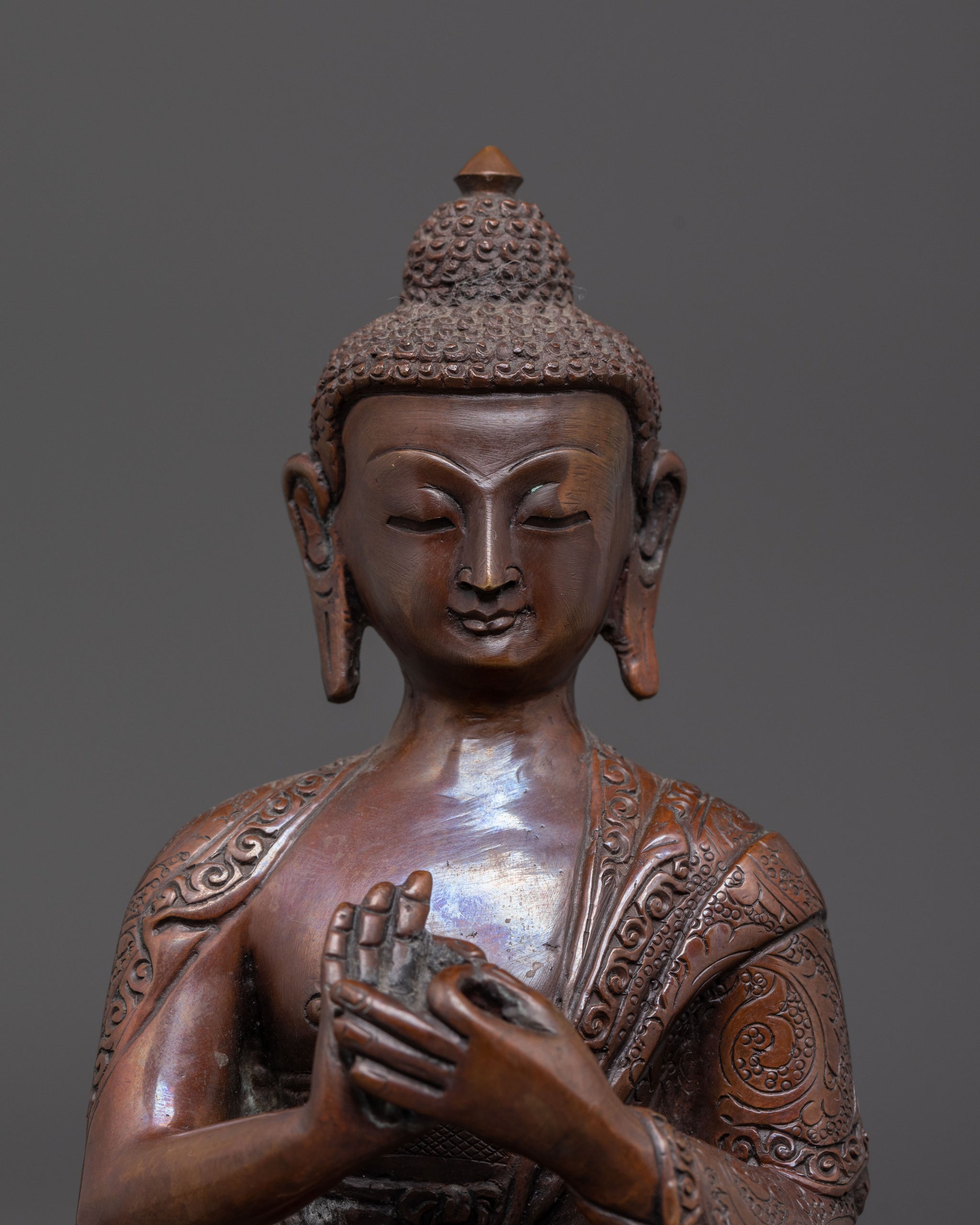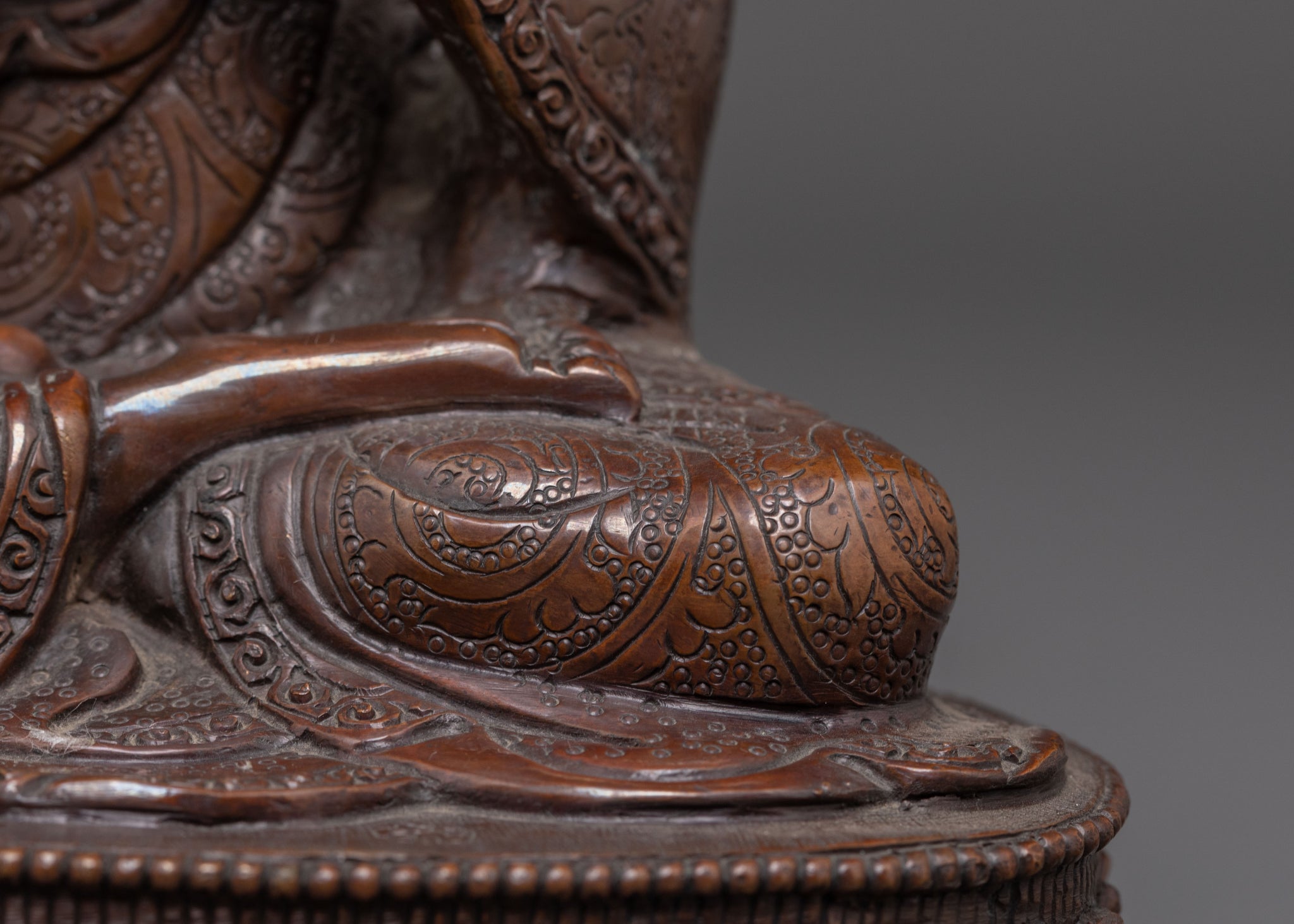 This oxidized copper handmade Vairocana sculpture captures the cosmic essence of the primordial Buddha, embodying universal truth and transcendental wisdom. This statue is made up of an oxidized copper body. Seated in padmasana (lotus posture), Vairocana emanates calm and boundless awareness, radiating the light of dharma to all realms. His serene expression and meditative stance invite a sense of inner stillness and clarity, making this statue a powerful addition to any spiritual altar or meditation space.