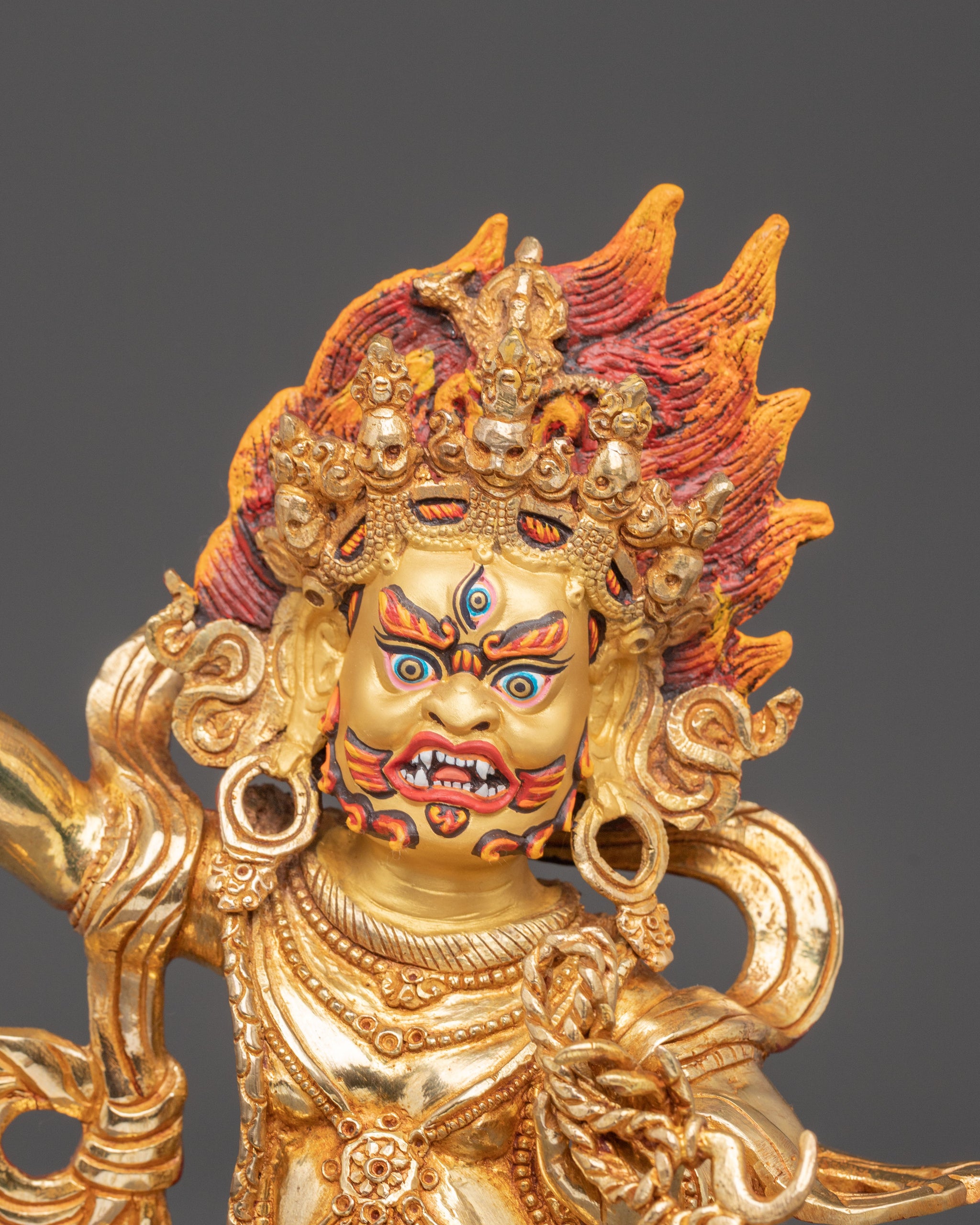The statue portrays Vajrapani with his right hand raised holding a vajra, symbolizing indestructible power, while his left hand holds a lasso to subdue hostile forces. He is adorned with a five-skull crown, signifying spiritual mastery, and encircled by a flaming aureole, representing his wrathful energy that dispels obstacles. His wrathful expression reflects his fierce determination to protect the Dharma. This statue captures the essence of Vajrapani as the guardian of the Buddha’s teachings, embodying strength, protection, and transformation.