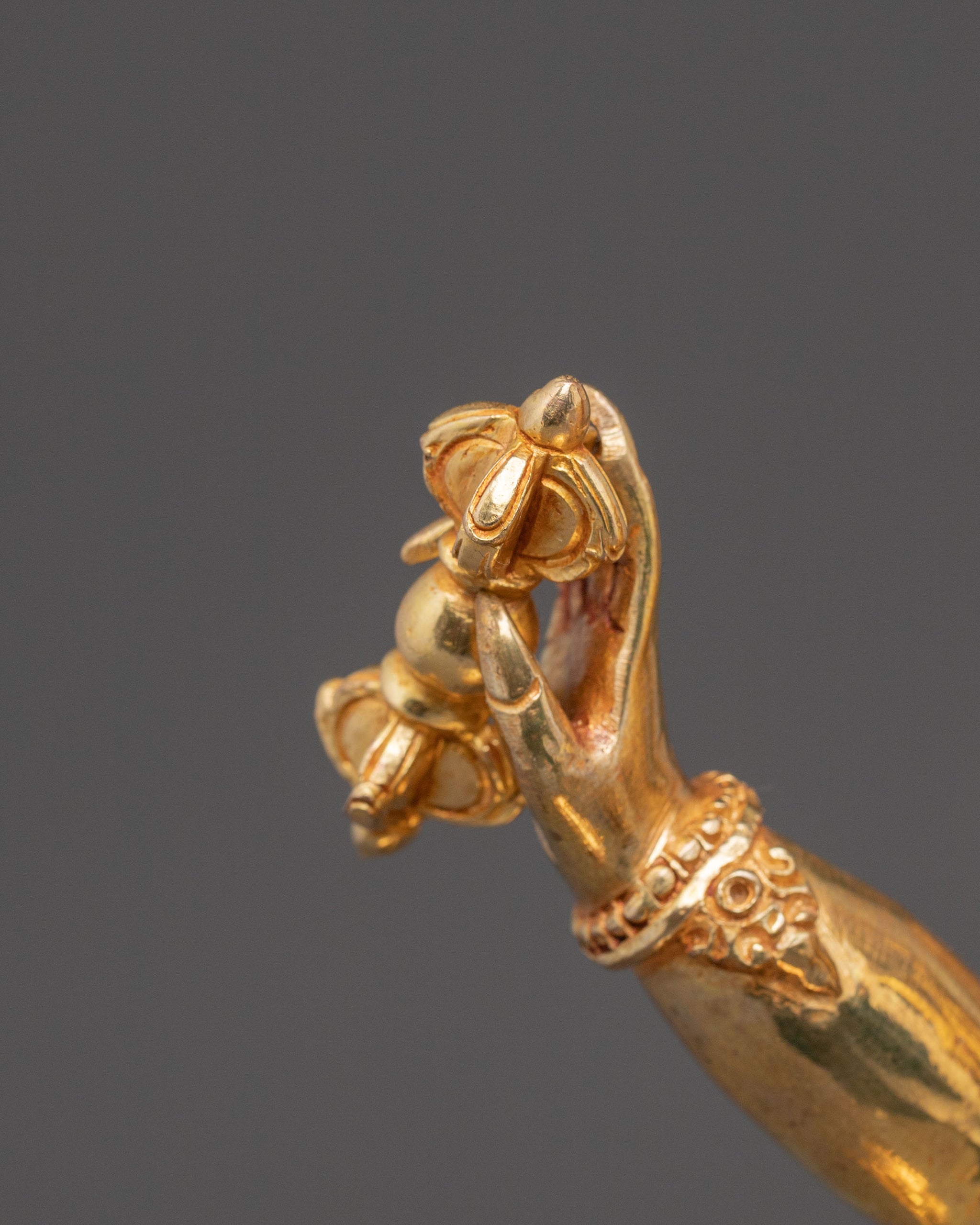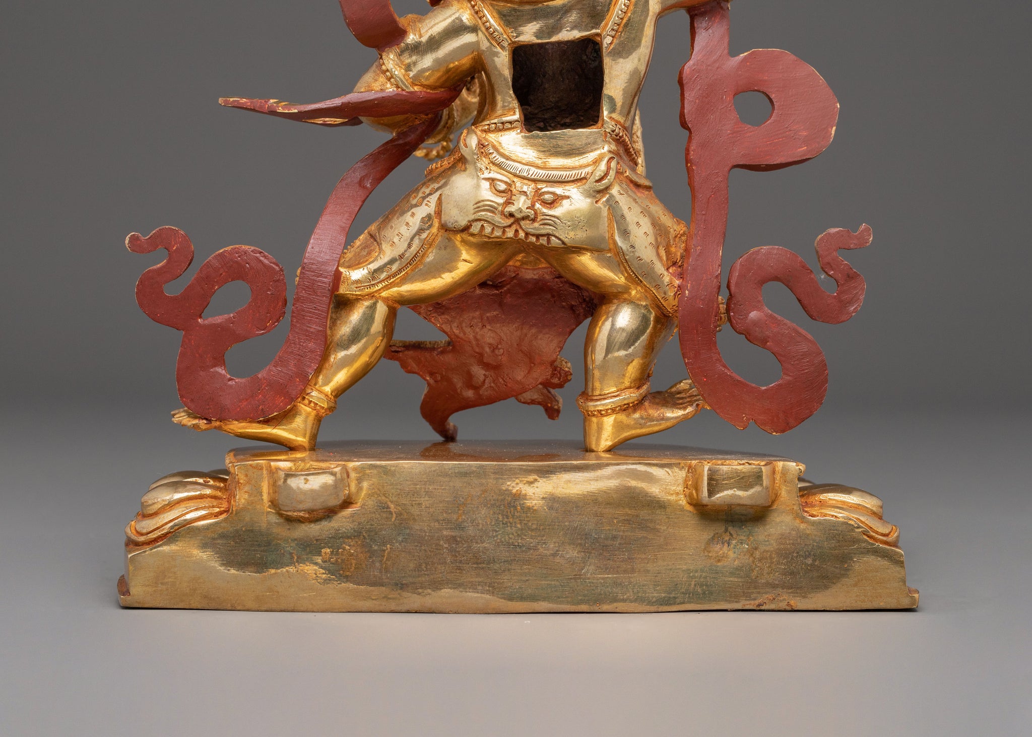 Handmade Vajrapani Statue of Protection measures 12.6” (32 cm) in height and 9.8” (25 cm) at the base, weighing 3.30 kg. Crafted from copper with 24K gold gilding and detailed gold and acrylic paintings, it embodies traditional Himalayan artistry. Representing the fierce protector of the Dharma, Vajrapani is ideal for enhancing meditation spaces, altars, or collections with powerful spiritual presence.