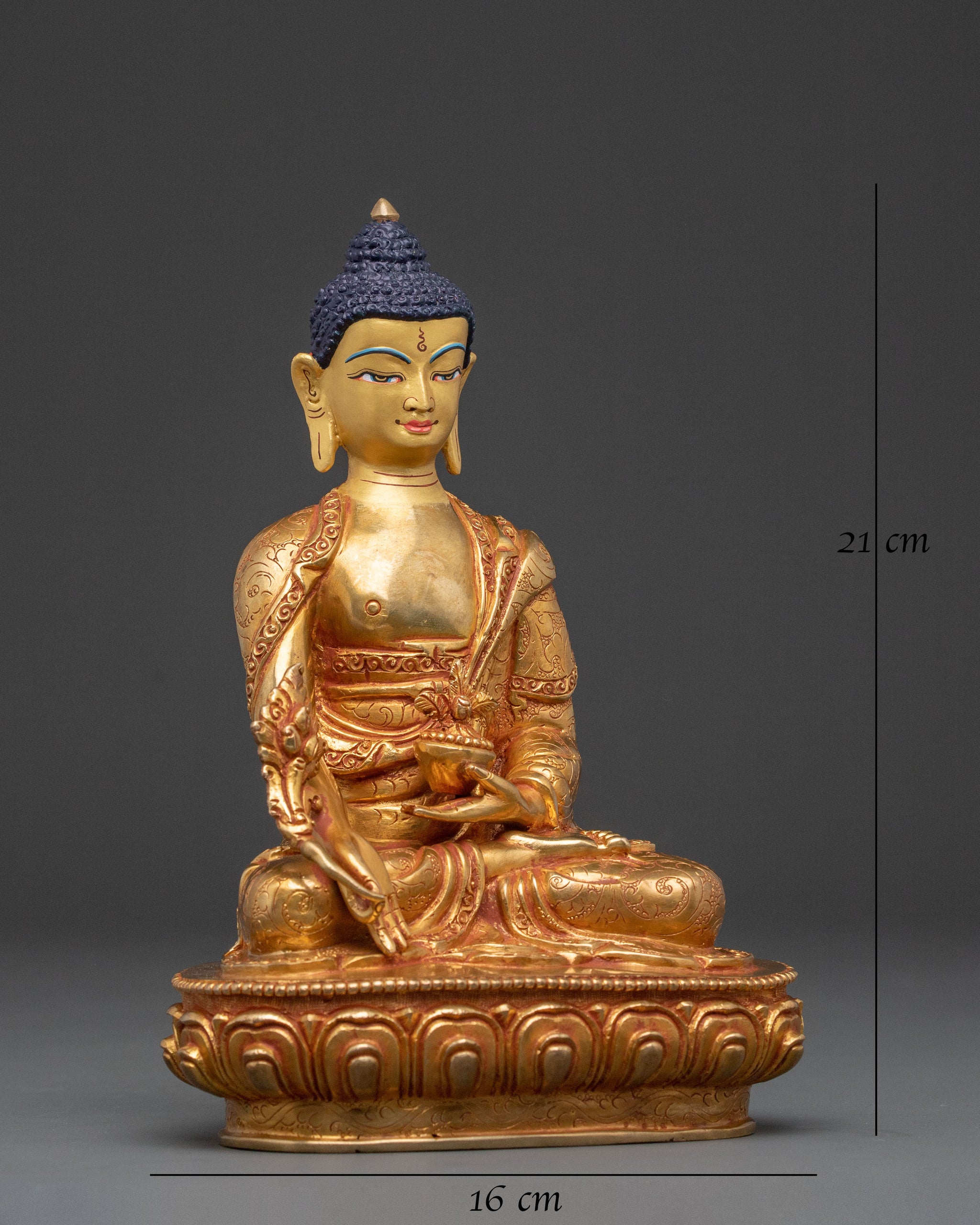 Radiating deep compassion, Medicine Buddha is depicted here in a meticulously handcrafted statue, bringing forth an aura of profound healing and spiritual solace. This 21cm tall sculpture, made from a copper body, glows with the warmth of 24K gold gilding, inviting peace into any sacred space. It serves as a gentle reminder of inner well-being and enlightened recovery, a significant piece of Buddhist art.