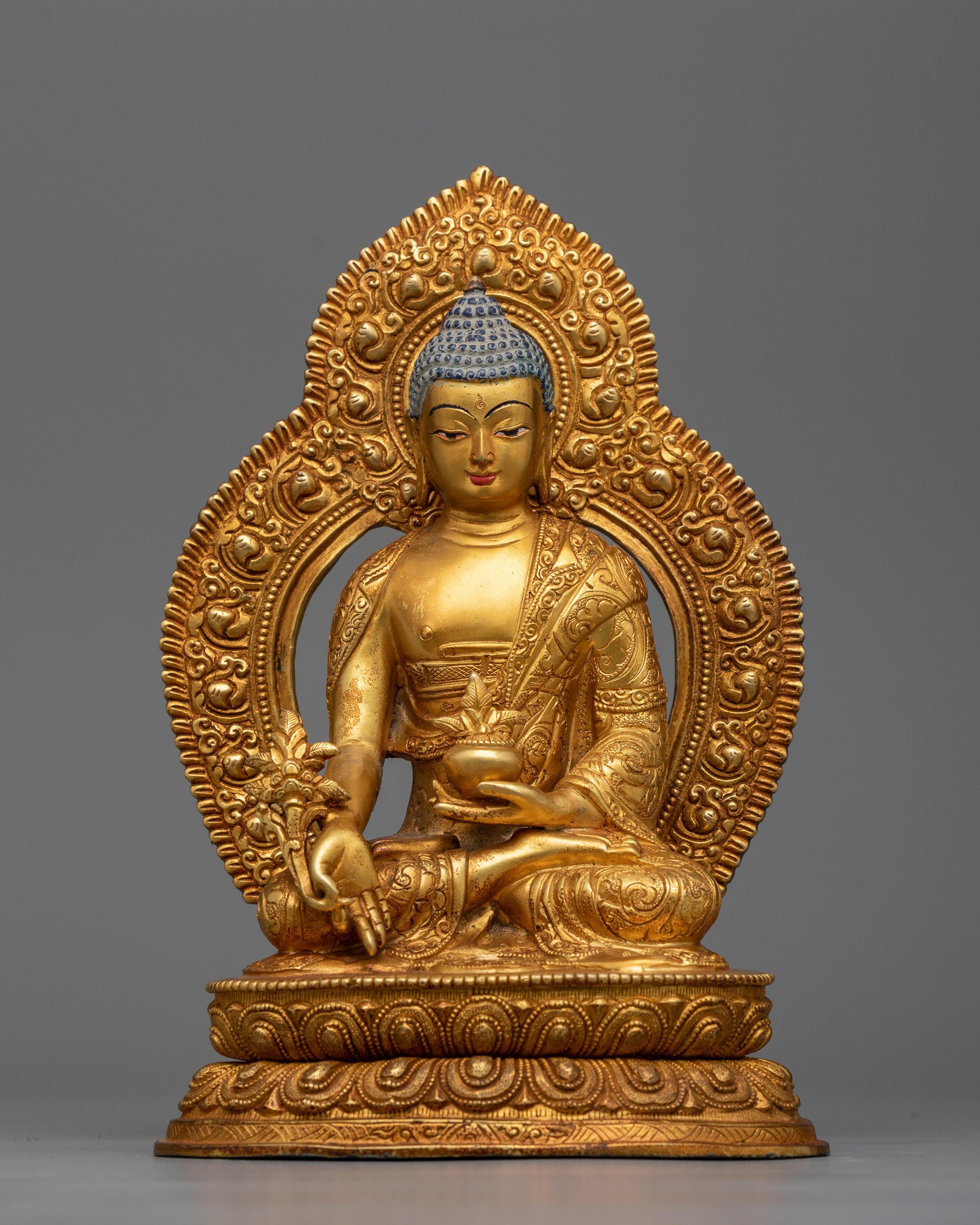 Each minute detail of this statue, expertly sculpted from a robust copper core, conveys passion and skill. It's a vision of peace and grace, adorned with 24k gold gilding and accented with superb acrylic paintings. The antique finish adds to its timeless beauty, luring one into a realm of inner tranquility and holistic health.