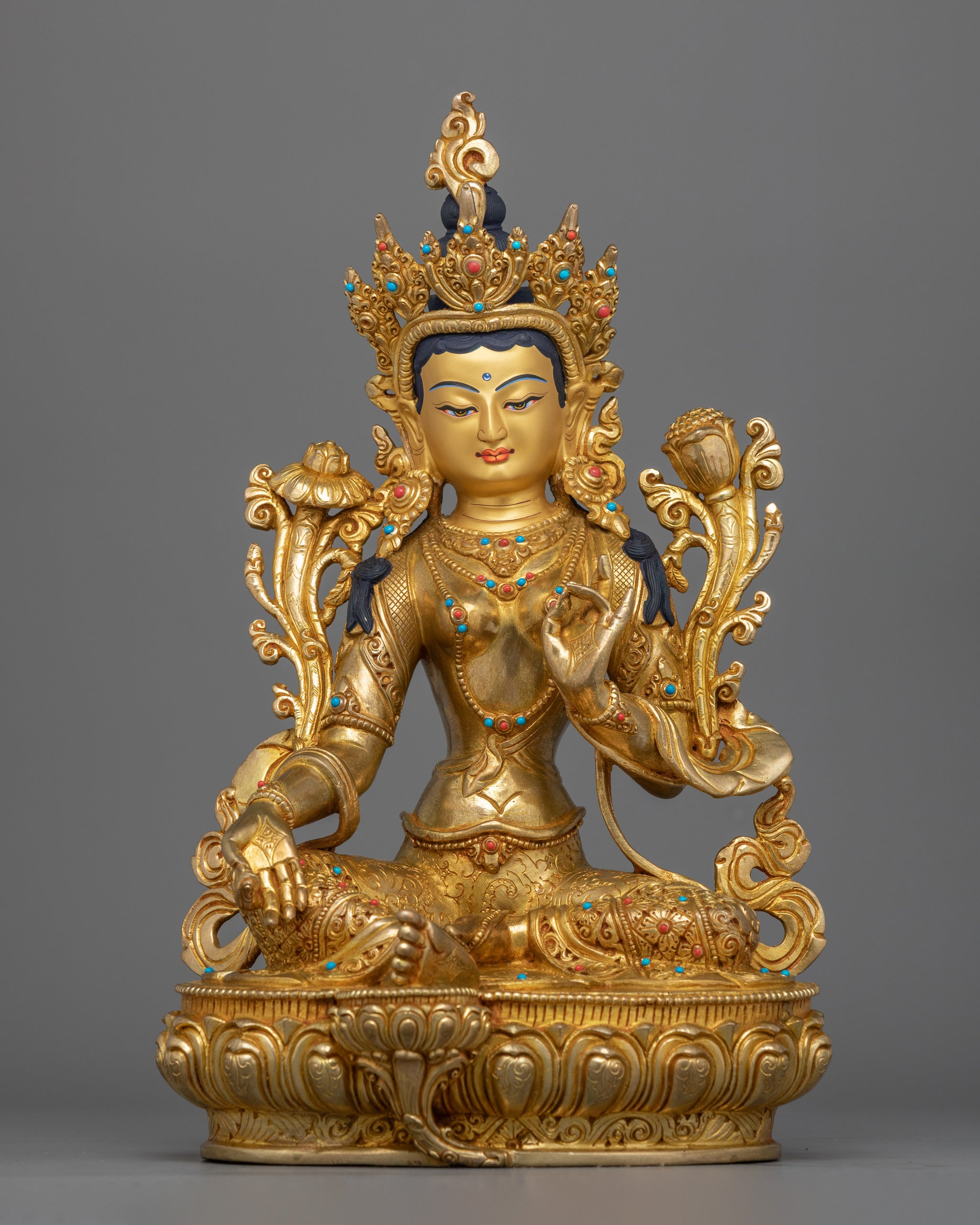 Representing this statue of Green Tara, the revered Bodhisattva known as the "Healing Deity," which is 13.2 inches tall with a 9.1-inch base, symbolizing her fast and compassionate spirit. The statue, made of copper and coated with 24K gold, is complemented with delicate gold and acrylic paintings that give it an ethereal aspect. The delicate details of her crown, jewelry, and flowing robes demonstrate the artist's extraordinary skill.