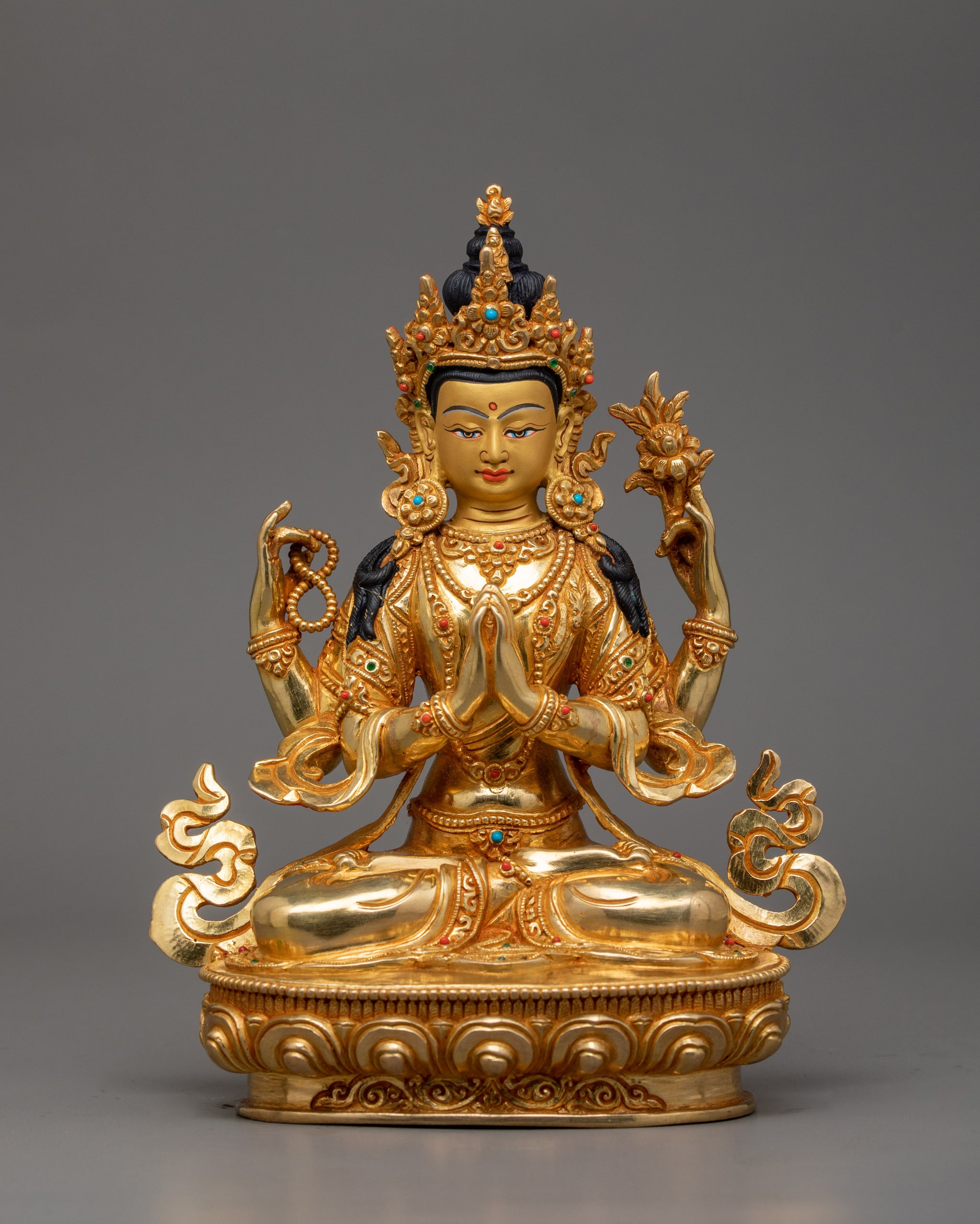 The Healing Deity Chenrezig Figurine is a finely crafted 8.7-inch (22 cm) tall and 6.7-inch (17 cm) wide representation of Avalokiteshvara, the Bodhisattva of Compassion. This Statue is crafted from a 24K Gold Gilded, copper body, gold and acrylic painting and gemstones. Designed by talented Nepalese artisans, this detailed sculpture is ideal for altars, meditation areas, or as a meaningful decor item for individuals seeking awareness in their daily life.