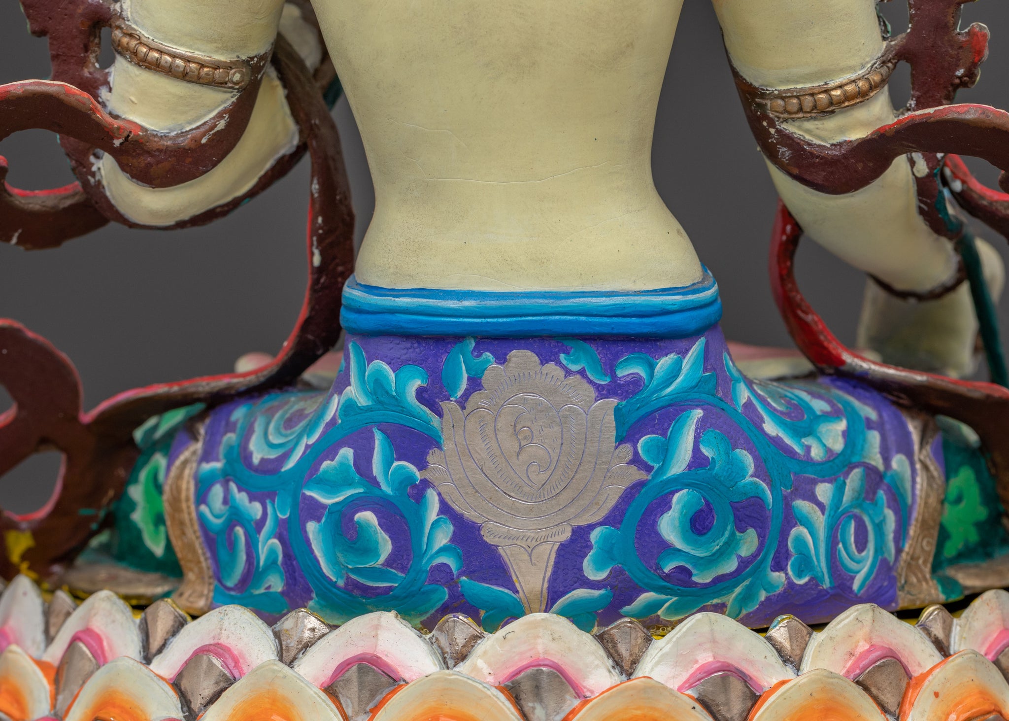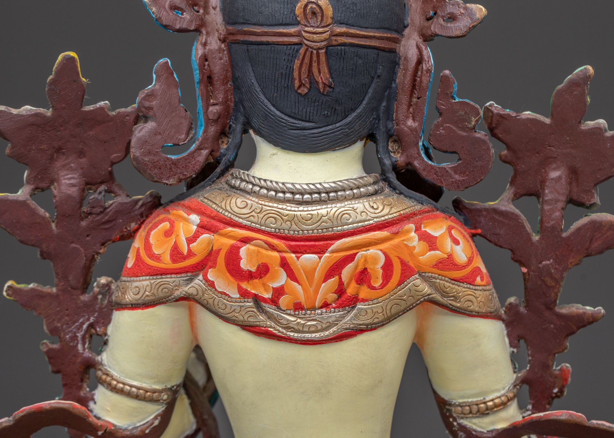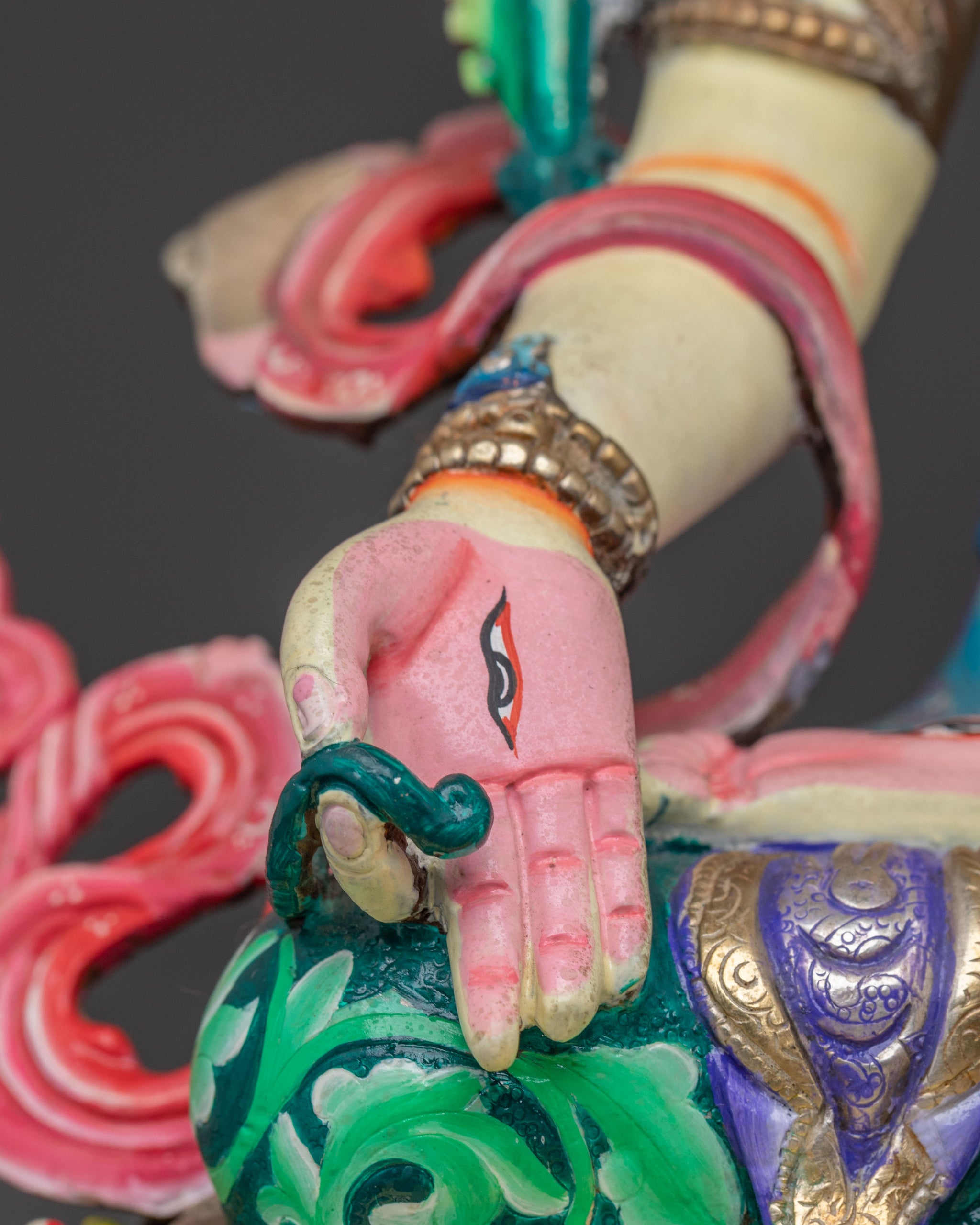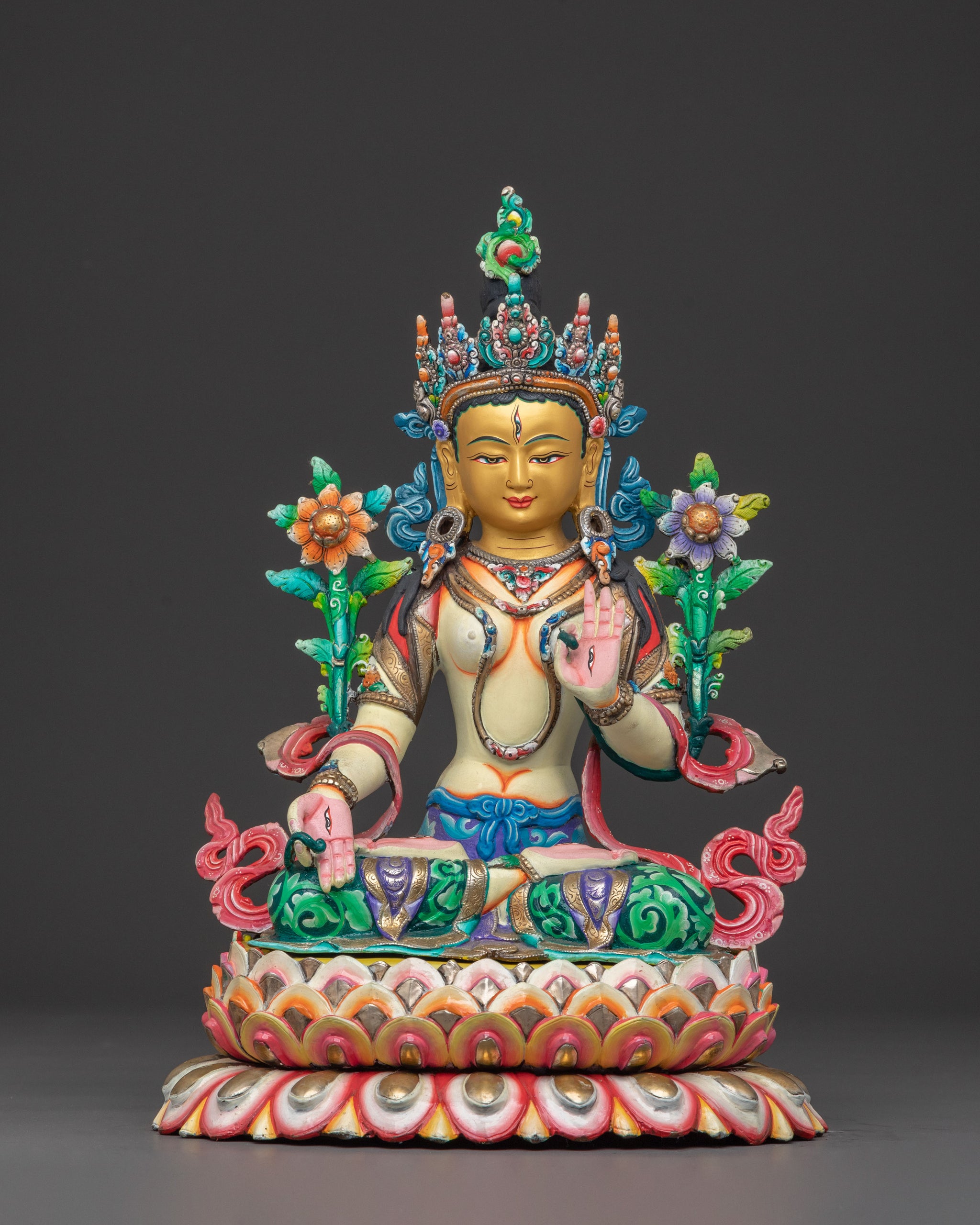 Adorned with the seven eyes of all-seeing compassion, White Tara extends her right hand in the mudra of supreme generosity, while holding a lotus stem in her left, symbolizing purity. Her gentle smile and serene posture evoke a sense of deep inner peace and healing. This symbolism invites practitioners to cultivate long life, wisdom, and freedom from suffering, central to her benevolent essence and a beautiful addition to any spiritual decor.