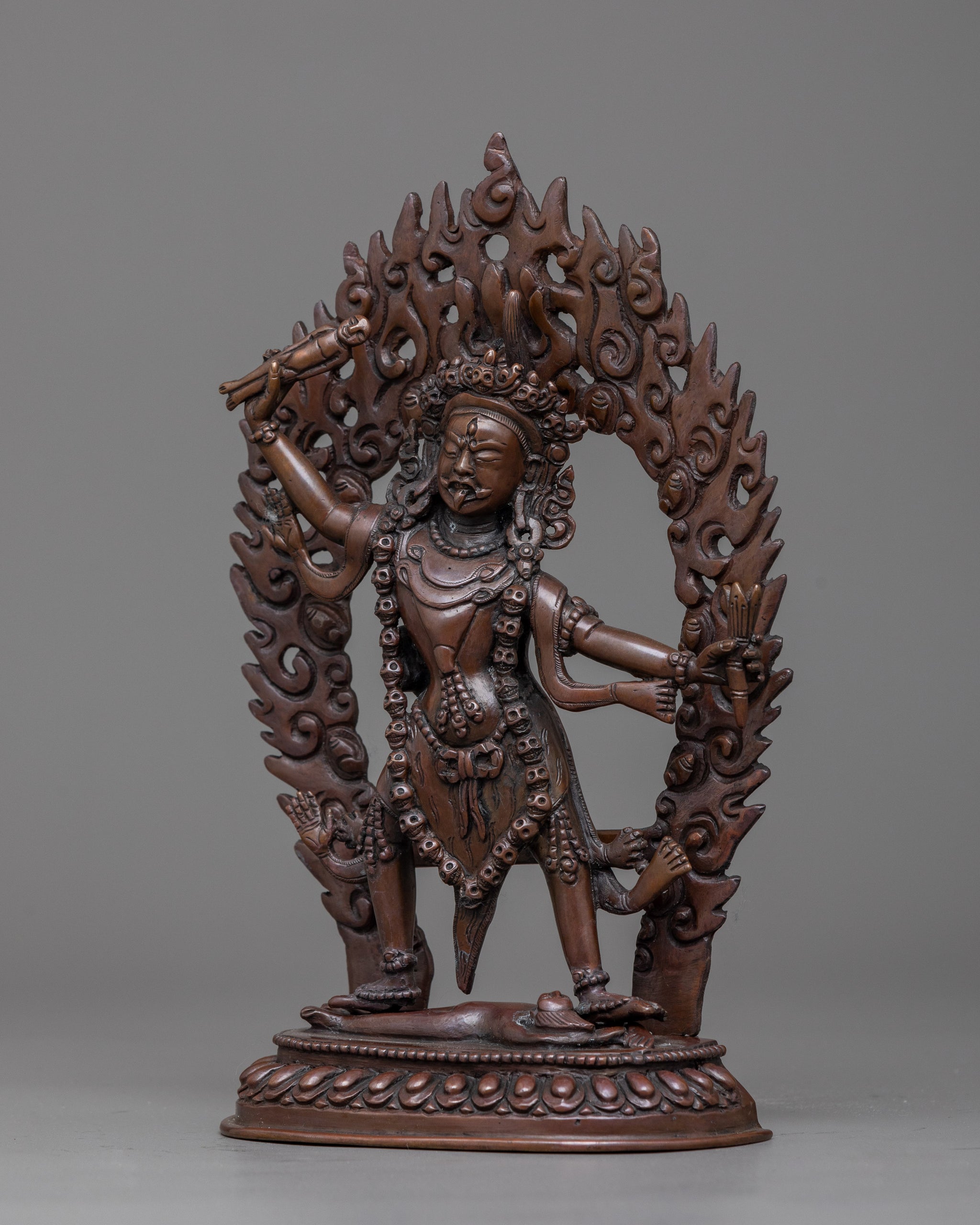 The Heruka Ekajati Statue, made of oxidized copper, aids spiritual meditation. It is 8.3 inches tall and weighs 1.05 kg. It exudes protection and power from above. The fierce protector deity Ekajati is shown in fine detail and is decked out in ornate embellishments. Her intimidating and strong appearance reflects a commitment to following the Buddha's teachings. Her vigorous posture represents her will to remove obstacles from the spiritual path.