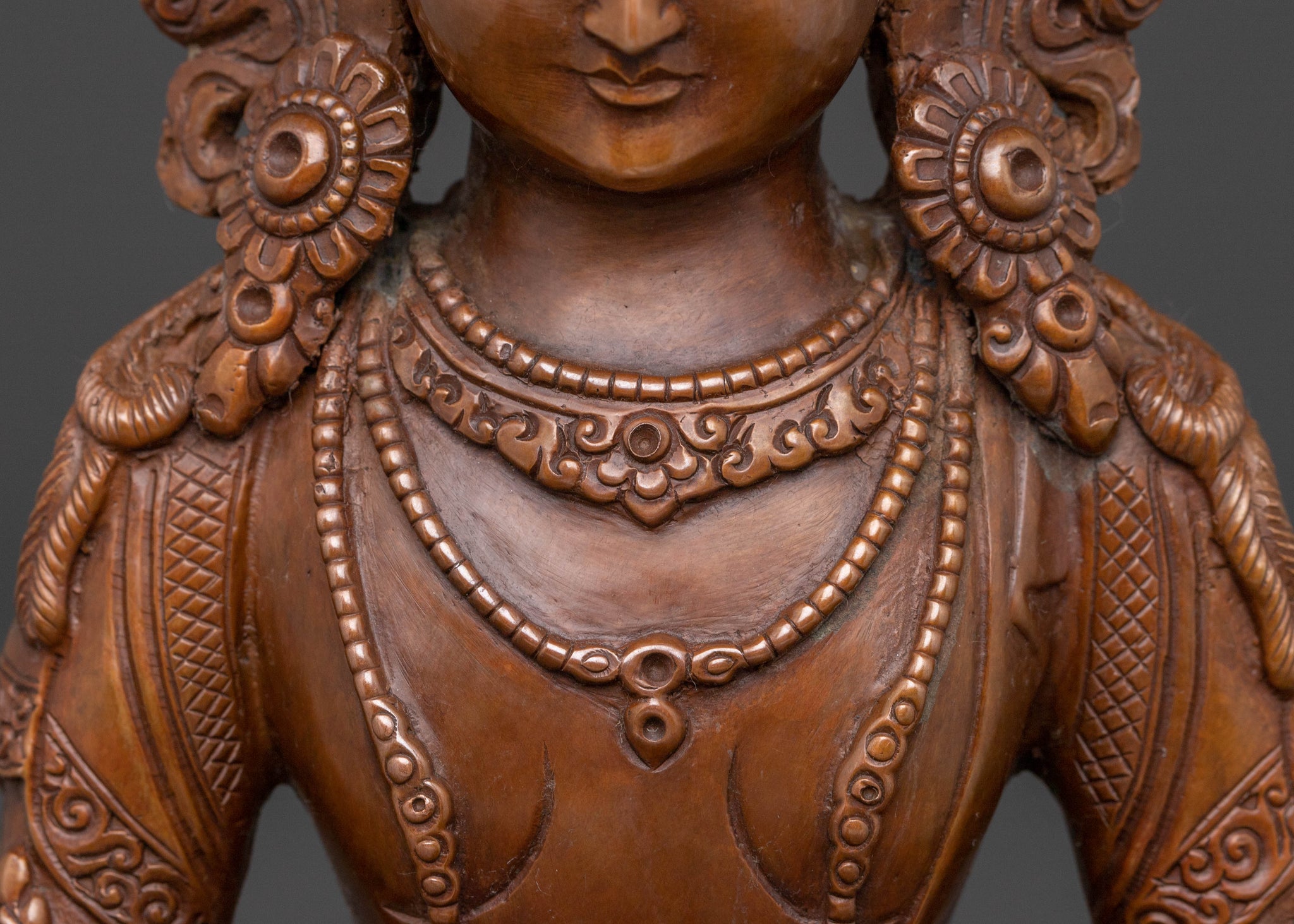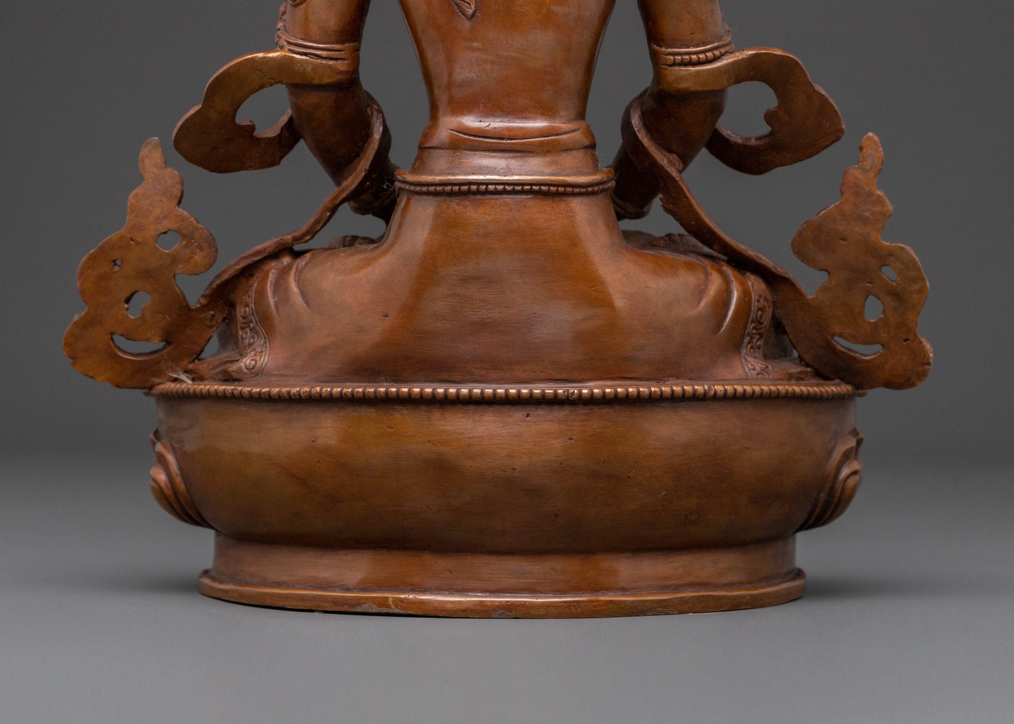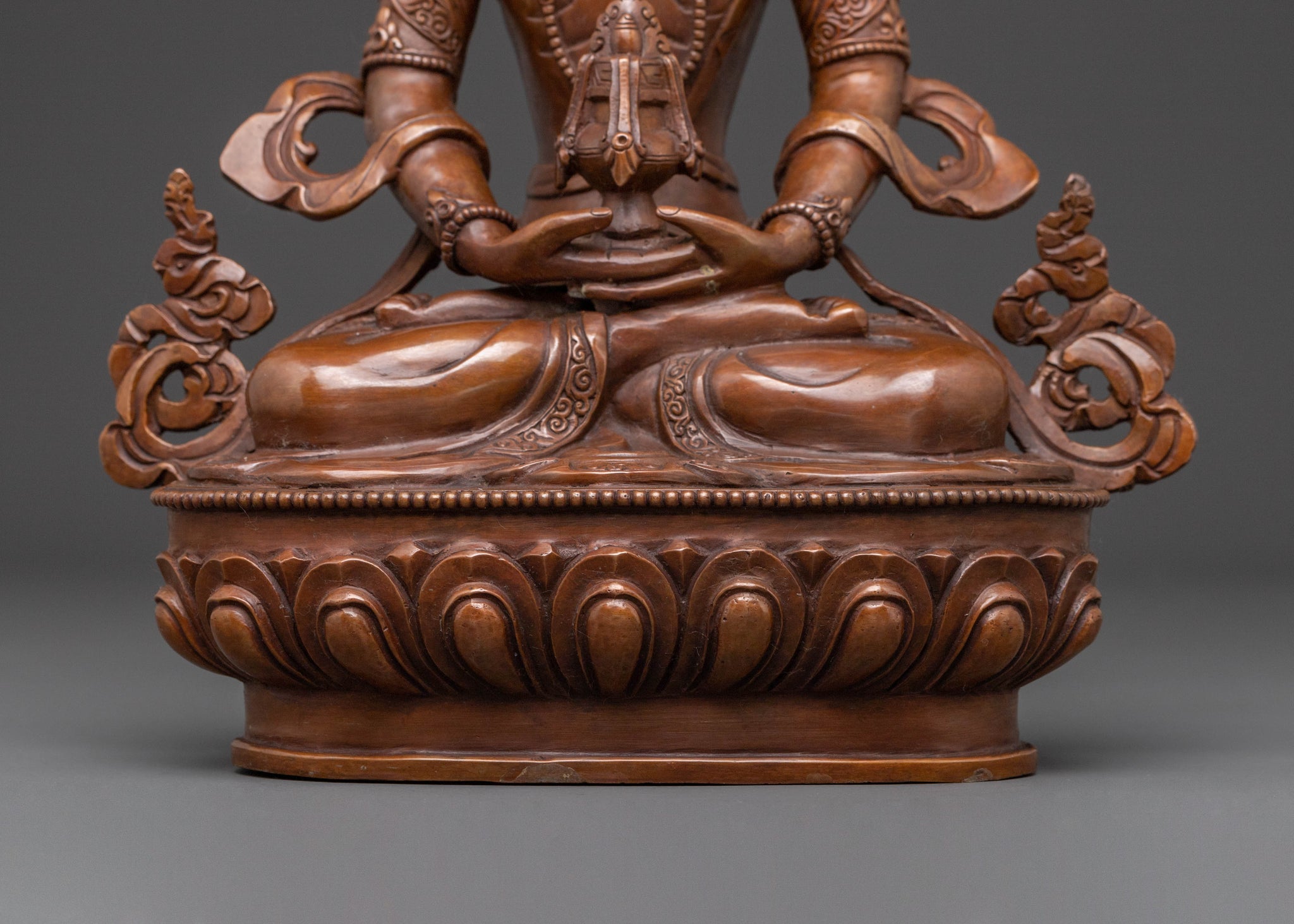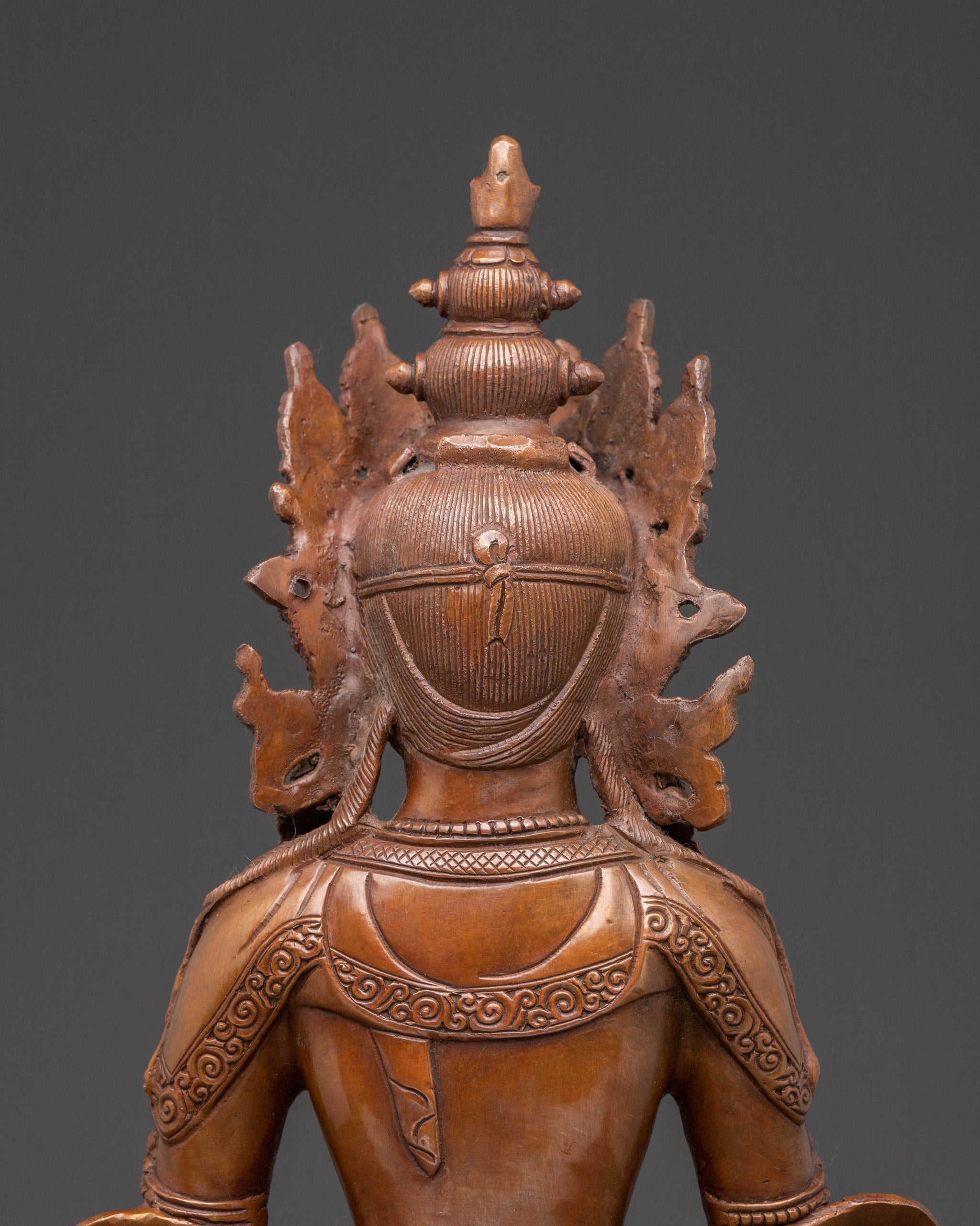 In profound stillness, Amitayus, the Buddha of Infinite Life, manifests in this exquisite oxidized copper statue. Standing 12.8” (32.5cm) tall with a 9.4” (24cm) base, this substantial piece weighs 3.18kg, radiating a grounded and tranquil presence. Its rich, dark patina offers a serene aesthetic, perfect for any spiritual decor.