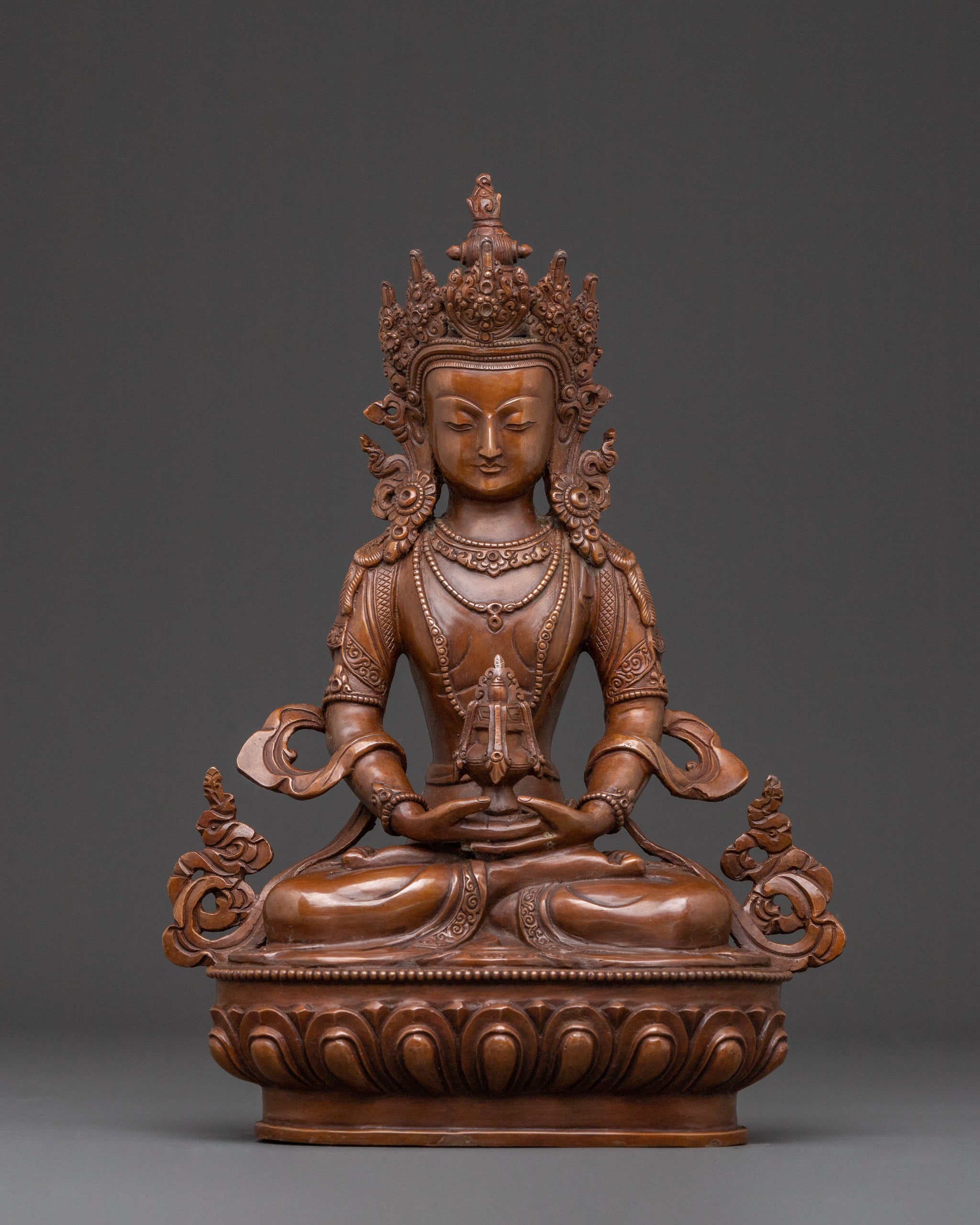 Amitayus is depicted in deep meditation, his hands gently holding the sacred vase of immortal nectar. This powerful iconography symbolizes the bestowal of longevity, good health, and accumulated merit. His serene form invites reflection on the boundless nature of life and the cultivation of inner peace.