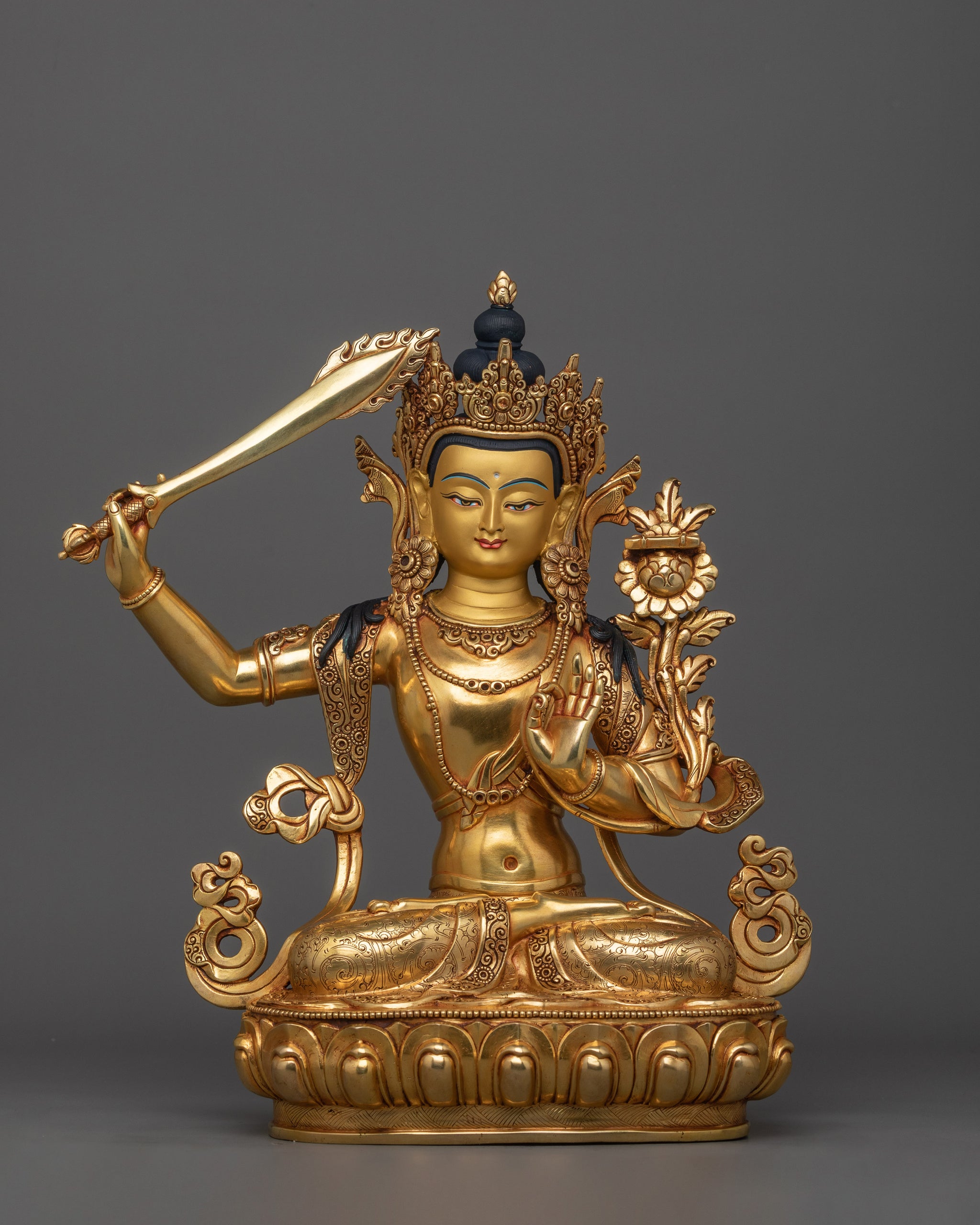The Himalayan Figurine of Manjushri statue stands at 13.8 inches (35 cm) in height, with a base measuring 11 inches (28 cm), and weighs 3.90 kg. Crafted with a copper body, covered with a triple layer of 24K gold gilding, and carved with deeply engraved carvings that produce a magnificent 3D-like effect.. The detailed gold and acrylic paintings enhance its intricate features, highlighting the wisdom and clarity that Manjushri represents. This Sculpture is handcrafted by expert Nepalese artisans, elegantly symbolizes Himalayan Buddhism's sacred traditions, making it an appropriate addition to altars, meditation places, or sacred collections.