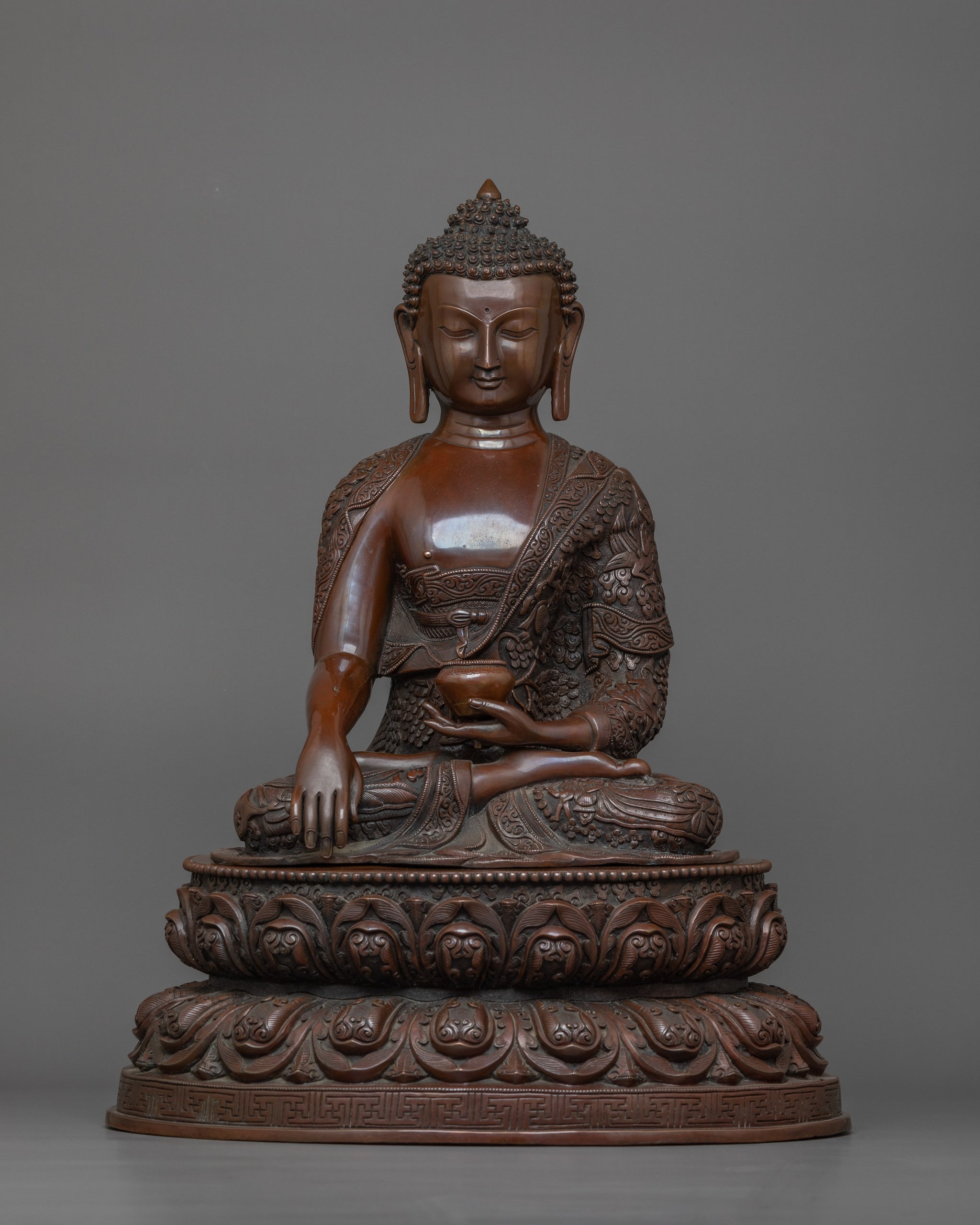 The Himalayan Sacred Buddha Shakyamuni Statue symbolizes the Buddha's deep teachings and the path to spiritual awakening. This handcrafted statue is 17.7" (Height) x 13.6" (Base) and weighs 7.67 kg. It is made of oxidized copper. This sacred statue, created by expert Nepalese artisans, represents the craftsmanship of Himalayan Buddhism, making it an inspirational addition to altars, meditation places, or sacred collections.