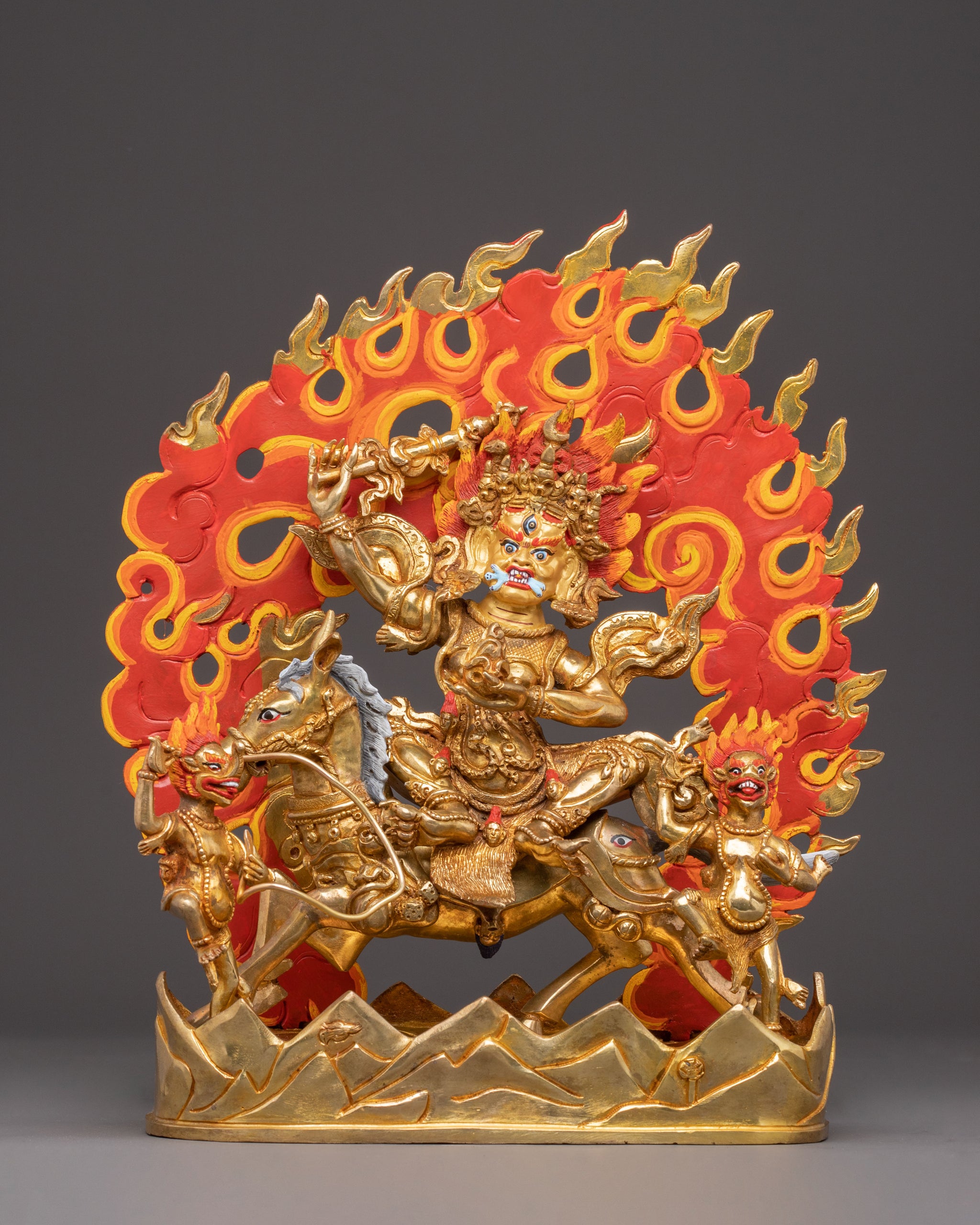 Palden Lhamo is revered as a strong protector of those who follow the spiritual path. As a deity of wrathful compassion, she removes impediments and offers spiritual protection. This lovely, gold-gilded copper statue of Palden Lhamo embodies her role as a fiery defender of the Dharma and is suitable for meditation and shrine decoration.