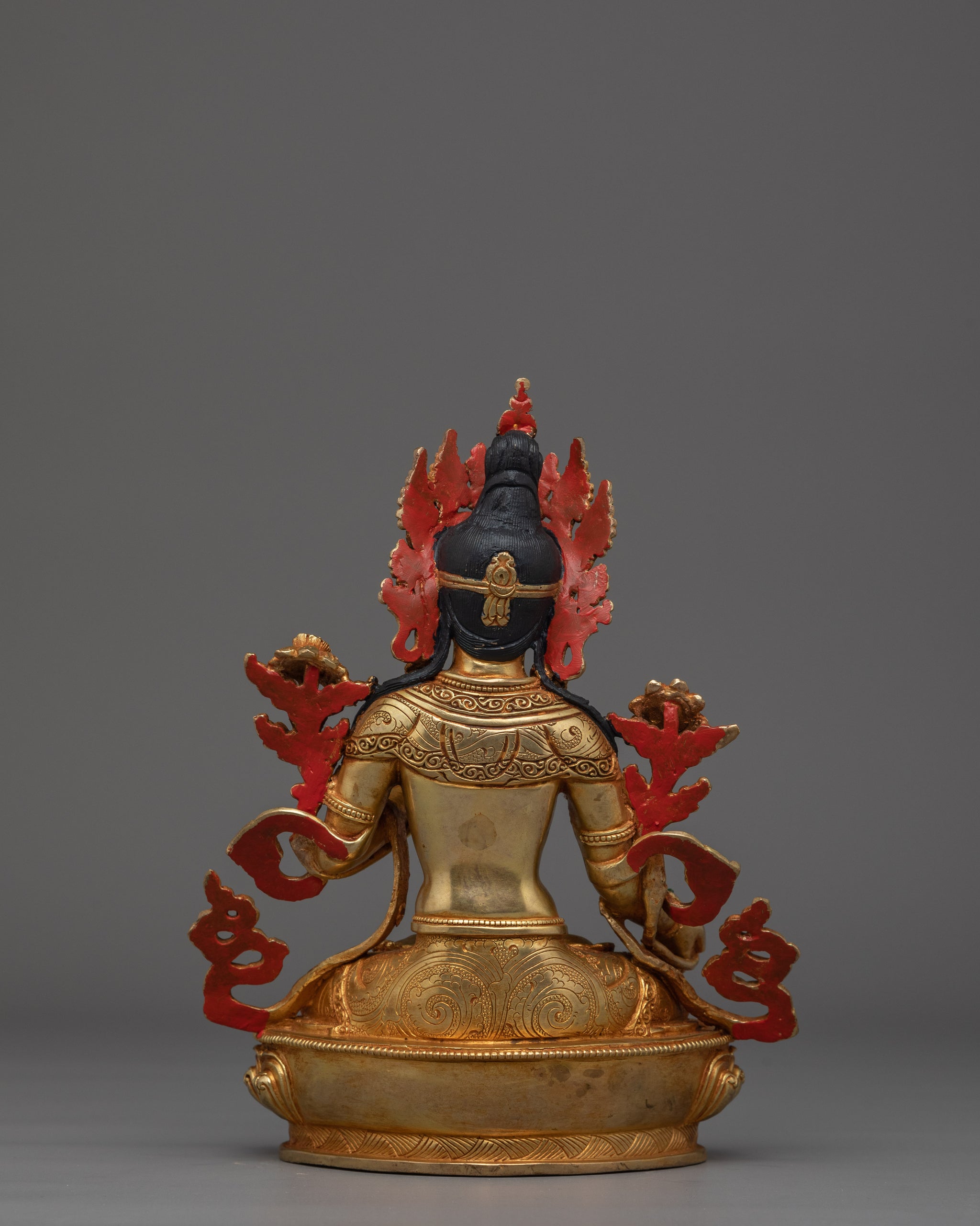 Vajrayogini is stunning. The details are amazing. It's easy to make out her facial expressions, skulls, feet, and the ring of fire around her. You can tell she's handmade. There is a consecration hole in her back.