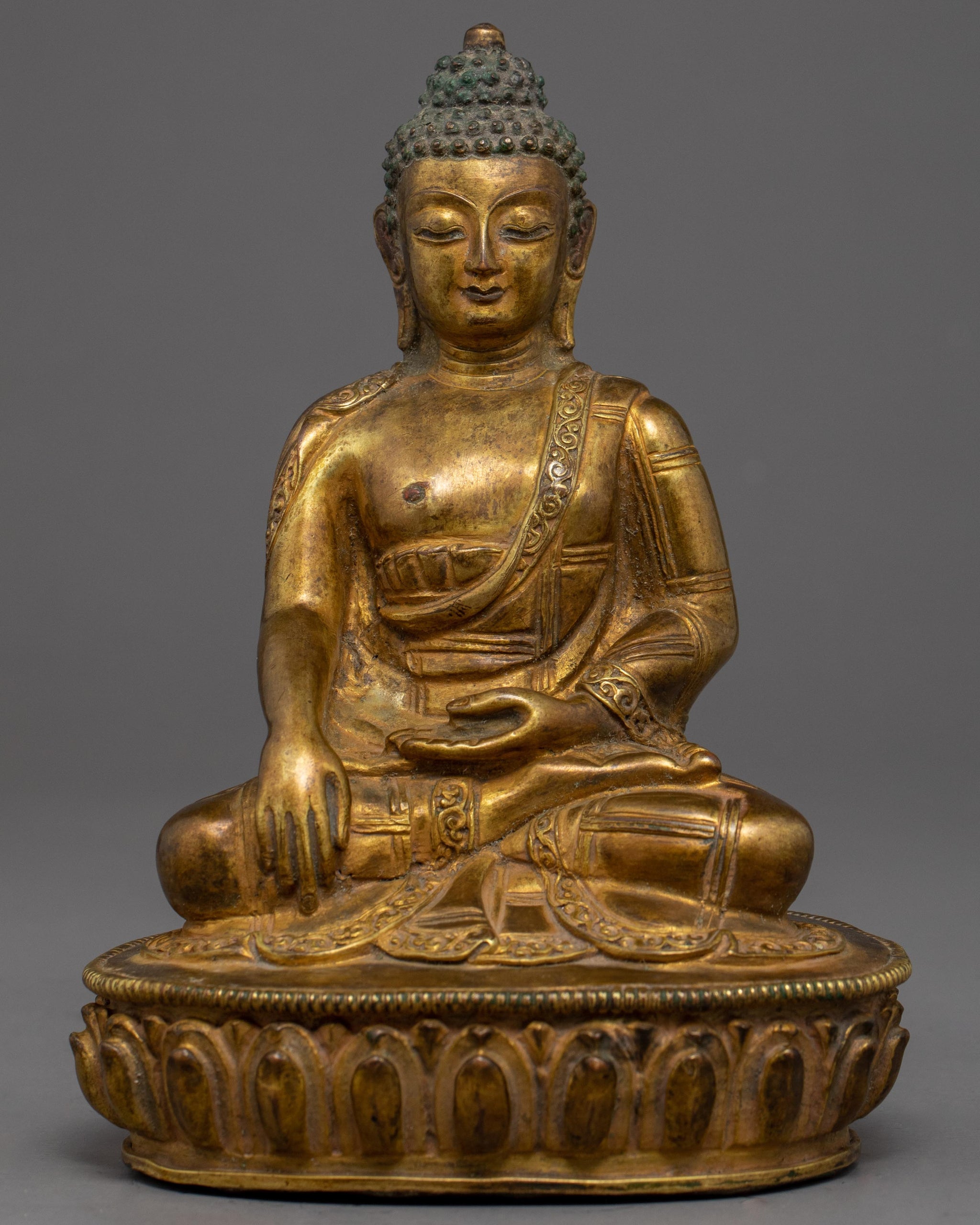 Traditionally crafted the representation of the historical Buddha Shakyamuni with a unique antique design given by the artists of Nepal. Made from a sheet of copper gilded with 24k genuine gold and finely painted with acrylic paint, the antique finish is highlighting the intricate design of the statue. The deity is shown with his right hand extended to the earth in the witness gesture known as the Bhumisparsha Mudra. His ultimate triumph over the temptations and delusions of the material world, represented by the demon Mara, is being "called to witness" by the earth. His left hand is on his lap, palm facing up (Dhyana Mudra), making a meditative gesture. You can use this figurine for different Buddhist Rituals and meditational practices.