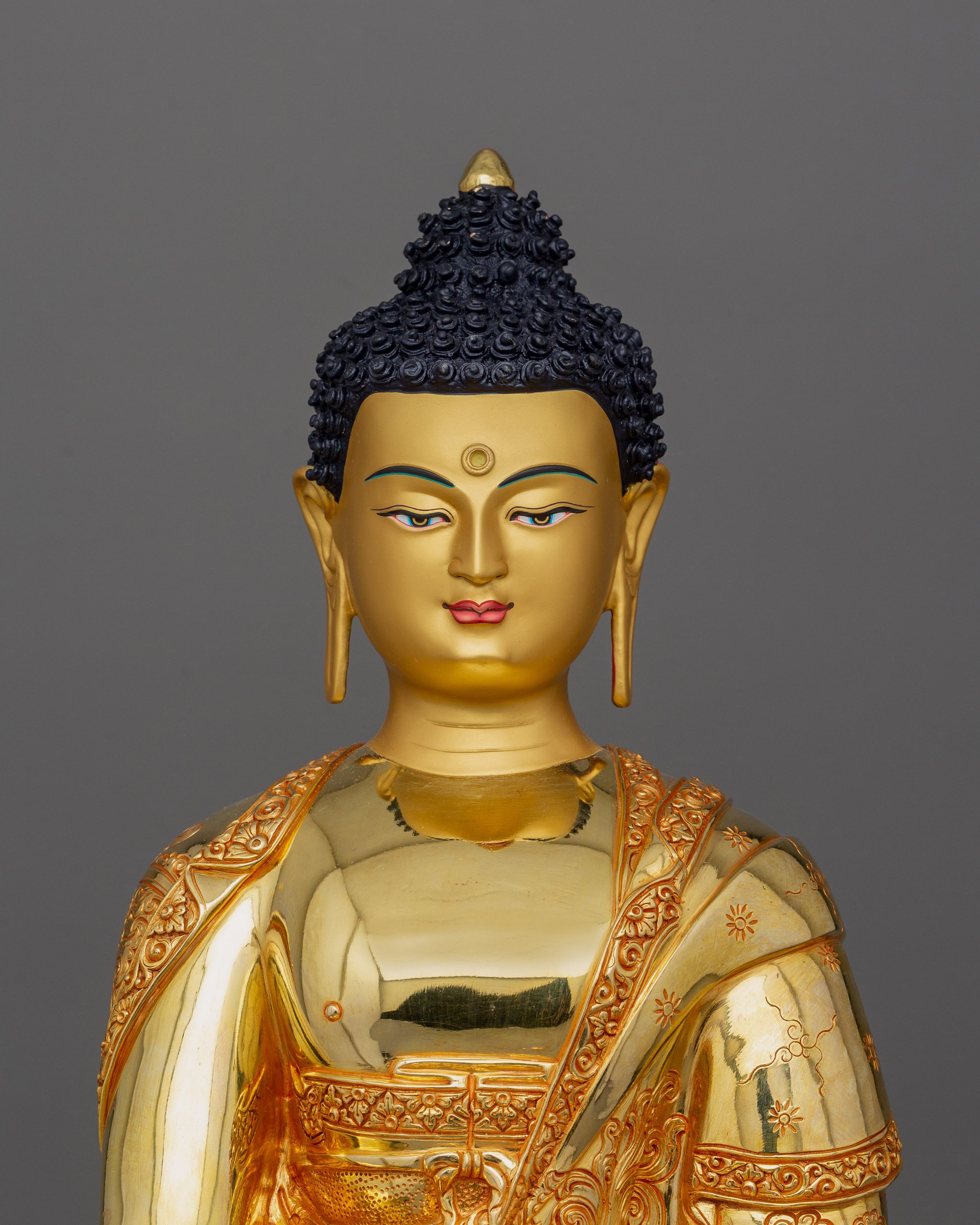 The Historical Siddhartha Gautama Figurine, standing at a 17.5” (44.5cm) in height with a base width of 11.8” (30cm), is a representation of spiritual grace and artistic mastery. Crafted from a durable Copper Body, it is adorned with triple layer 24K Gold Gilding and detailed with Gold and Acrylic Paintings with 3D-like carvings. This statue captures the serene presence of Shakyamuni Buddha, symbolizing enlightenment, compassion, and peace.