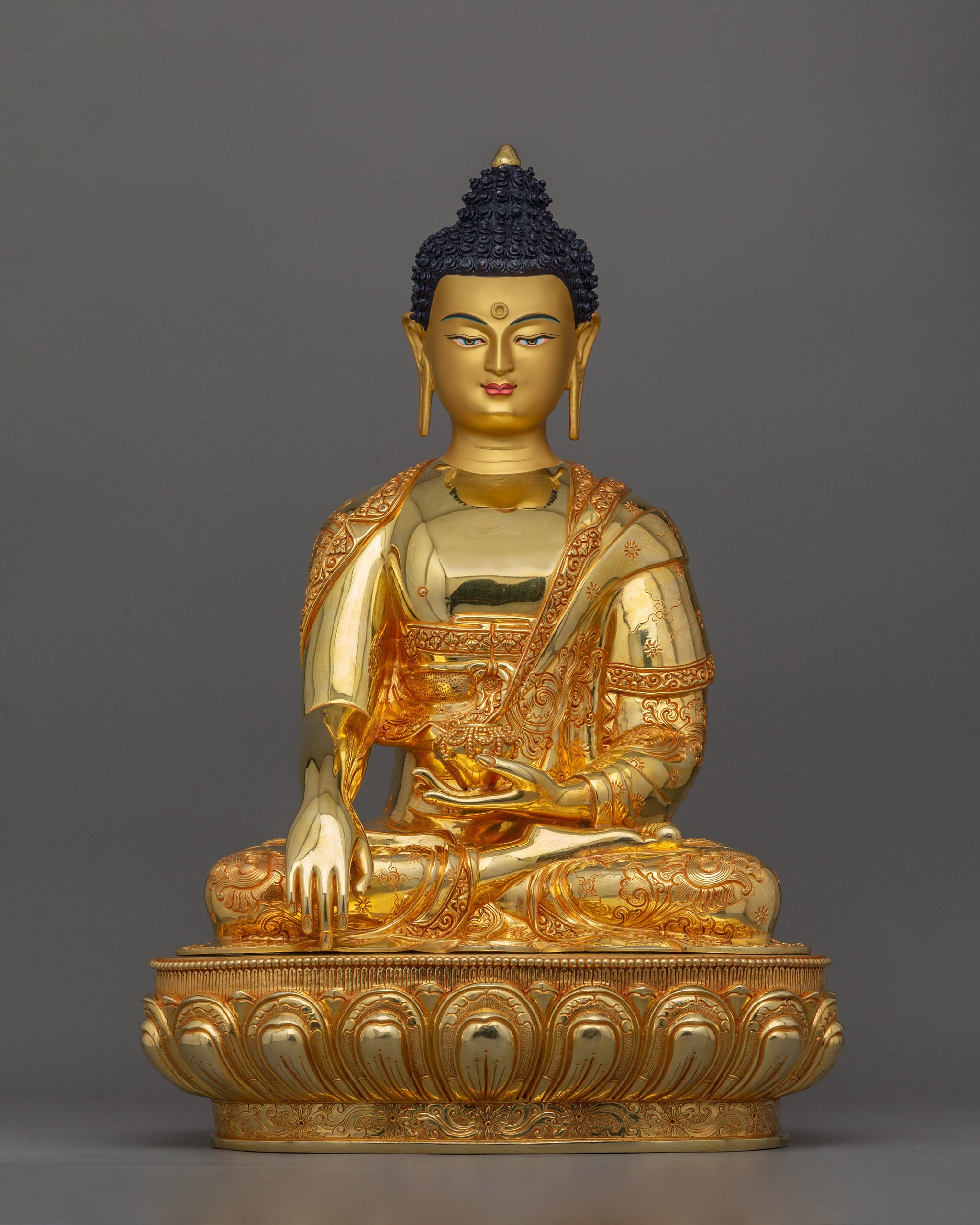 Shakyamuni Buddha is depicted sitting in the lotus pose (padmasana), indicating his steady concentration and mastery over the distractions of the material world. His right hand stretched toward the earth in bhumisparsha mudra represents his moment of enlightenment, inviting the earth to witness his waking. The left hand, lying gently in his lap in dhyana mudra, depicts the profound state of meditation and mindfulness that leads to insight and clarity.