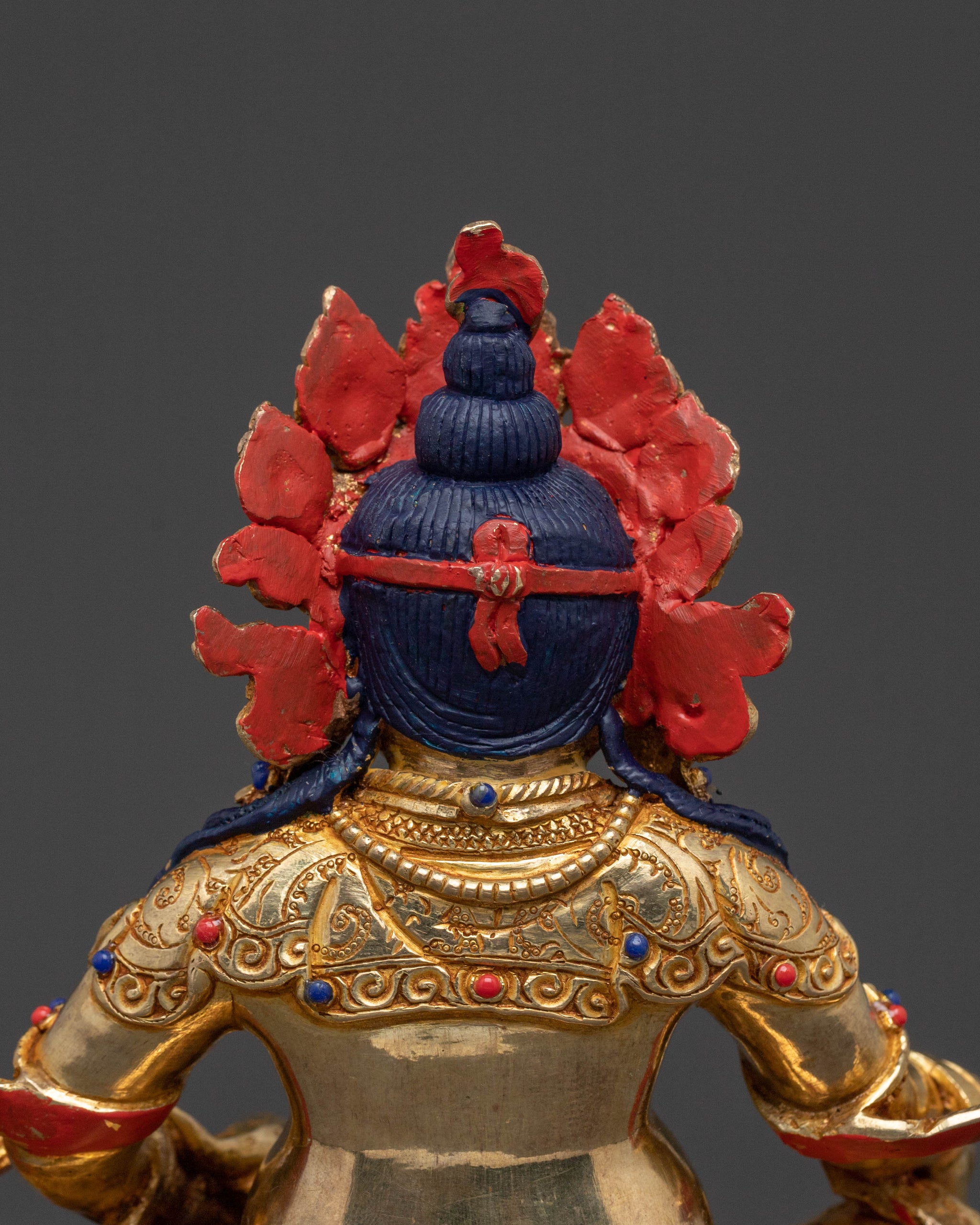 This resplendent Dzambhala statue, the Bodhisattva of Wealth, stands 7.09” (18 cm) tall with a 7.09” (18 cm) base and weighs 1.51 kg. Handcrafted in Nepal by skilled artisans, it features a solid copper body adorned with 24K gold gilding, vibrant acrylic paintings, and carefully inlaid gemstones. Radiating serenity and auspicious energy, it exemplifies authentic Himalayan craftsmanship and brings blessings of prosperity to any sacred space.